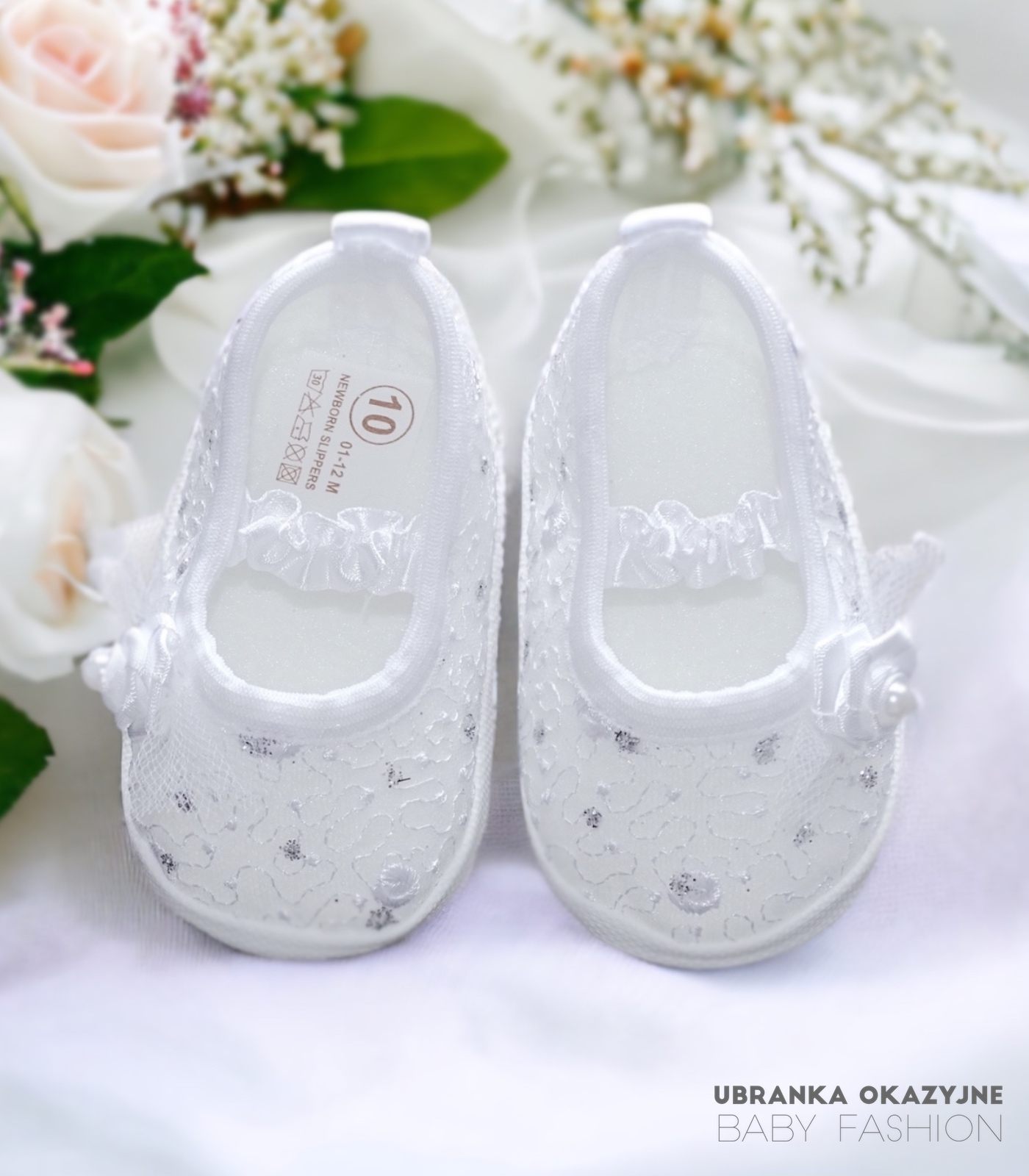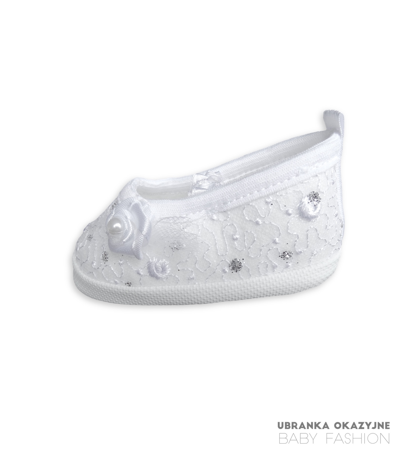 Białe balerinki z białą różyczką i perełką dla Niemowląt na Chrzciny.