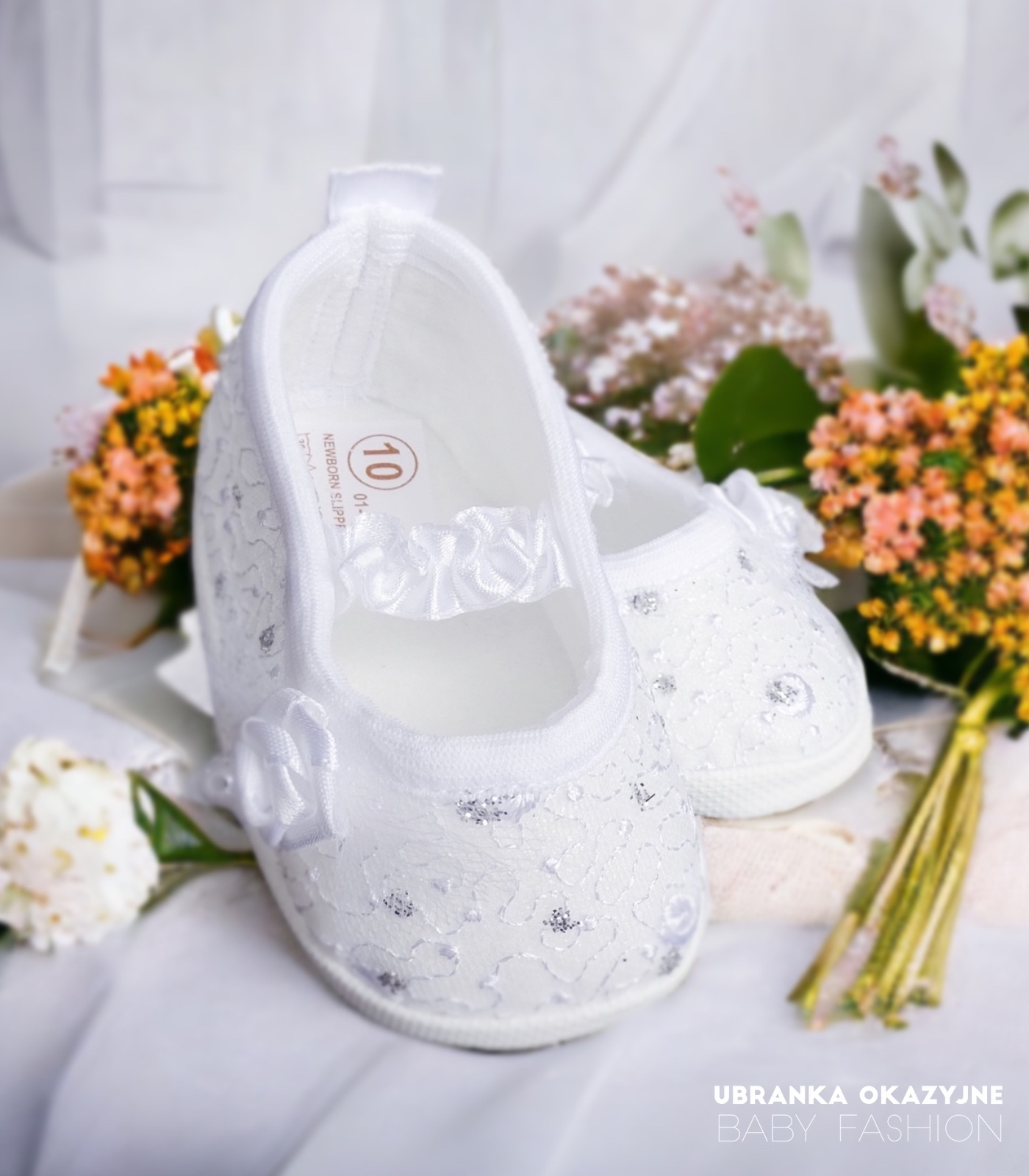 Białe atłasowe balerinki dla niemowlaka do chrztu. Wykonane z najwyższej jakości materiałów, te urocze buciki zapewniają nie tylko styl, ale także wygodę dla Twojej małej księżniczki.