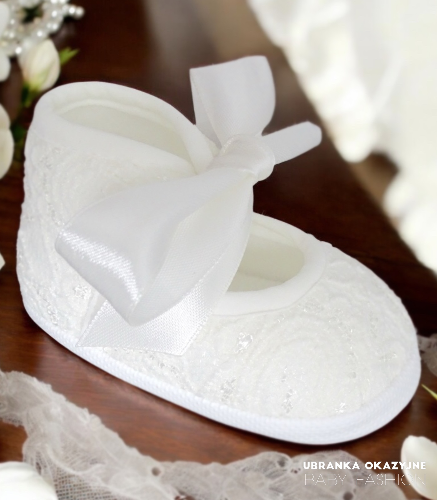 Koronkowe balerinki w kolorze ecru dla niemowlaka do chrztu.Wykonane z najwyższej jakości materiałów, te urocze buciki zapewniają nie tylko styl, ale także wygodę dla Twojej maleńkiej.