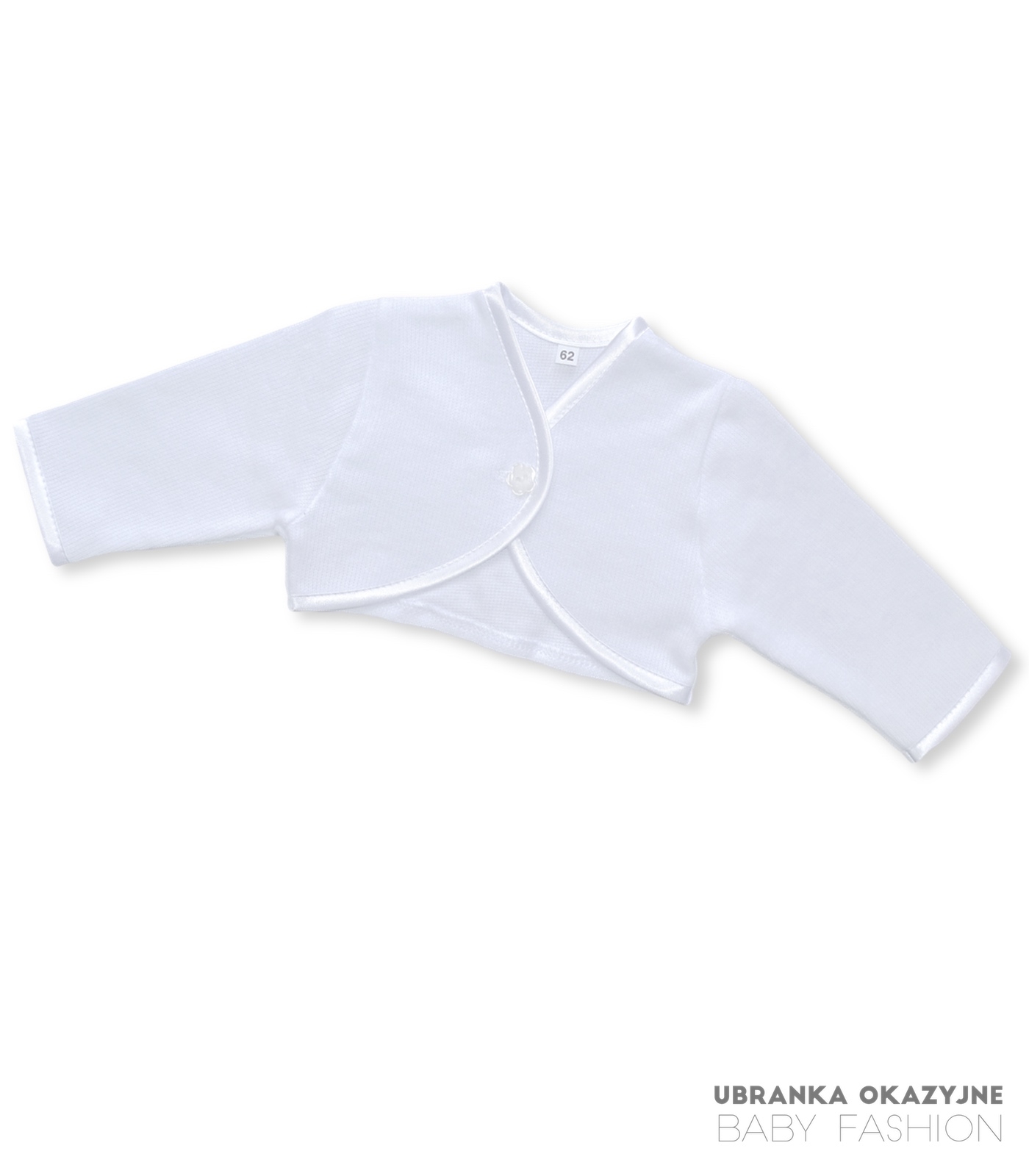 Eleganckie, gładkie bolerko w kolorze białym, które doskonale uzupełni strój Twojej córeczki w dniu Chrztu Świętego. Zapinane na jeden ozdobny guzik, zapewnia ciepło i nie zasłania uroku sukienki. Uszyte w Polsce z wysokiej jakości materiałów bezpiecznych dla niemowląt. Dostępne w pełnej rozmiarówce: 62, 68, 74, 80, 86.
