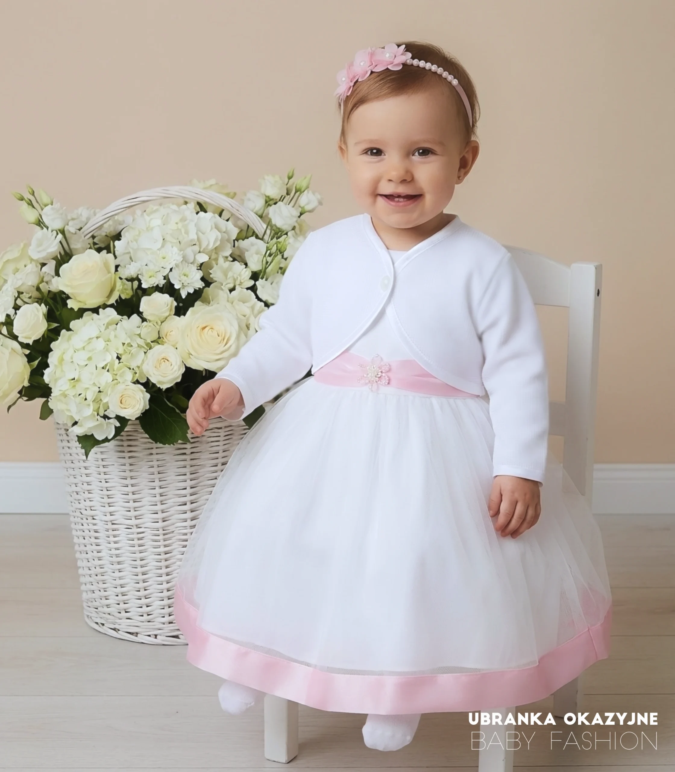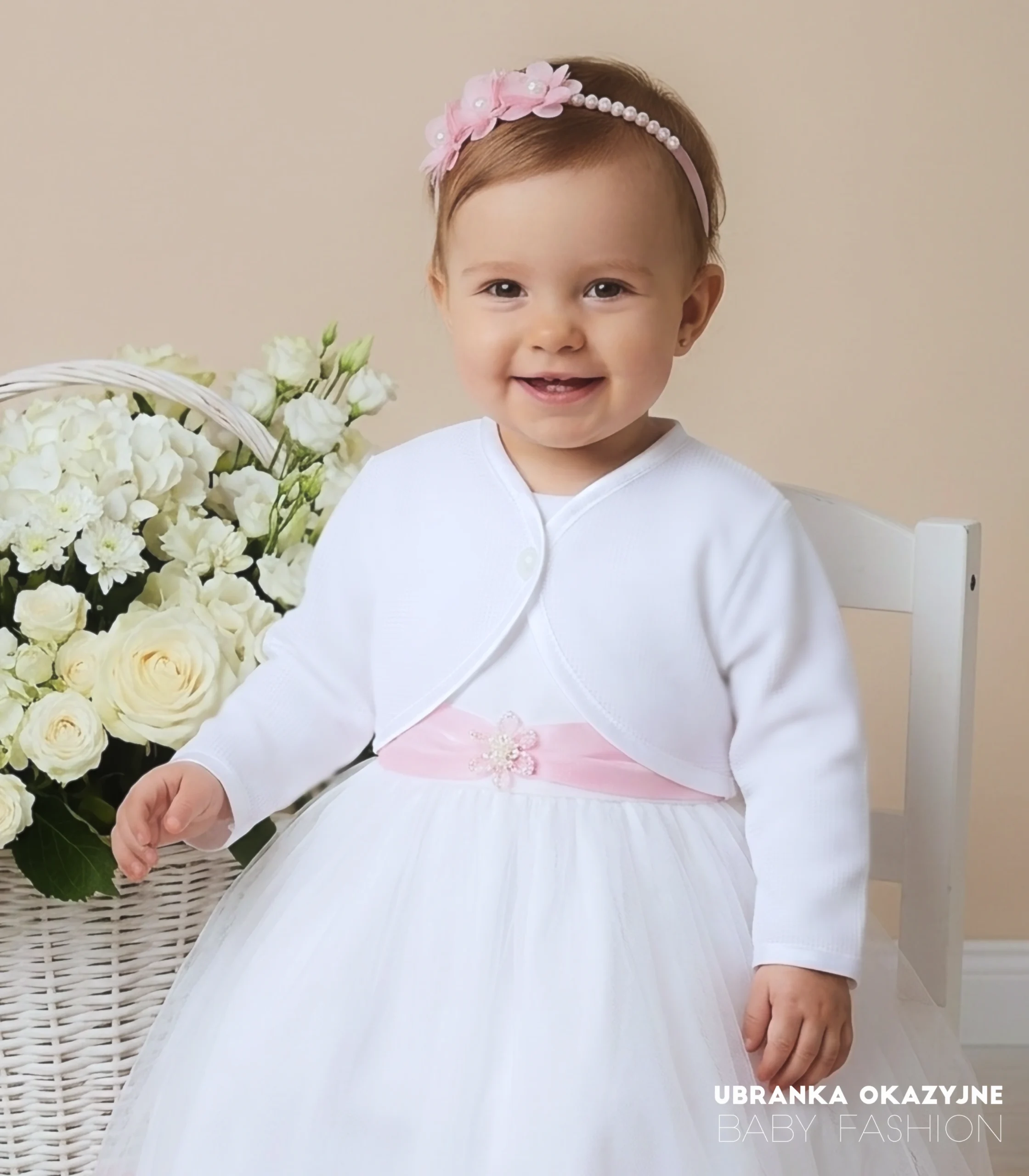 Szukasz subtelnego i eleganckiego dodatku, który dopełni stylizację Twojej córeczki w dniu jej święta, ale jej nie przytłoczy? Nasze białe, gładkie bolerko to idealny wybór na chrzest, roczek czy wesele. To uniwersalne okrycie wierzchnie, które zapewni maluszkowi ciepło i komfort, jednocześnie pięknie komponując się z każdą sukienką wizytową.