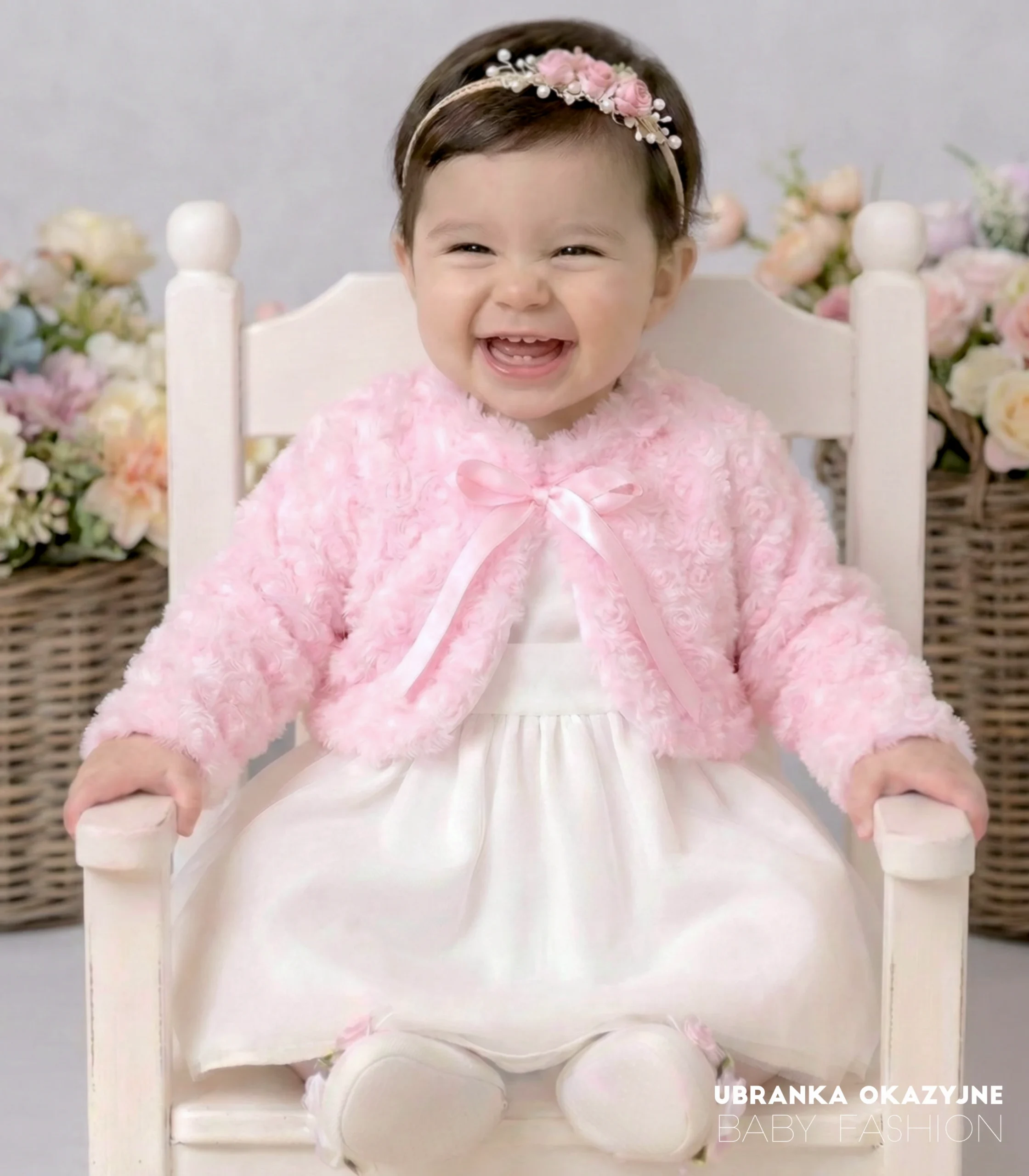 Kontrastowy akcent: Kolor delikatnego różu wspaniale ożywia klasyczną, białą sukienkę do chrztu, tworząc modną i dziewczęcą stylizację.