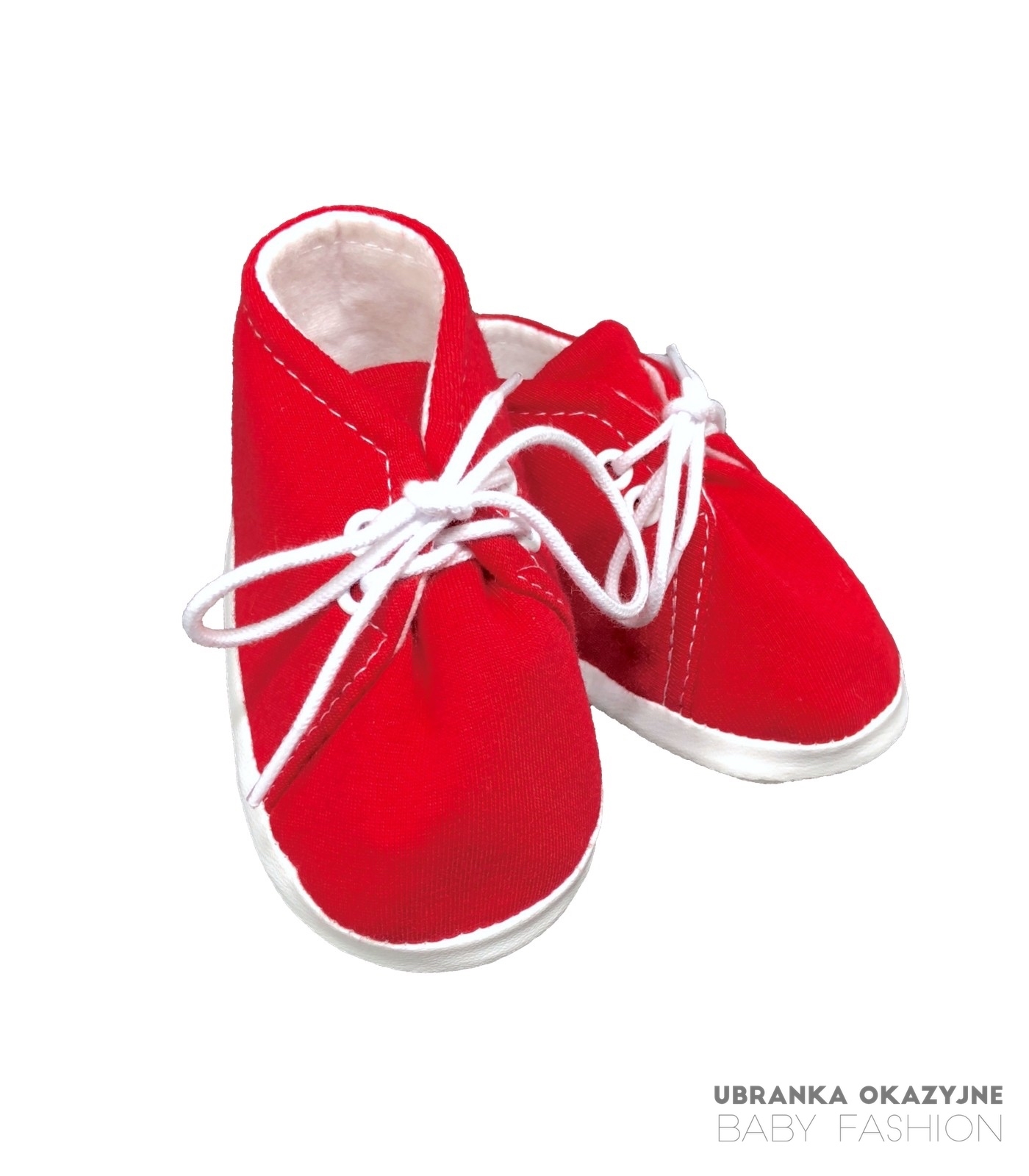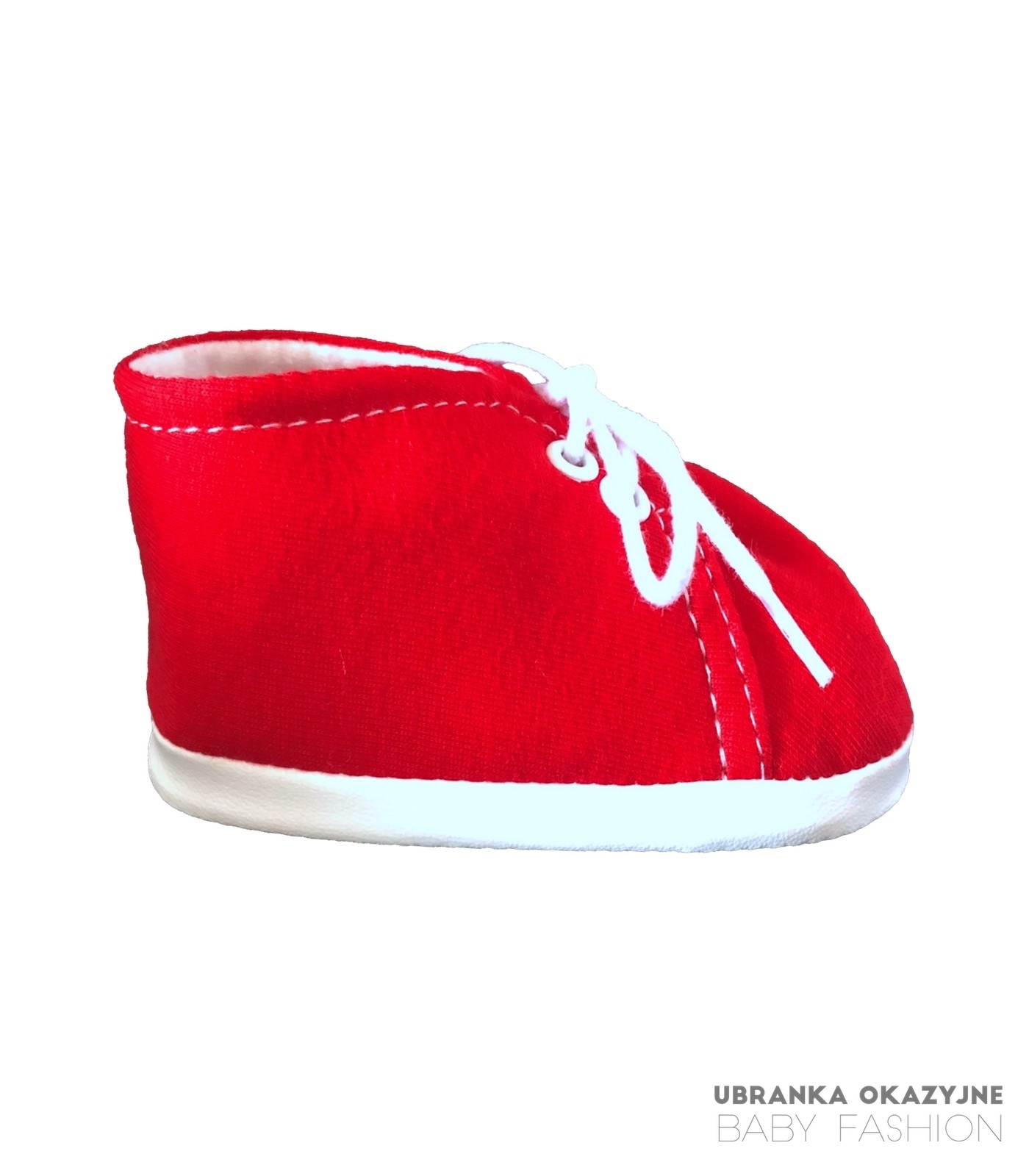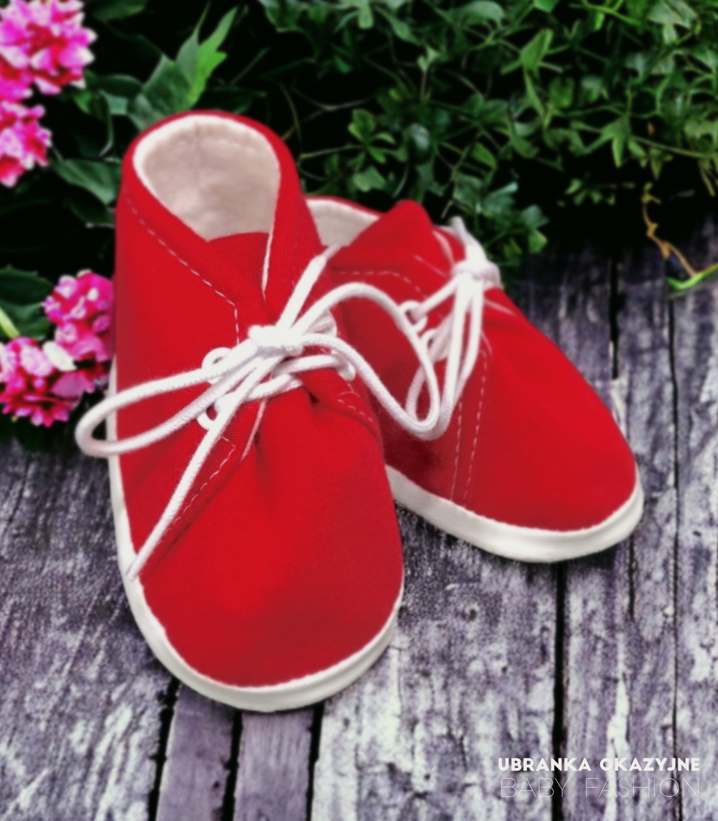 Bawełniane buciki niechodki dla dziecka w kolorze czerwonym wiązane na białe sznurówki. Buciki są polskiej produkcji i są dostępne w czterech rozmiarach: 9 cm , 10 cm , 11 cm i 12 cm . Skład materiałowy bucików to 80% bawełna 20% poliester. Buciki są bardzo miękkie i bardzo łatwo zakładają się na nóżkę dziecka. Idealne na na codzień jak i zarówno buciki do chrztu.
