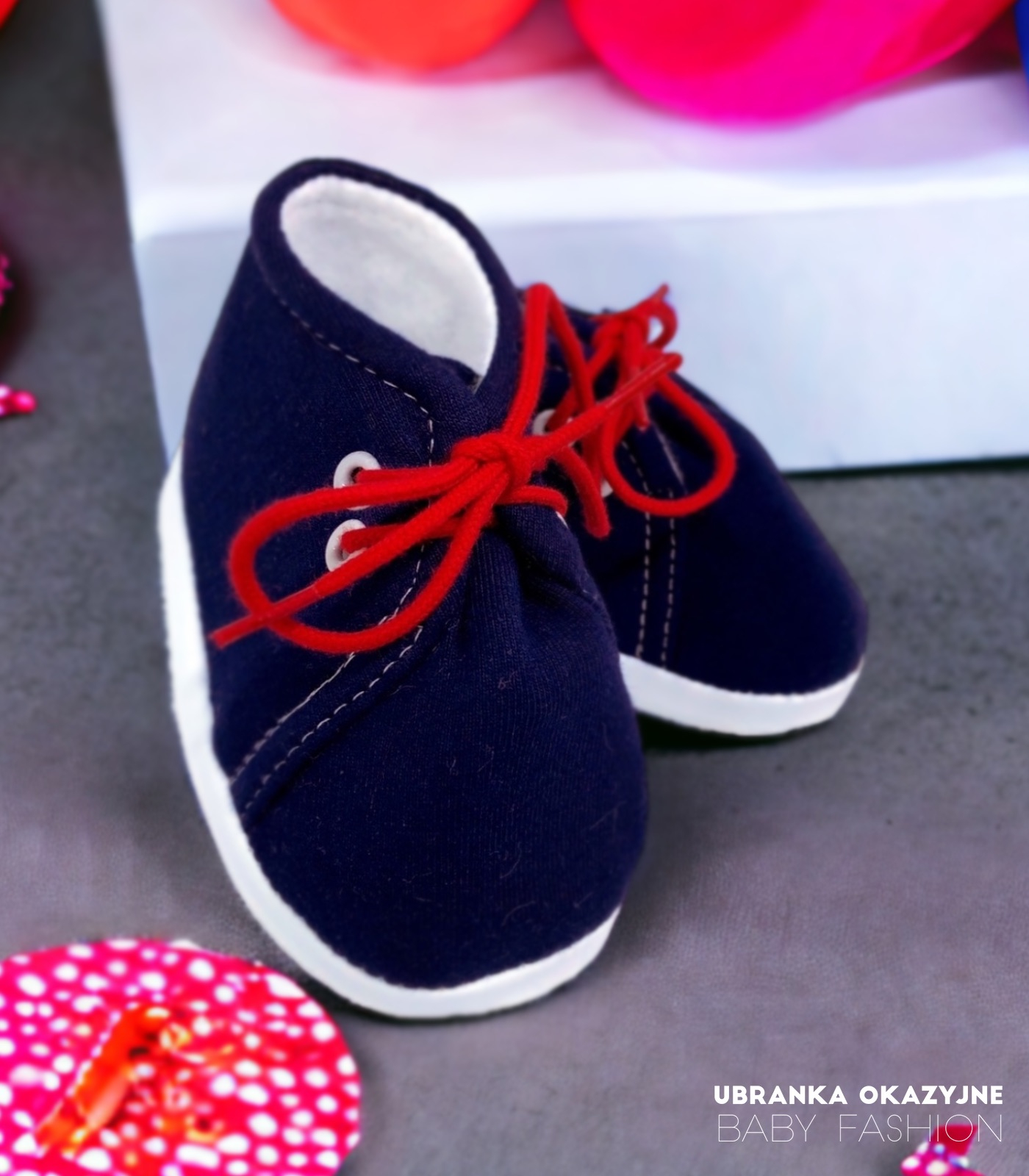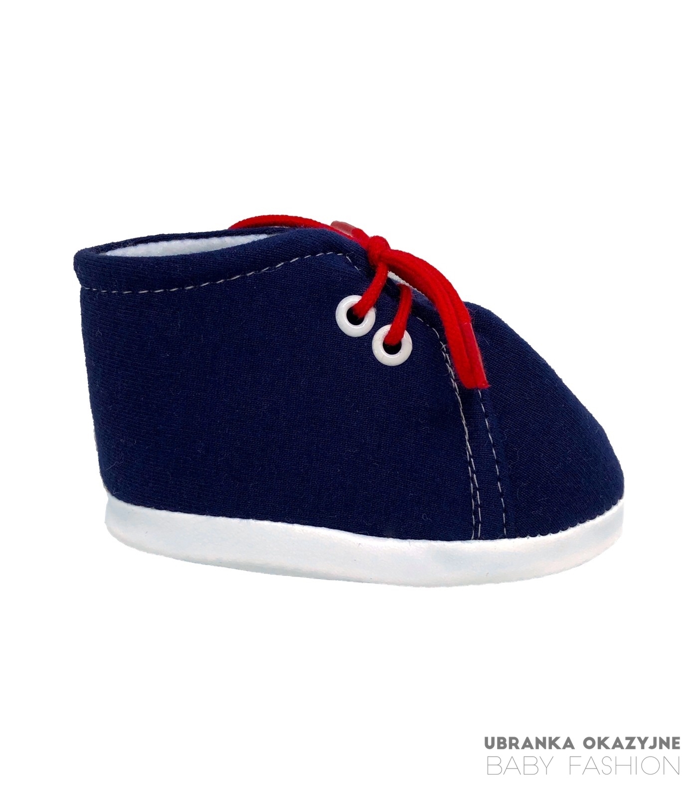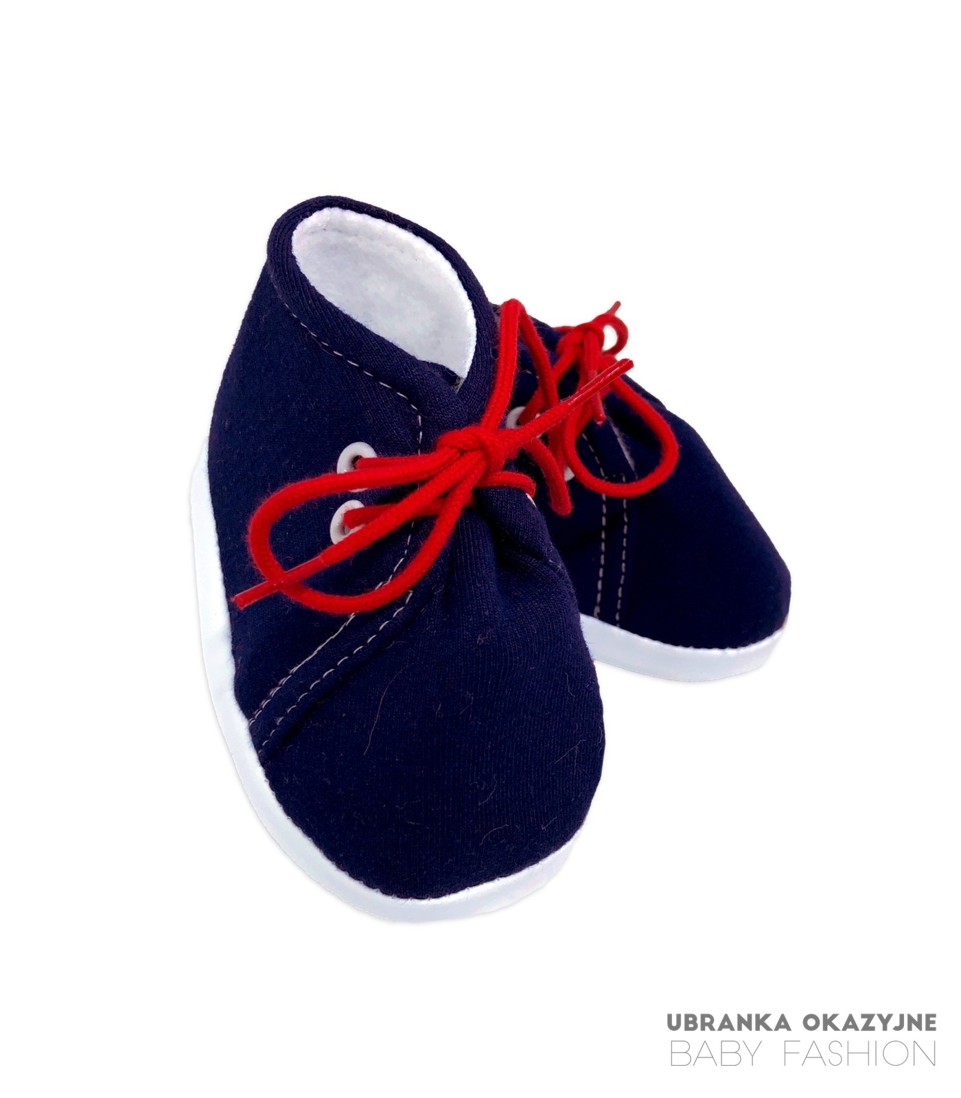 Bawełniane buciki niechodki dla dziecka w kolorze granatowym wiązane na czerwone sznurówki. Buciki są polskiej produkcji i są dostępne w czterech rozmiarach: 9 cm , 10 cm , 11 cm i 12 cm . Skład materiałowy bucików to 80% bawełna 20% poliester. Buciki są bardzo miękkie i bardzo łatwo zakładają się na nóżkę dziecka. Idealne na na codzień jak i zarówno buciki do chrztu.