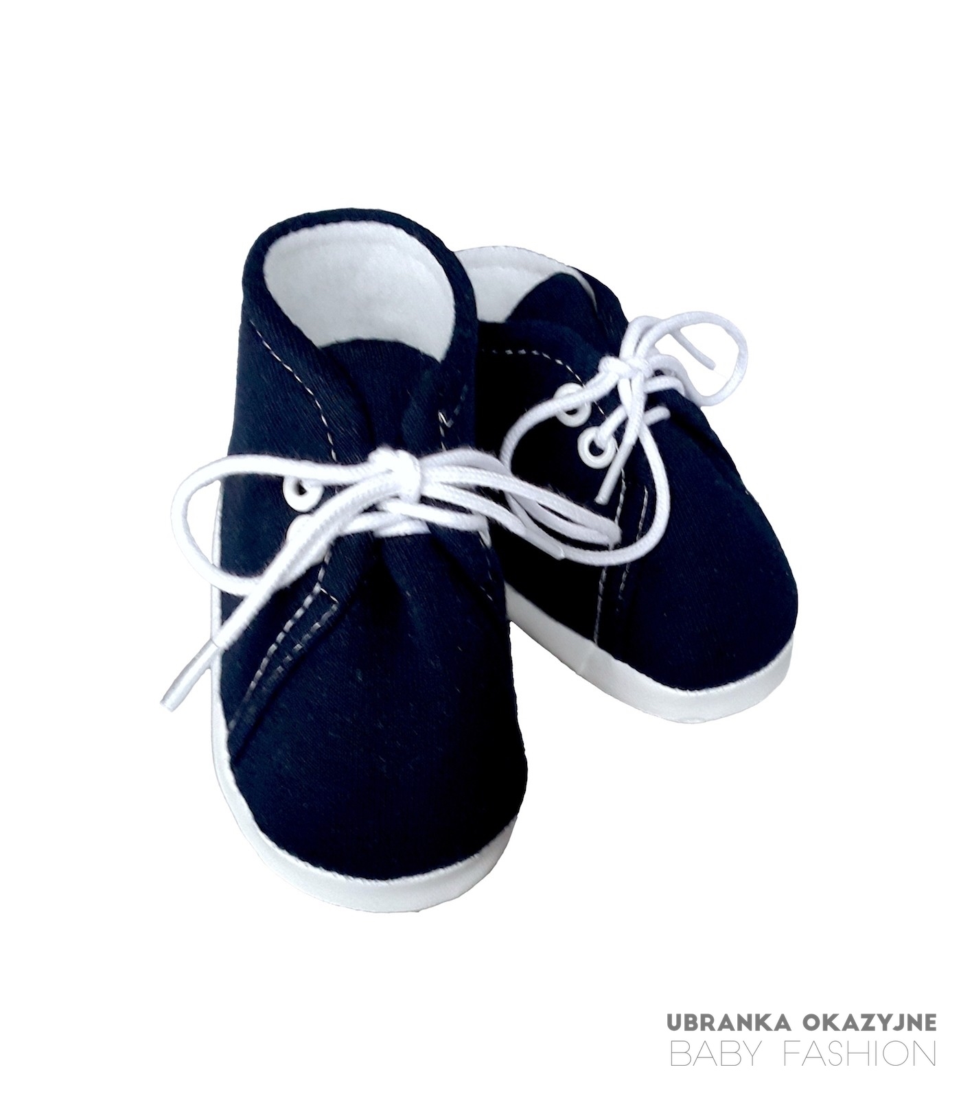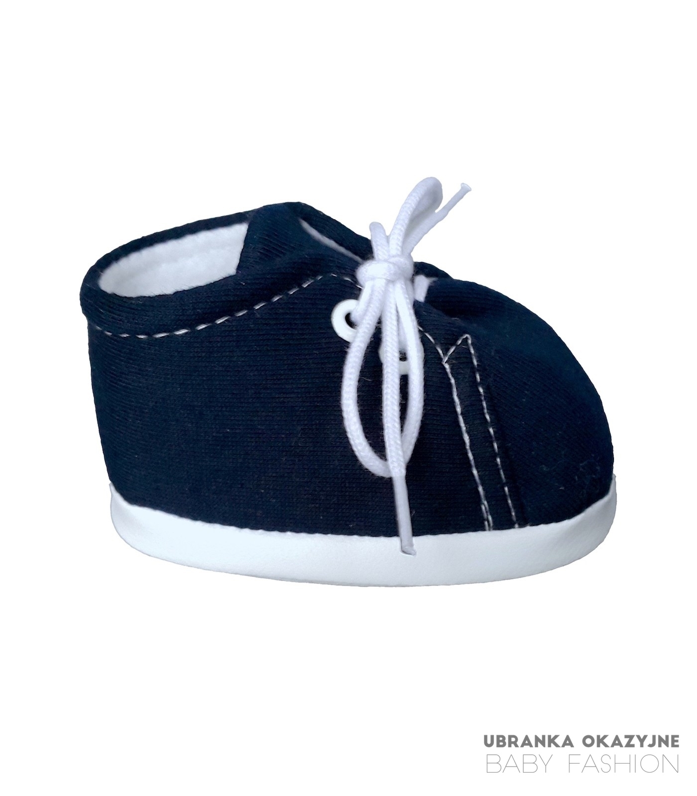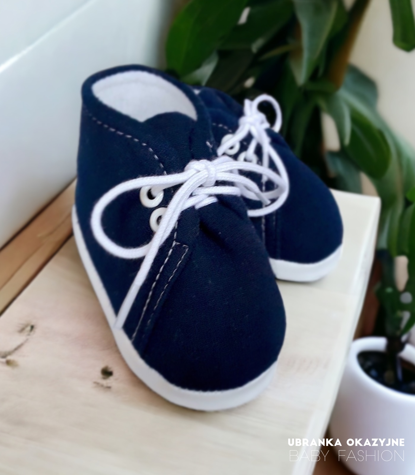 Bawełniane buciki niechodki dla dziecka w kolorze granatowym wiązane na białe sznurówki. Buciki są polskiej produkcji i są dostępne w czterech rozmiarach: 9 cm , 10 cm , 11 cm i 12 cm . Skład materiałowy bucików to 80% bawełna 20% poliester. Buciki są bardzo miękkie i bardzo łatwo zakładają się na nóżkę dziecka. Idealne na na codzień jak i zarówno buciki do chrztu.