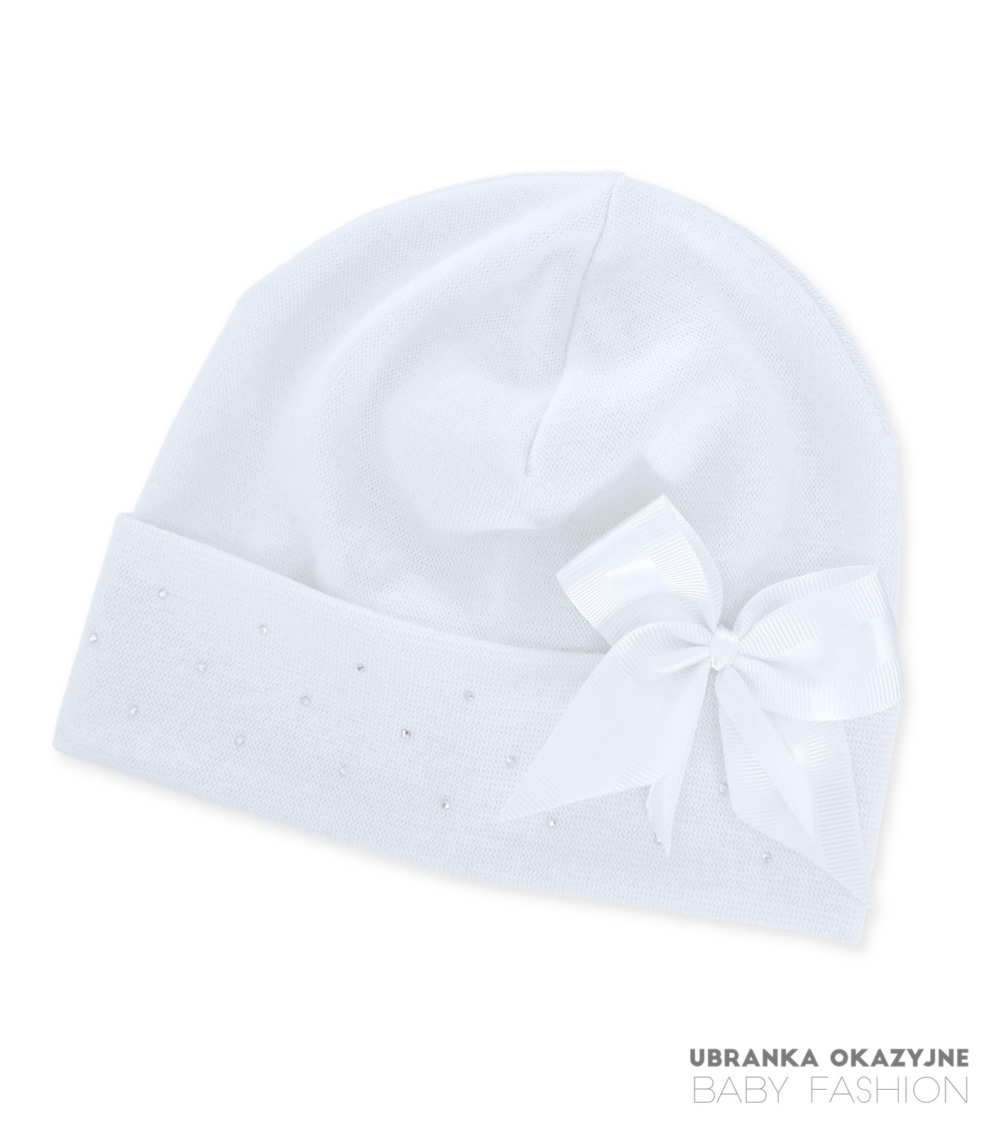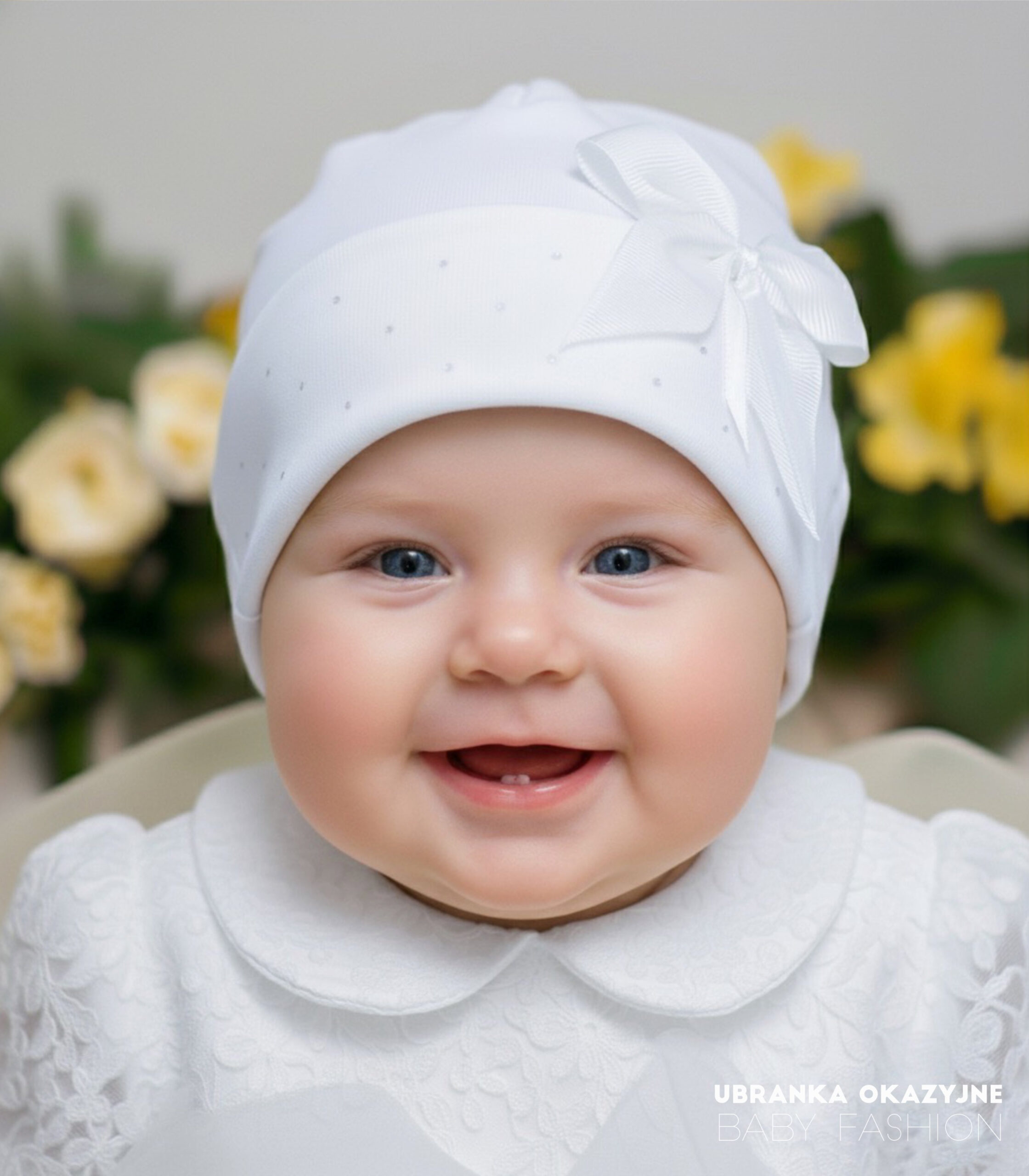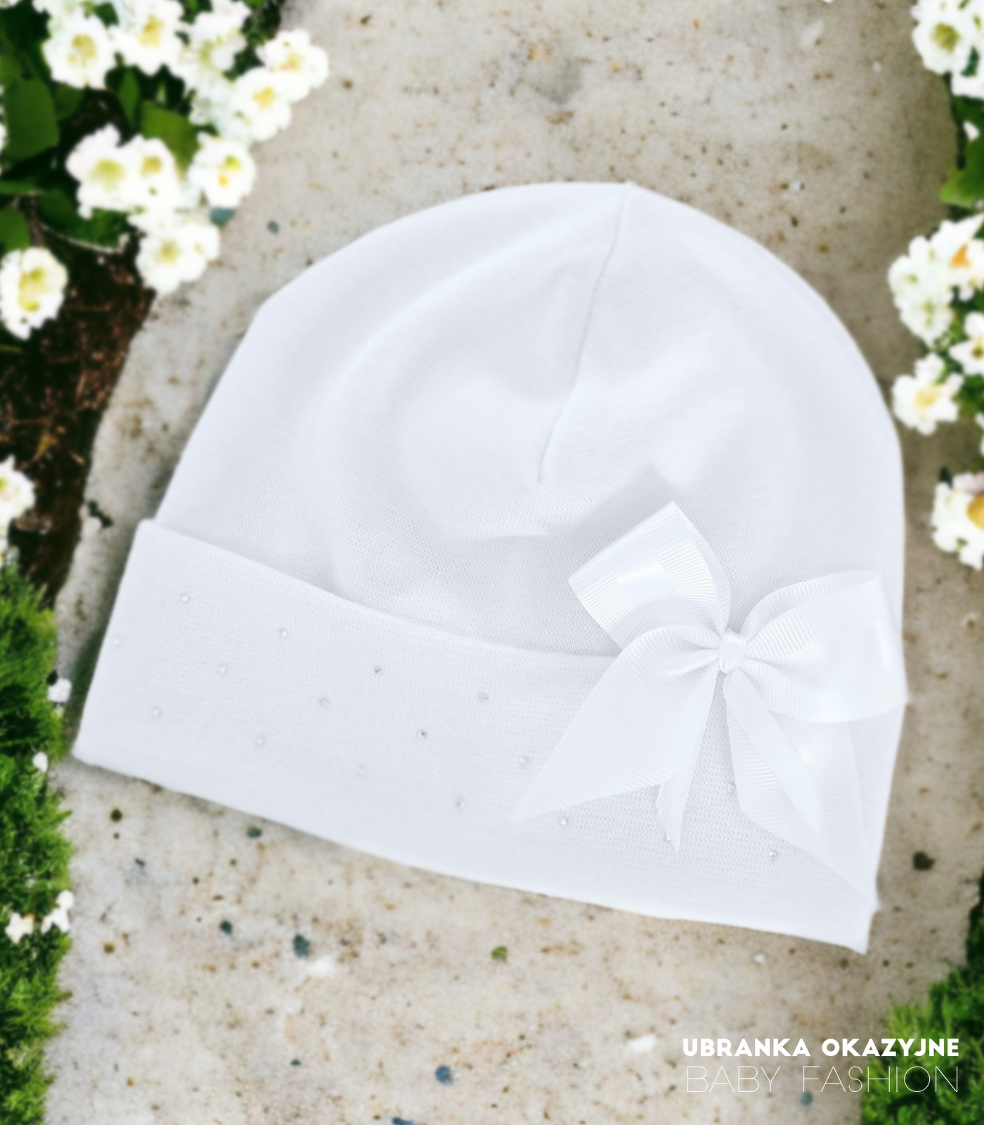 Elegancka biała czapeczka z kokardką i cekinami dla małej księżniczki