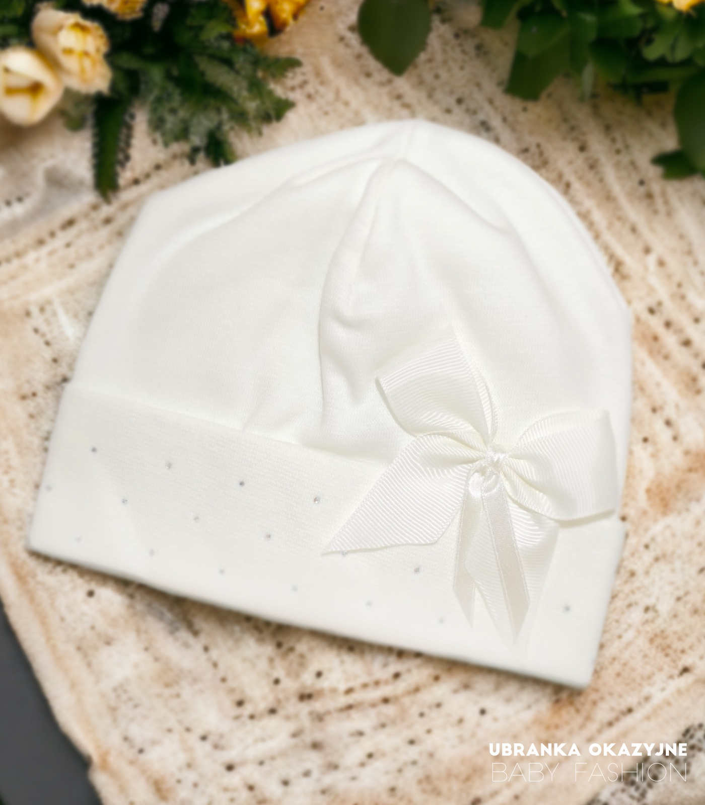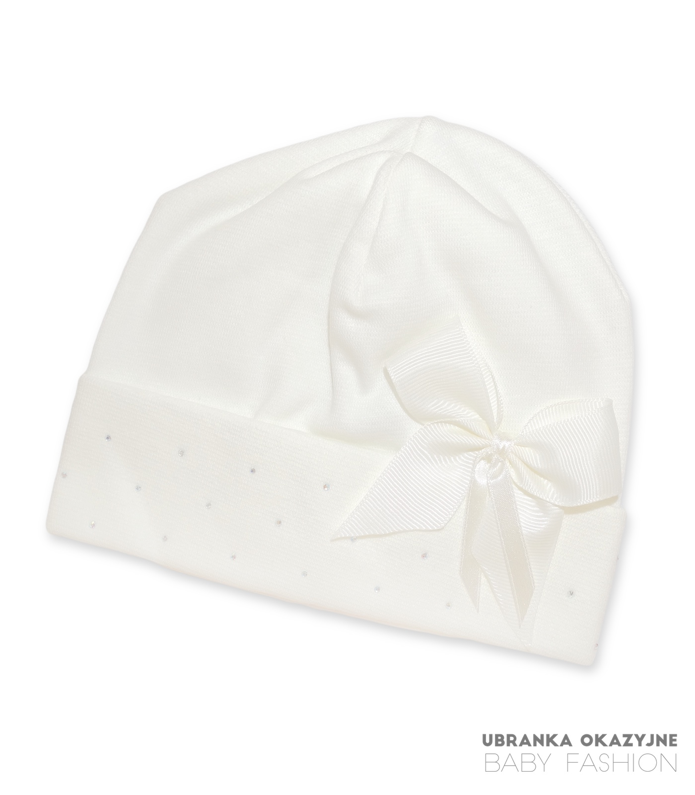Elegancka bawełniana czapeczka z kokardką i cekinami w kolorze ecru