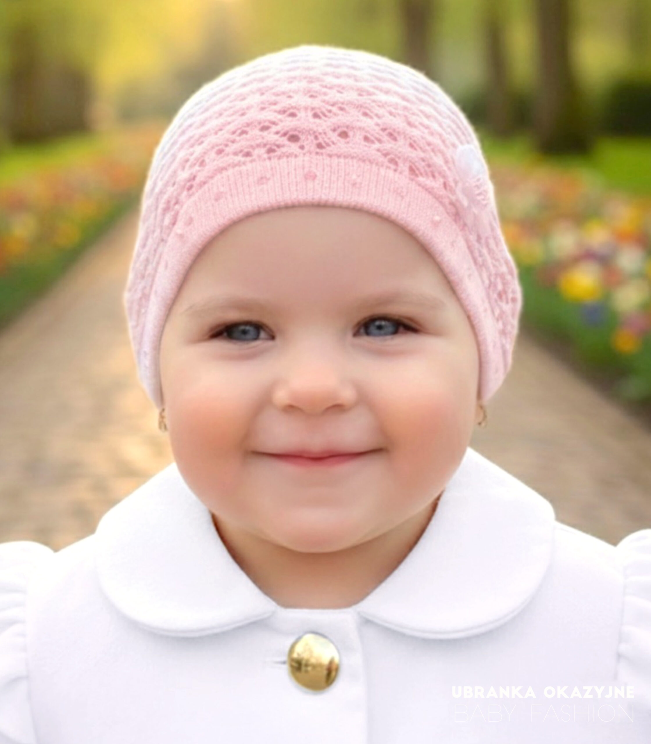 Idealna do Chrztu: Choć biel jest klasykiem, pastelowy róż to najmodniejszy trend w modzie chrzcielnej. Czapeczka pięknie kontrastuje z białym płaszczykiem lub sukienką, ożywiając stylizację.