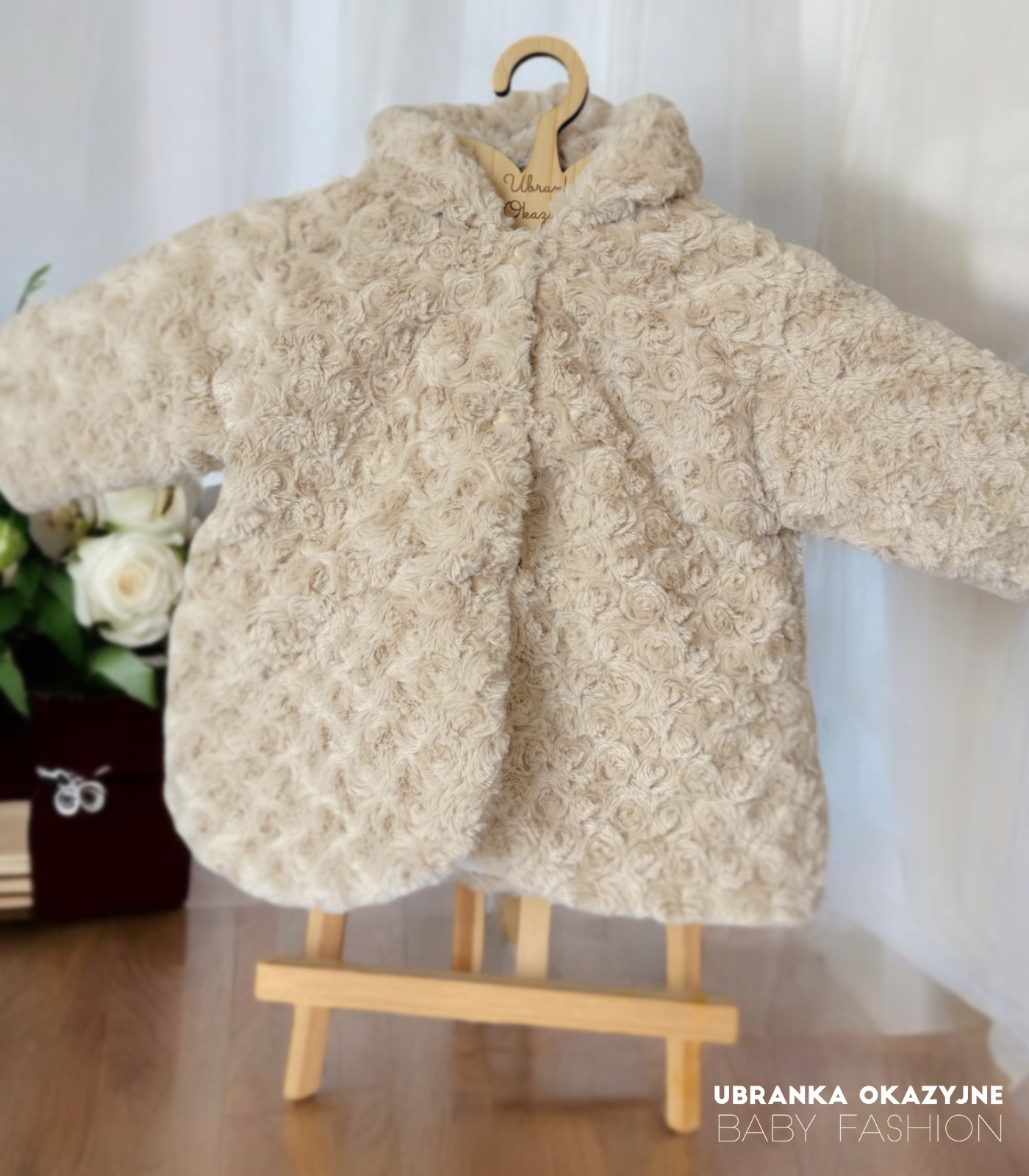 Odkryj wyjątkowe futerko do chrztu dla małych elegantek – elegancki płaszczyk w delikatnym beżowym kolorze z uroczym kapturem. To doskonały element garderoby, który doda wdzięku każdej stylizacji Twojej małej księżniczki. Wykonany z miękkiego futerka, zapewnia nie tylko szykowny wygląd, ale także niezwykły komfort. Dostępny w rozmiarach 62, 68, 74 i 80. Bez względu na okazję, ten płaszczyk sprawi, że Twoja mała księżniczka będzie olśniewać i czuć się wyjątkowo.