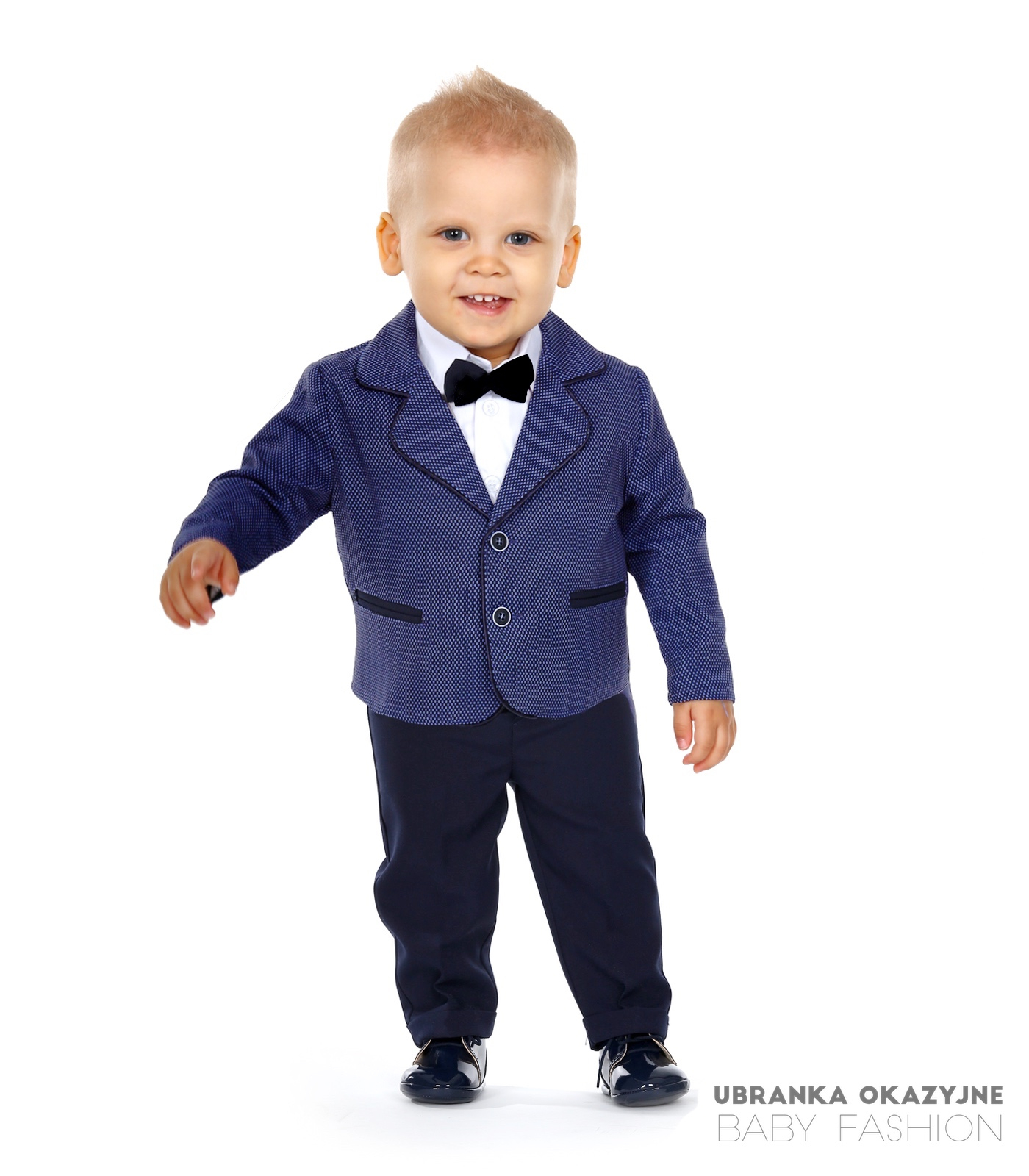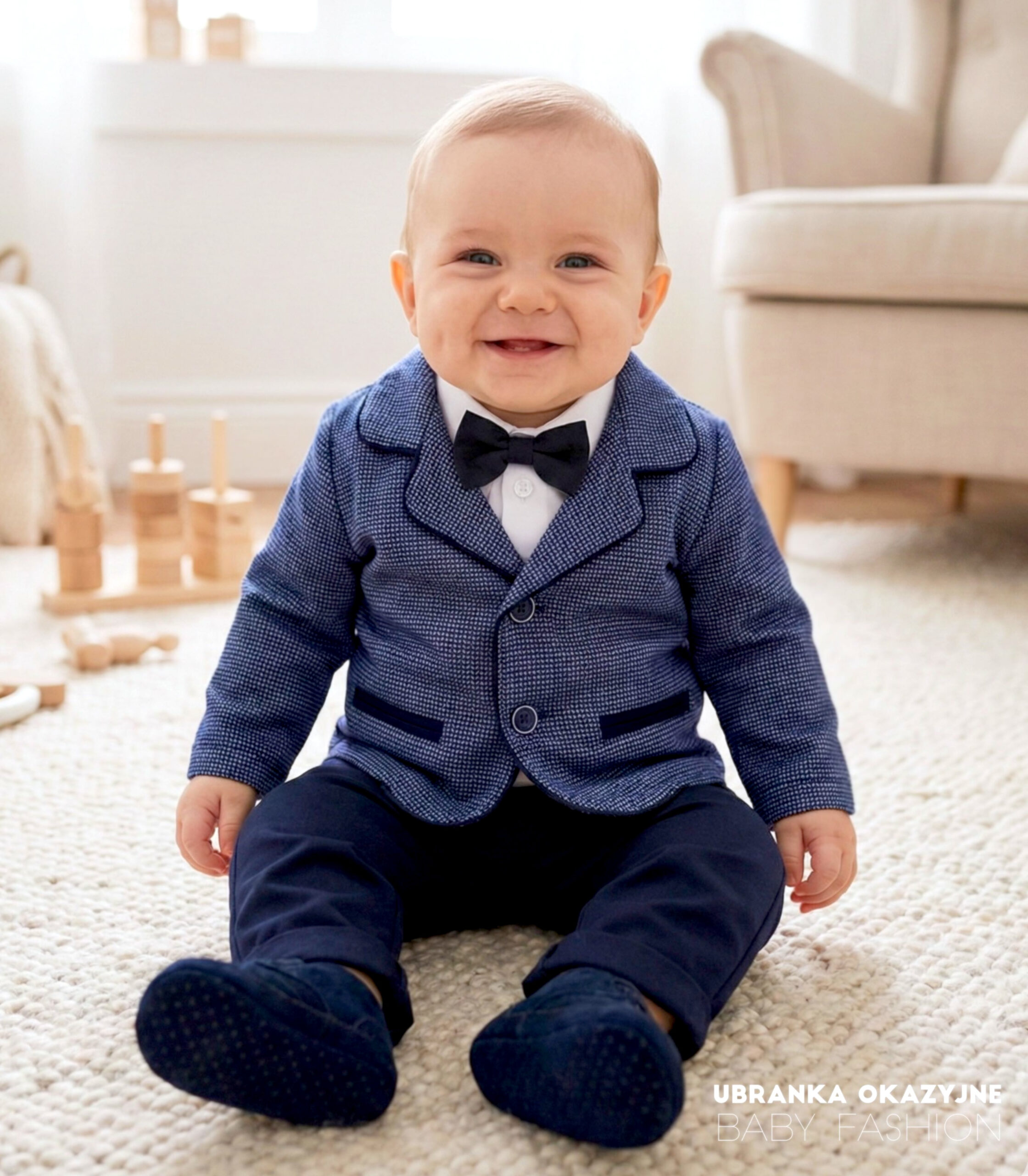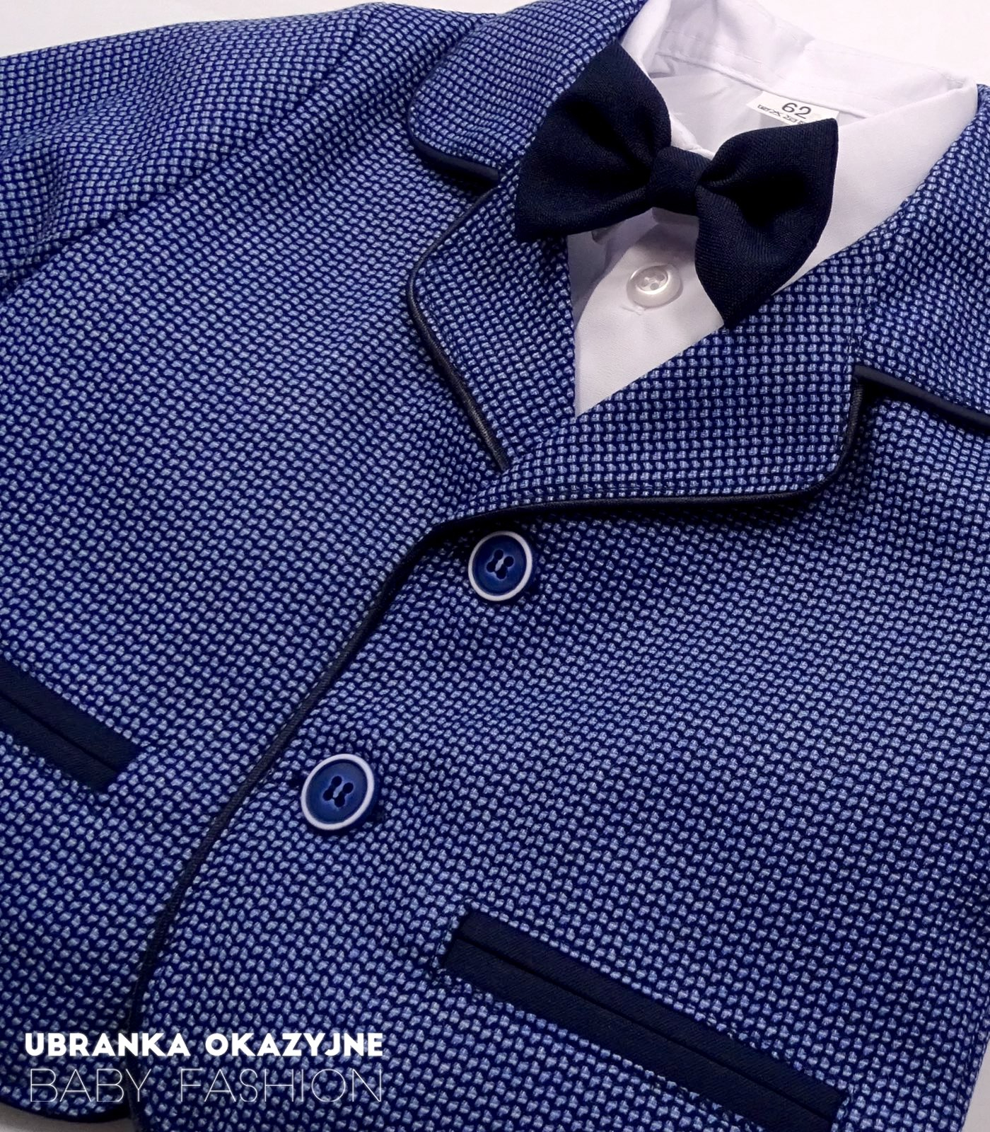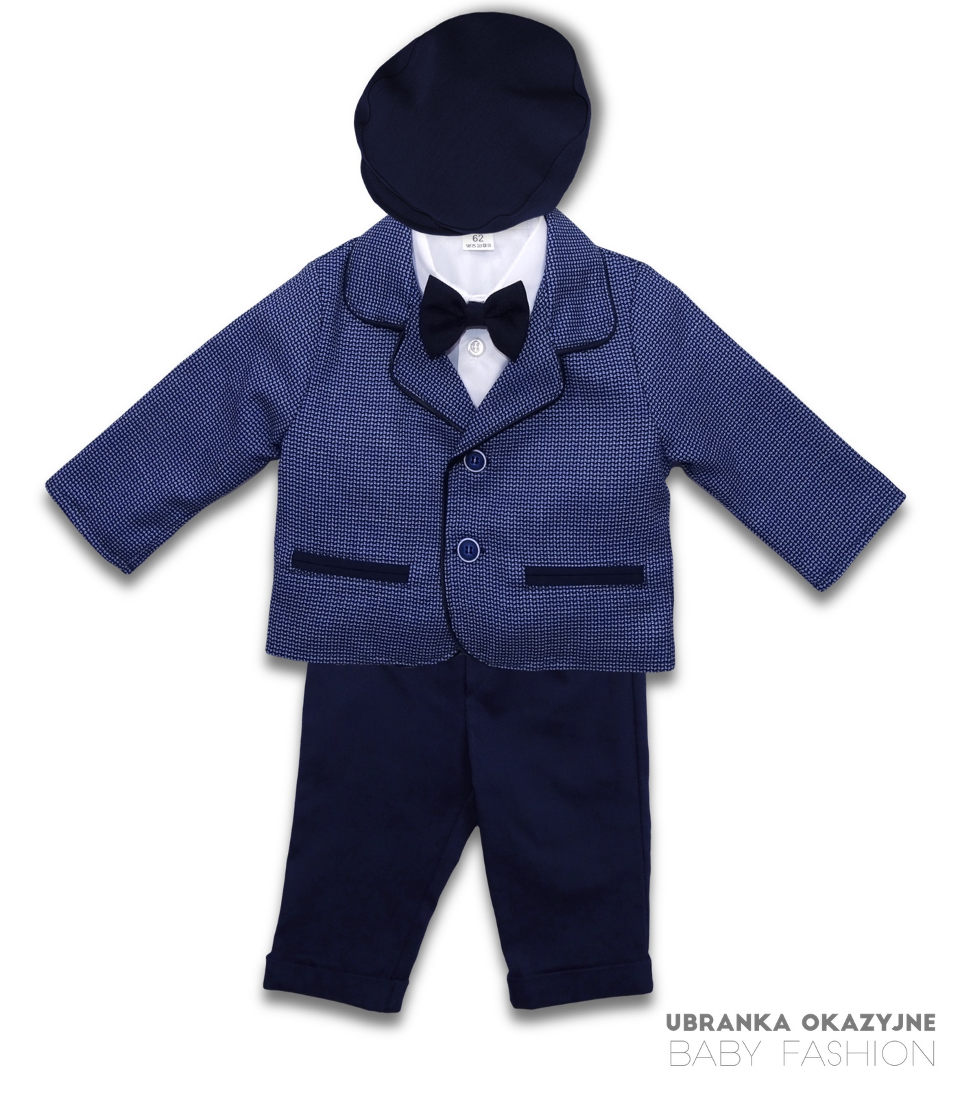 Przedstawiamy wyjątkowy garniturek do chrztu dla niemowlaka, który zapewni Twojemu maluchowi elegancki i stylowy wygląd podczas tej ważnej ceremonii. Nasz garniturek składa się z marynarki w niebieską pepitkę, granatowych spodni, białego koszulo-body, muszki w kolorze granatowym oraz kaszkietu również w kolorze granatowym. Dostępny w rozmiarach 62, 68, 74, 80, 86, nasz produkt jest dopasowany do potrzeb rosnącego niemowlaka, zapewniając mu maksymalny komfort i swobodę ruchów. Marynarka w piękną niebieską pepitkę jest starannie wykonana z wysokiej jakości materiałów, zapewniając trwałość i wygodę noszenia. Granatowe spodnie dodają elegancji i klasy, podkreślając uroczysty charakter ceremonii chrztu. Białe koszulo-body wykonane z delikatnej tkaniny zapewniającej komfort skóry dziecka. Muszka oraz kaszkiet w kolorze granatowym doskonale komponują się z resztą garnituru, tworząc spójny i wyjątkowy wygląd. Dzięki naszemu bogatemu wyborowi rozmiarów, od 62 do 86, masz pewność, że znajdziesz idealne dopasowanie dla swojego maluszka. Nasz garniturek został zaprojektowany z myślą o najmłodszych, dbając o każdy detal, aby zapewnić nie tylko elegancki wygląd, ale także wygodę noszenia. Wybierając nasz garniturek do chrztu, inwestujesz nie tylko w wyjątkowy strój dla swojego dziecka, ale również w niezapomniane wspomnienia z tego szczególnego dnia. Daj swojemu maluchowi szansę zabłysnąć w naszym eleganckim i stylowym garniturze podczas ceremonii chrztu.