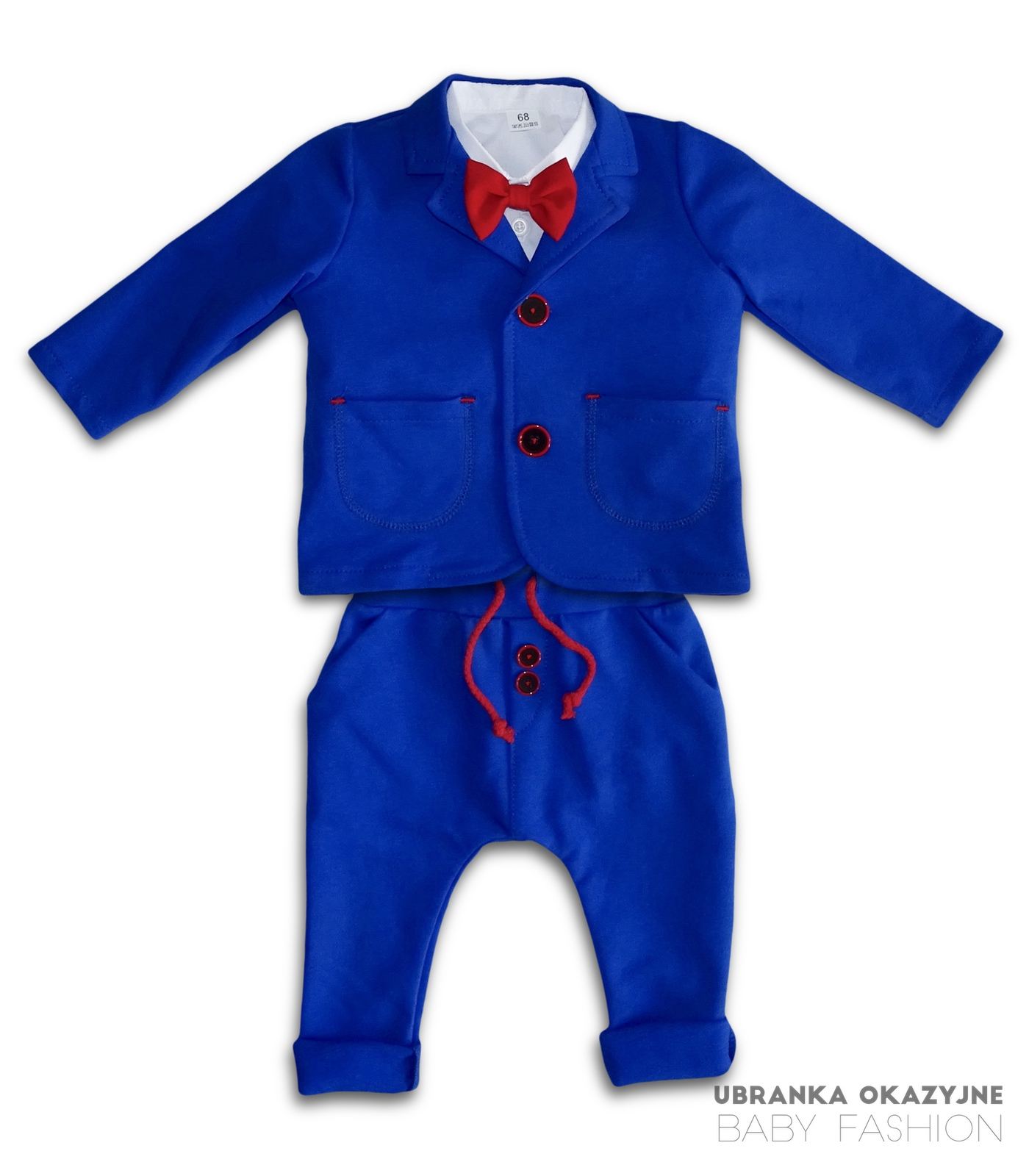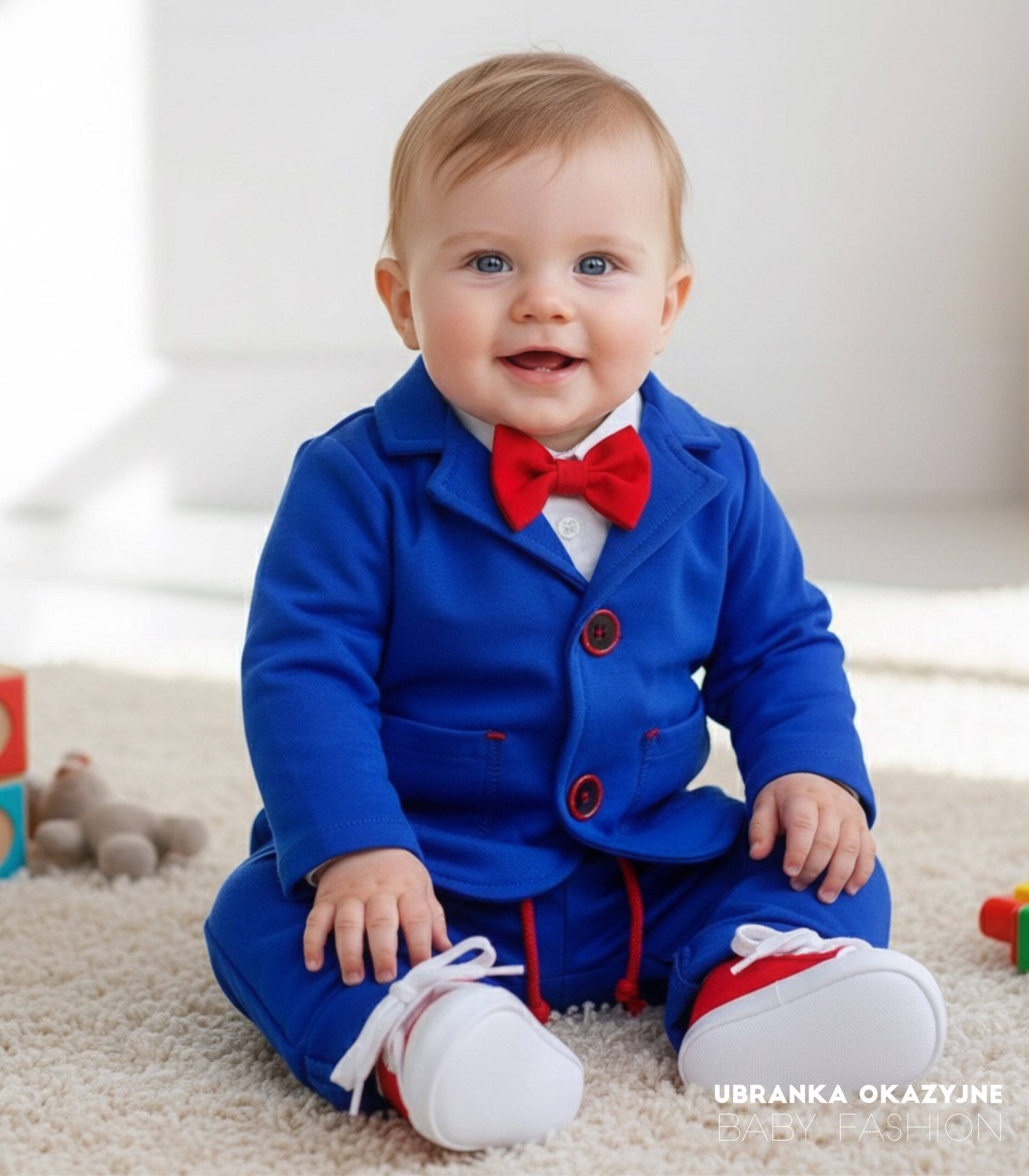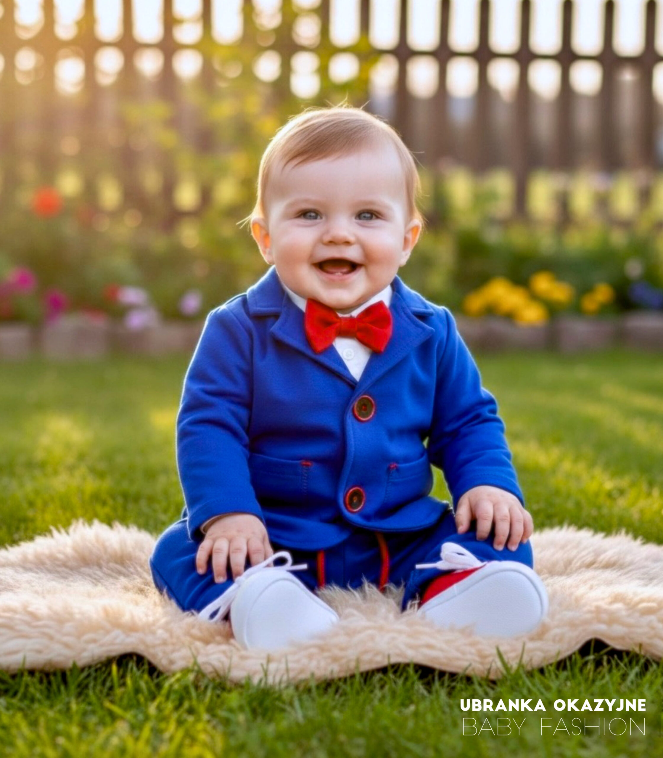 Nasz wyjątkowy bawełniany garniturek do chrztu dla niemowlaka w kolorze chabrowym składa się z marynarki, spodni, białego koszulo-body oraz muszki w kolorze czerwonym. Dostępny w rozmiarach 62, 68, 74, 80, 86, nasz garniturek zapewnia komfort i szyk maluszkom podczas tej ważnej ceremonii. Wybierz nasz elegancki garniturek, aby stworzyć niezwykły wygląd dla Twojego maleństwa.