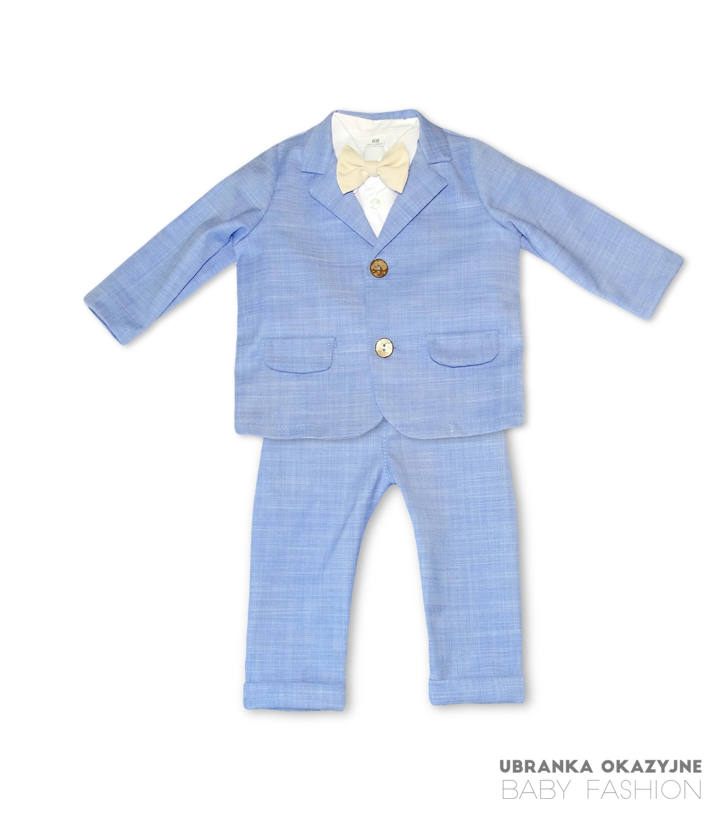 Nasz wyjątkowy błękitny garniturek to niezwykle elegancki wybór na uroczyste okazje, takie jak chrzest czy inne ceremonie. Skomponowany z dbałością o każdy szczegół. Zestaw ten składa się z błękitnej marynarki zdobionej uroczymi drewnianymi guziczkami, błękitnych spodni w tym samym kolorze co marynarka, oraz białego koszulo-body z bawełnianymi majteczkami, zapewniającymi wyjątkowy komfort dla delikatnej skóry maluszka. Dodatkowym elementem, który nadaje zestawowi wyjątkowego uroku, jest muszka w odcieniu jasnego beżu. Dostępny w różnych rozmiarach (62, 68, 74, 80, 86), nasze garniturki posiadają dużą polską rozmiarówkę, zapewniając idealne dopasowanie dla każdego maluszka. Wybierz nasz garniturek, aby stworzyć niezapomniany i stylowy wygląd dla Twojego maleństwa.