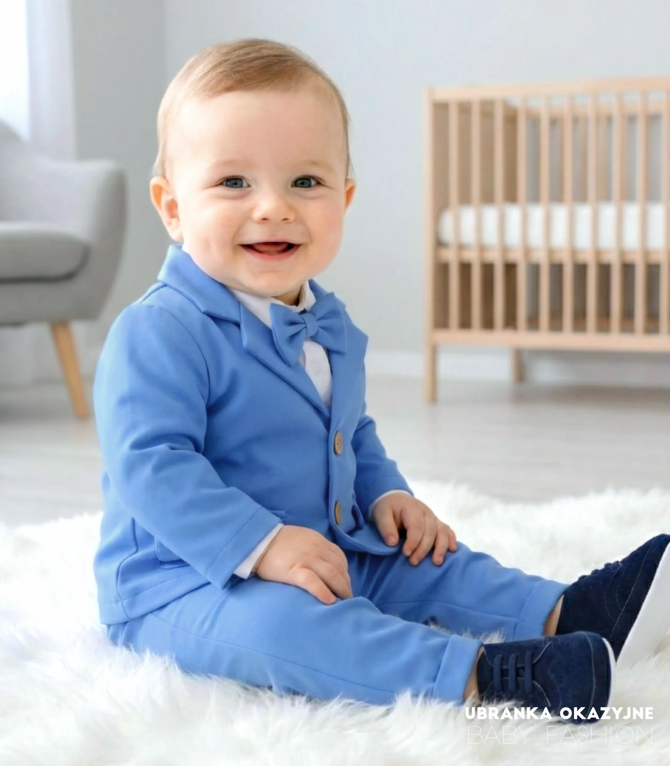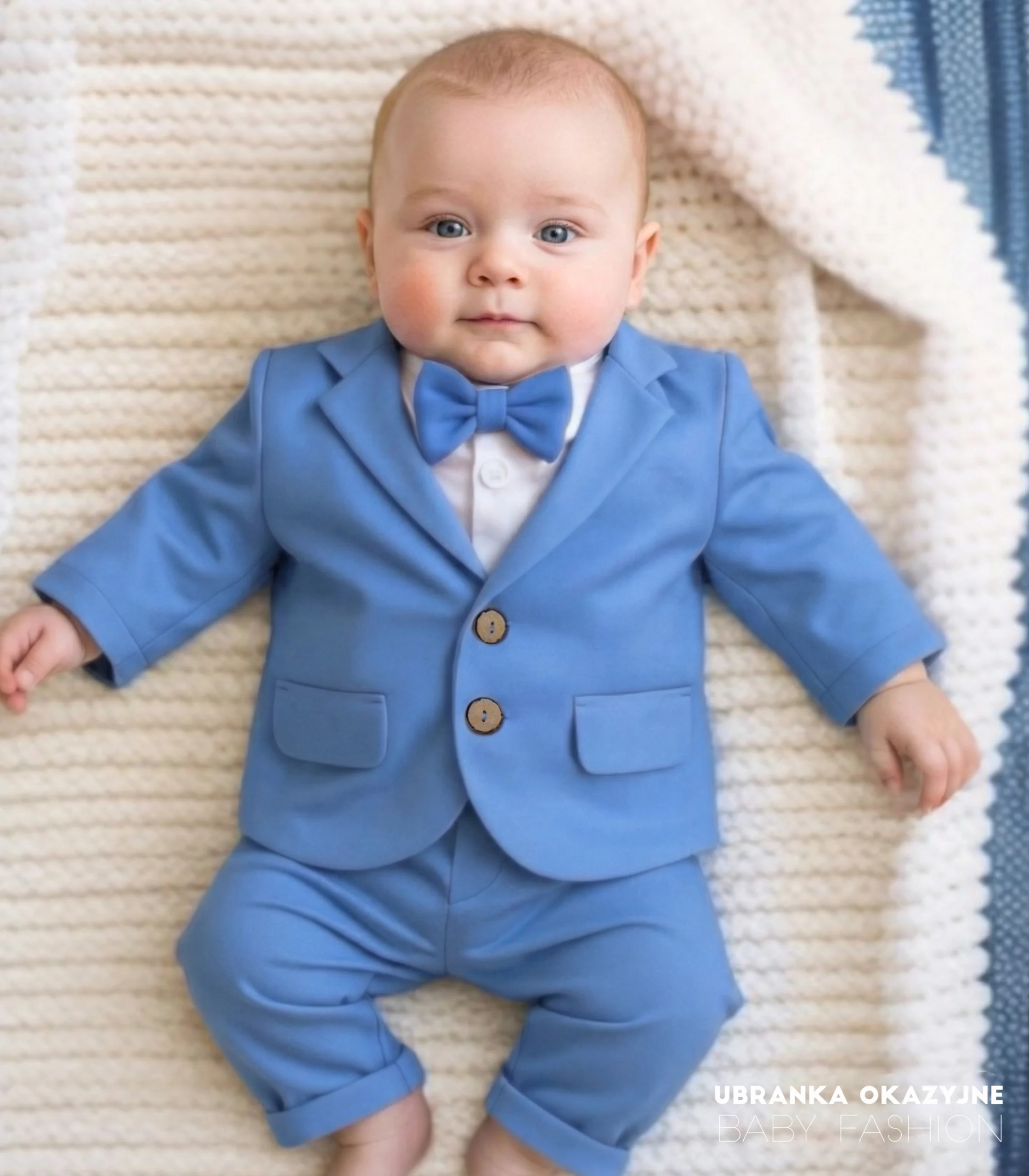 Nasz wyjątkowy garniturek to niezwykle elegancki wybór na uroczyste okazje, takie jak chrzest czy inne ceremonie. Skomponowany z dbałością o każdy szczegół. Zestaw ten składa się z błękitnej marynarki zdobionej uroczymi drewnianymi guziczkami, błękitnych spodni w tym samym kolorze co marynarka, oraz białego koszulo-body z bawełnianymi majteczkami, zapewniającymi wyjątkowy komfort dla delikatnej skóry maluszka. Dodatkowym elementem, który nadaje zestawowi wyjątkowego uroku, jest muszka w kolorze garniturku. Dostępny w różnych rozmiarach (62, 68, 74, 80) , nasze garniturki posiadają dużą polską rozmiarówkę, zapewniając idealne dopasowanie dla każdego maluszka. Wybierz nasz garniturek, aby stworzyć niezapomniany i stylowy wygląd dla Twojego maleństwa.