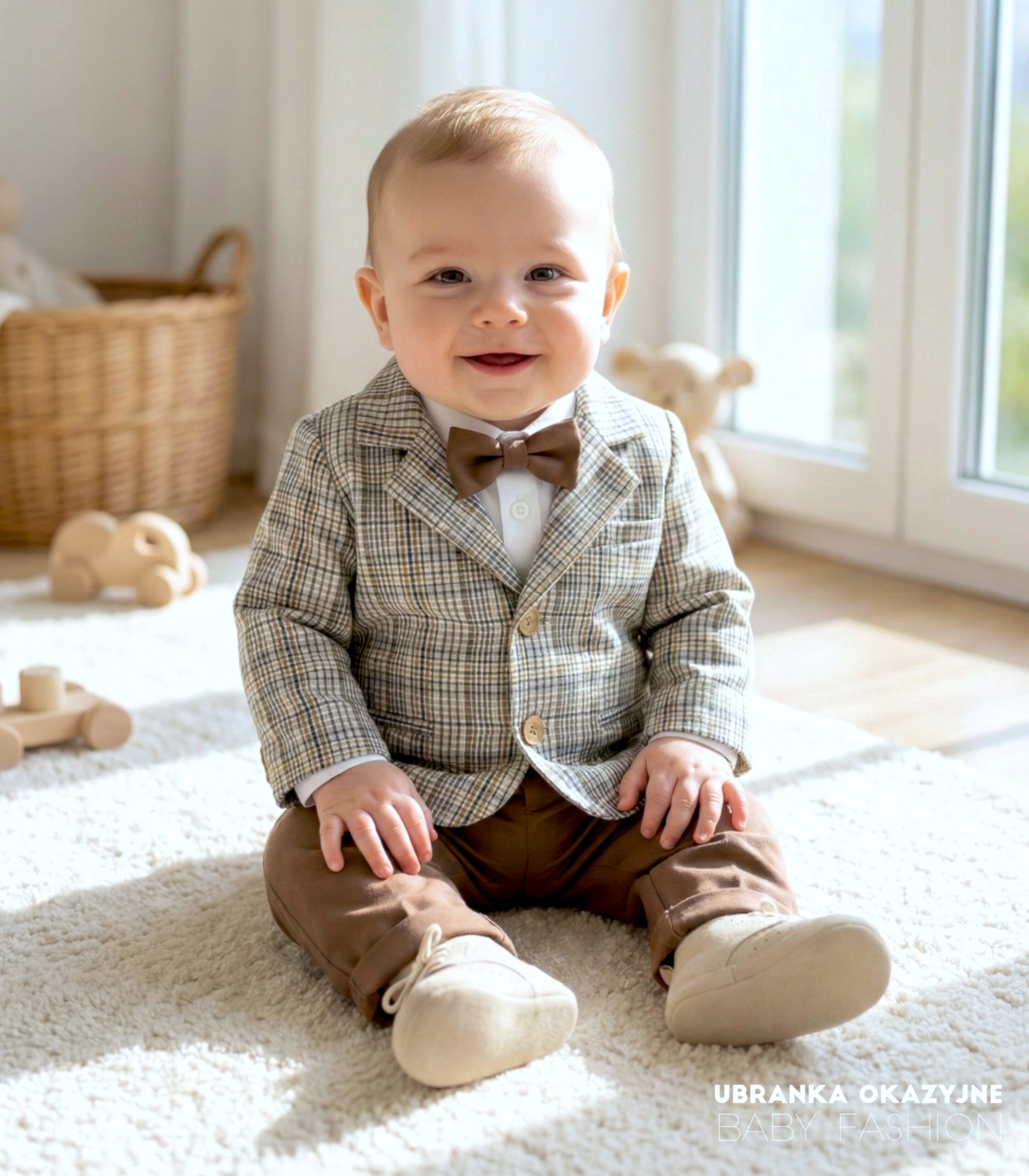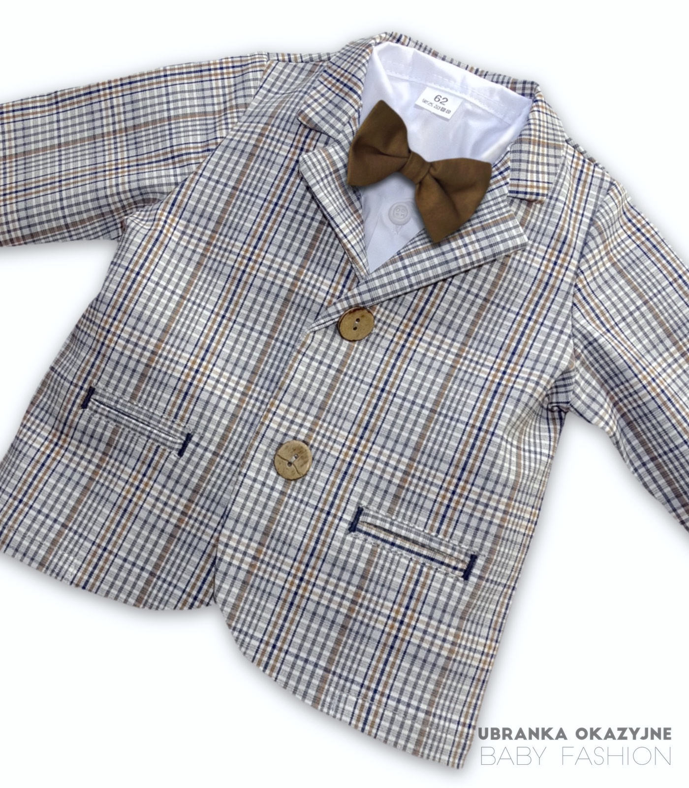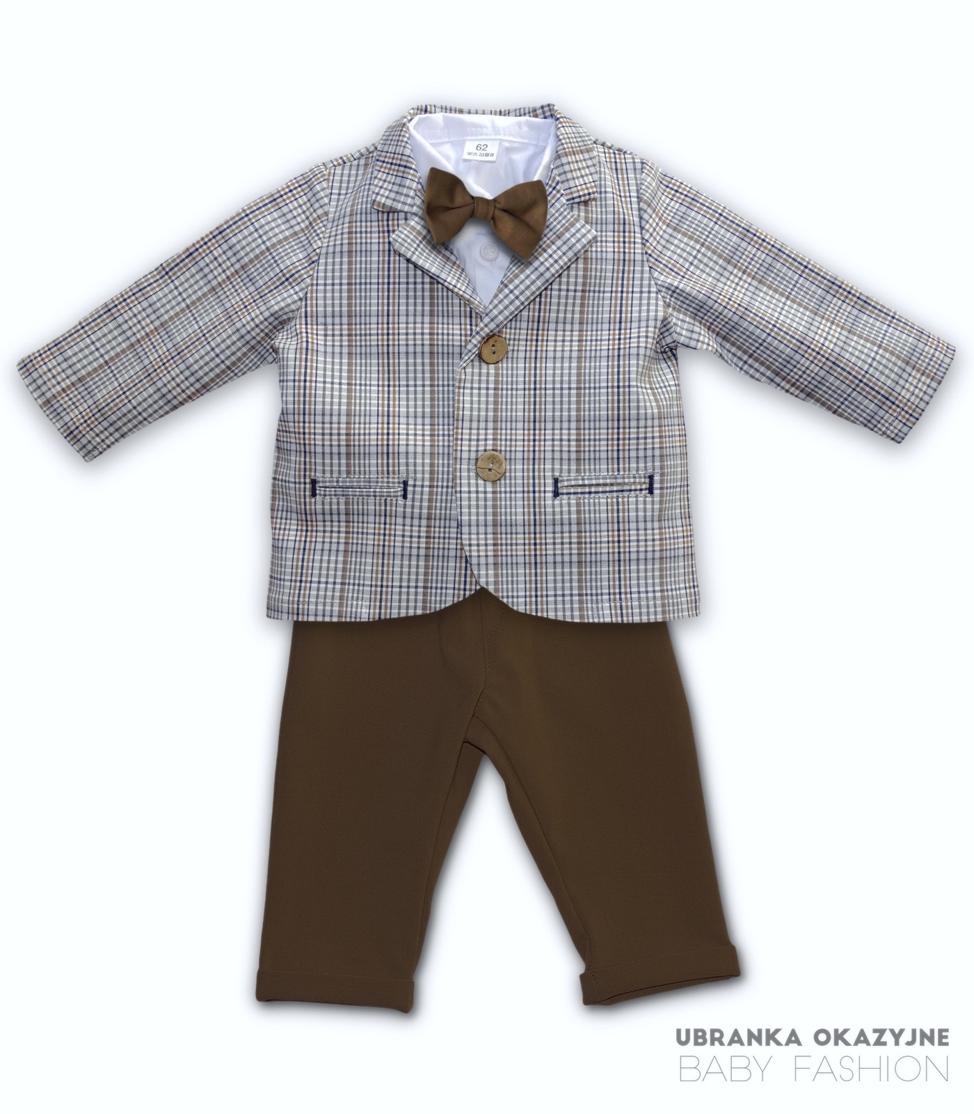 Odkryj elegancję w każdym detalu z naszym wyjątkowym garniturkiem do chrztu dla dziecka. Składający się z beżowej marynarki w kratę oraz spodni w kolorze czekoladowym, uzupełniony białym koszulo-body i czekoladową muchą. Ten polski produkt nie tylko emanuje stylem, ale także zapewnia najmłodszym wygodę podczas ważnego wydarzenia. Podaruj swojemu maluchowi niepowtarzalny wygląd z naszym eleganckim garniturkiem do chrztu.