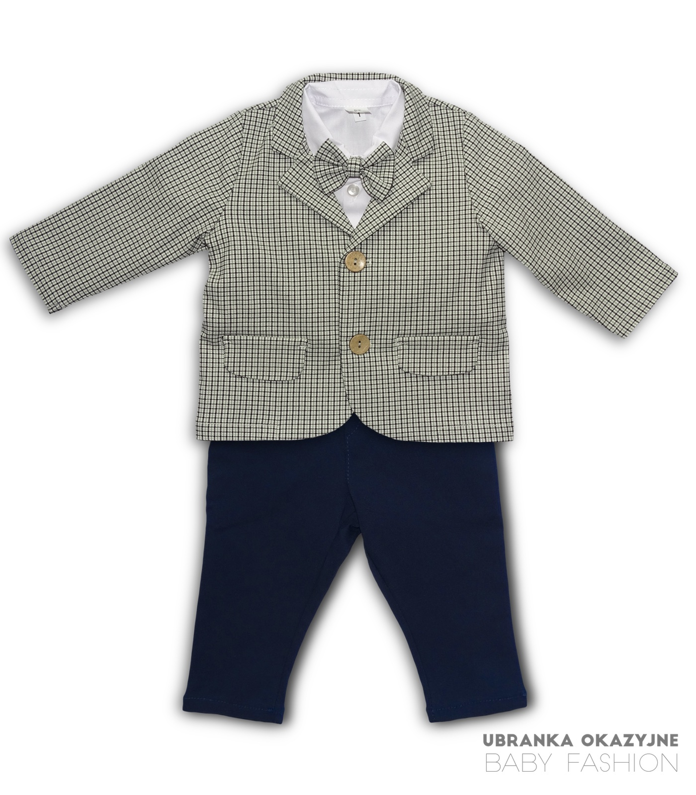 Nasz wyjątkowy garnitur do chrztu dla dzieci to połączenie uroku i wygody. Marynarka w jasnozieloną pepitkę idealnie harmonizuje z granatowymi spodniami, tworząc efektowny zestaw. Białe koszulo-body dodaje elegancji, podczas gdy dopasowana mucha w kolorze marynarki kompleksowo uzupełnia stylizację. Wygodny fason zapewnia maluchowi swobodę ruchów podczas ważnego wydarzenia. Oferujemy nie tylko modę, ale również komfort, abyście mogli cieszyć się wyjątkowymi chwilami z dzieckiem w wyjątkowym stroju.