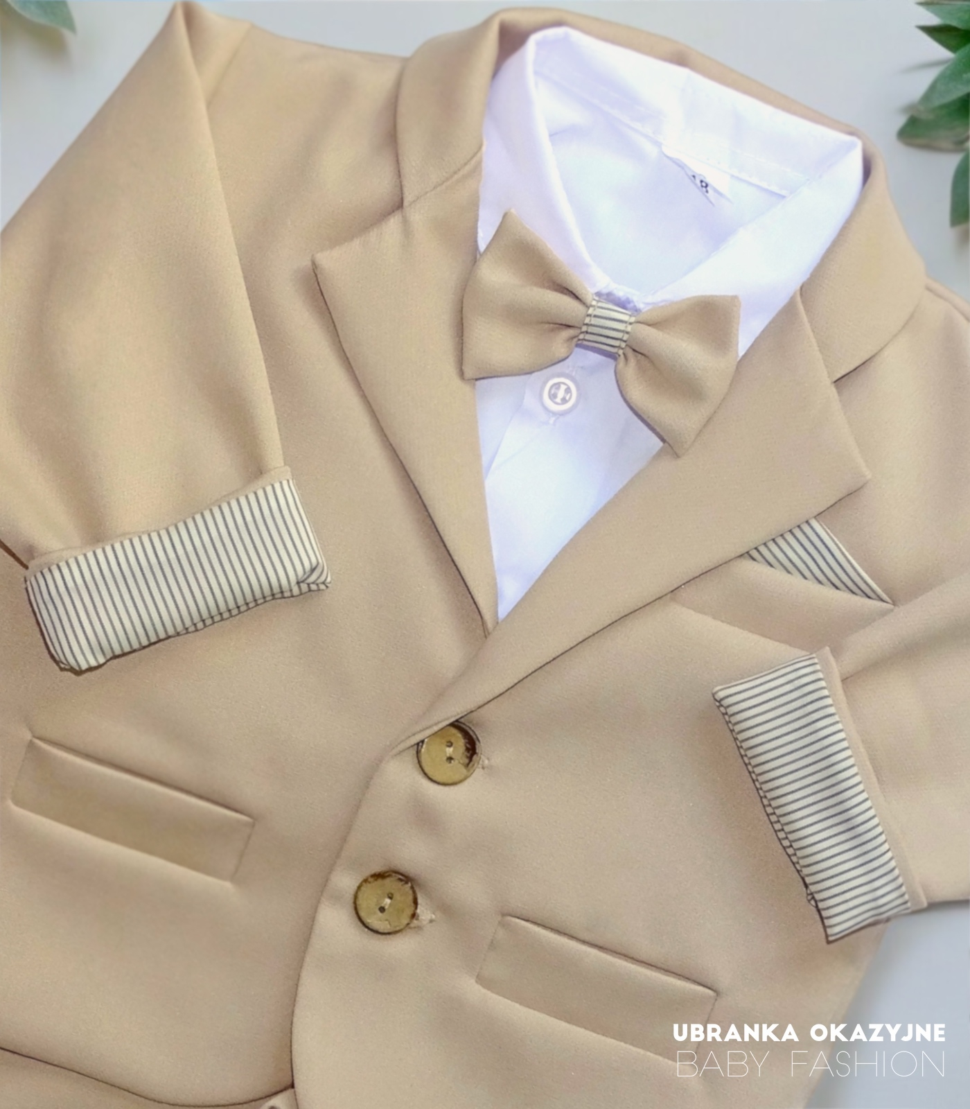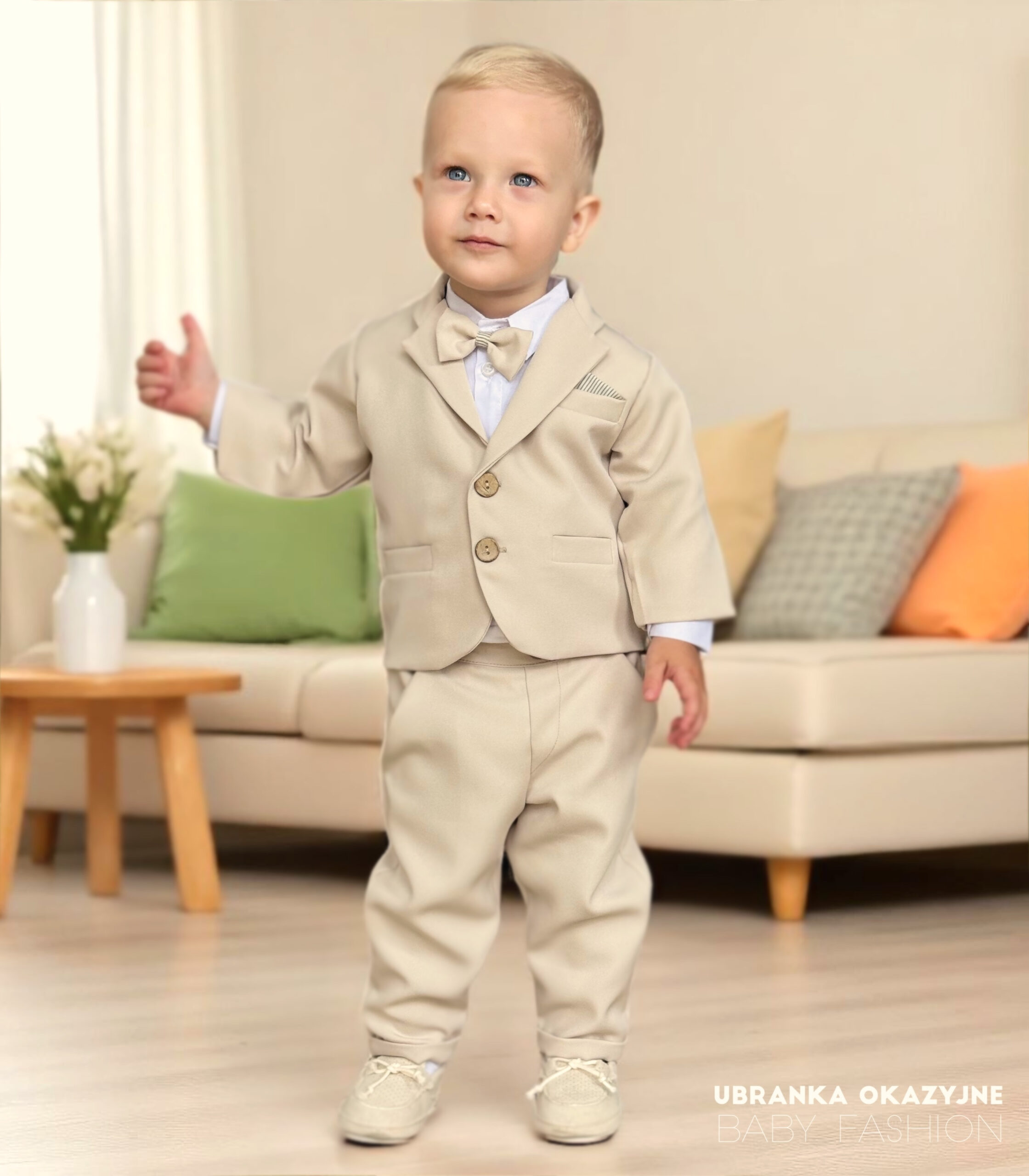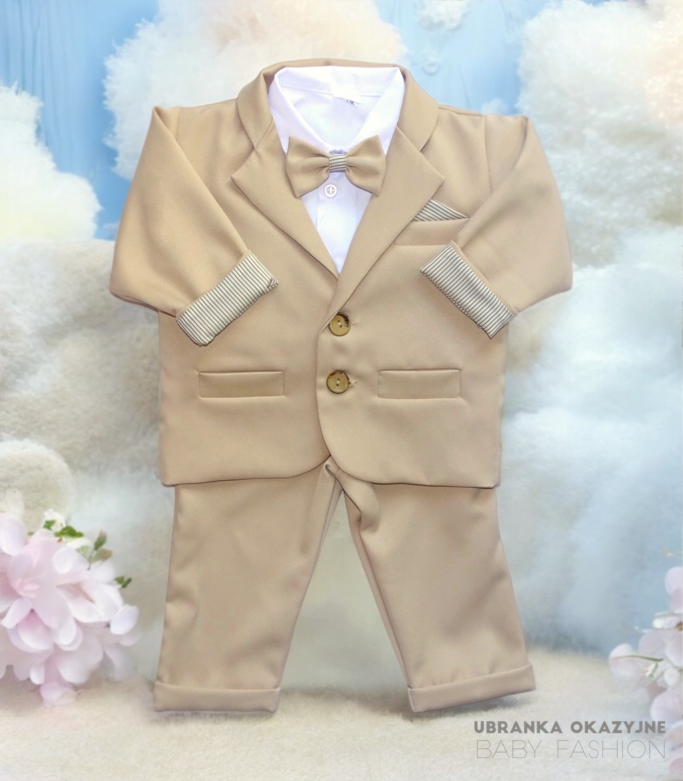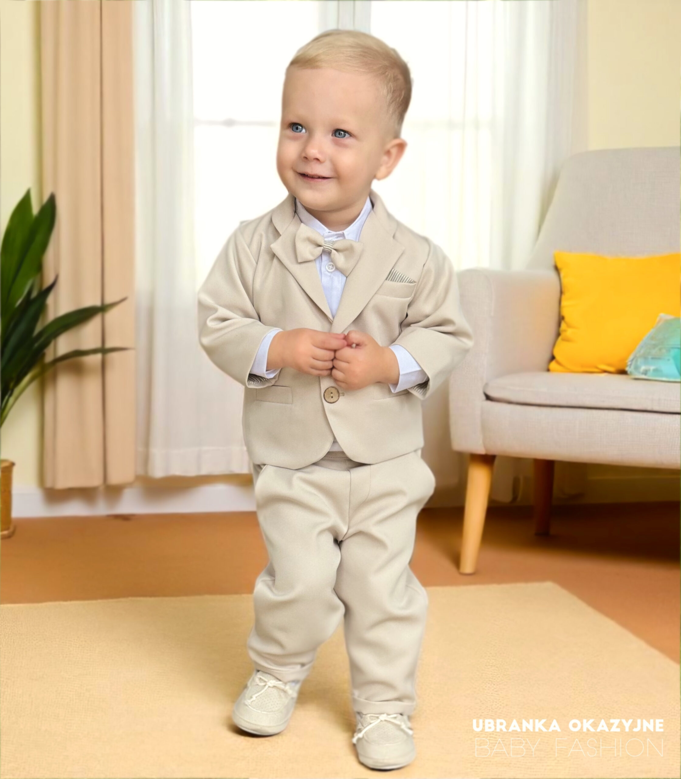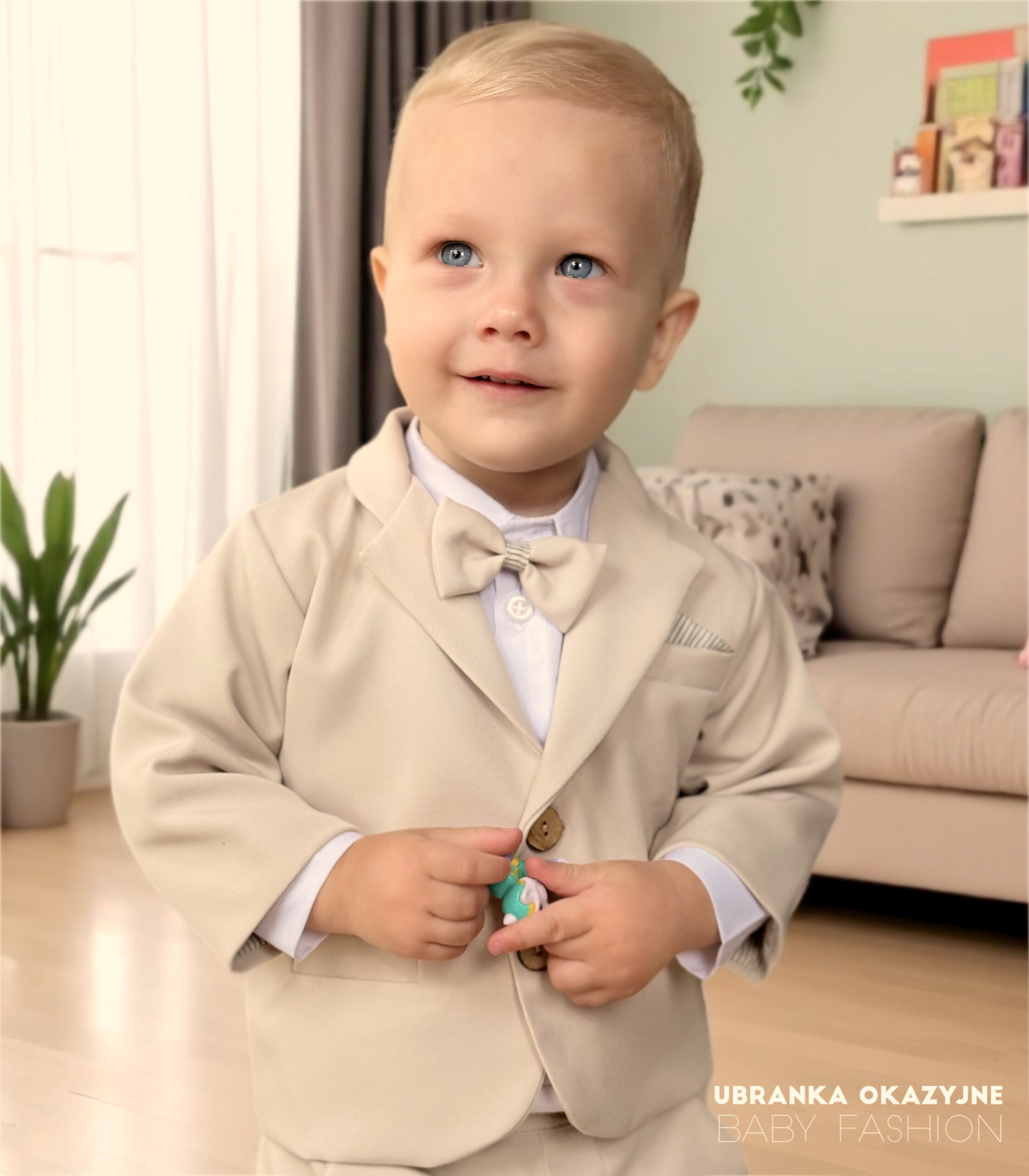 Elegancja w każdym detalu – odkryj nasz uroczy garniturek do chrztu dla dziecka. Zawiera marynarkę i spodnie w kolorze beżowym, białe koszulo-body i subtelną beżową muchę. Wyprodukowany w Polsce, ten wyjątkowy strój nie tylko emanuje stylem, ale także zapewnia wygodę, aby Twoje dziecko czuło się komfortowo podczas ważnego wydarzenia. Daj maluchowi niezapomniany start w eleganckim stylu dzięki naszemu garniturkowi do chrztu.