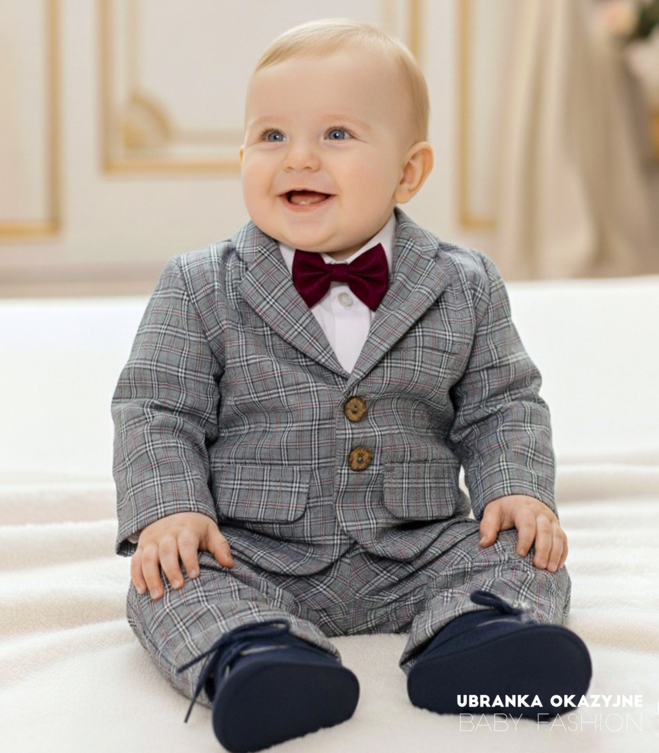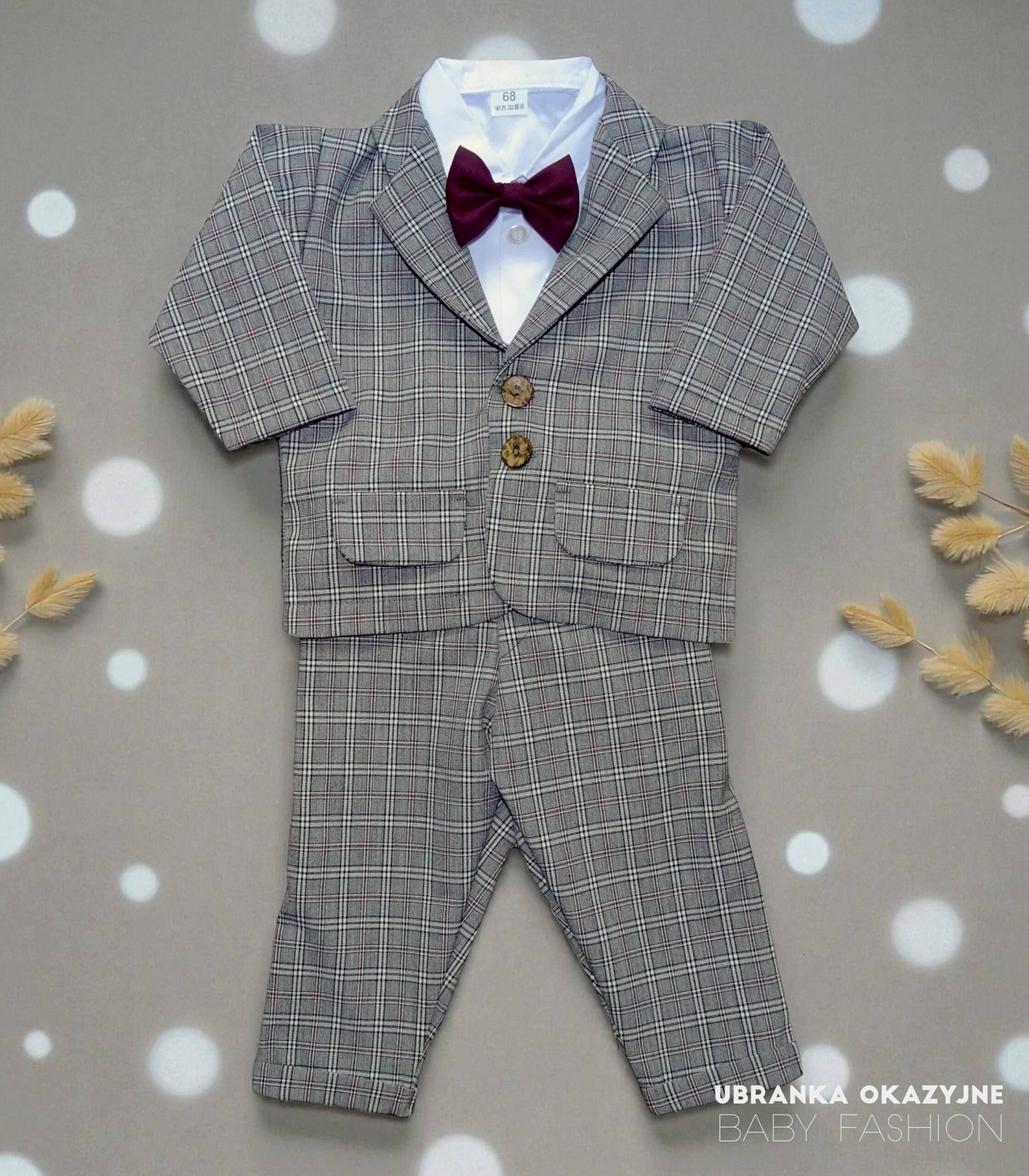 Nasz uroczy garniturek do chrztu dla niemowlaka składa się z ciemno-szarej marynarki i spodni w kratkę, białego koszulo-body oraz muszki w kolorze bordowym. Dostępny w rozmiarach 62, 68, 74, 80, nasz garniturek zapewnia wygodę i styl maluszkom podczas tej wyjątkowej ceremonii. Wybierz nasz elegancki garniturek, aby stworzyć niezapomniany wygląd dla Twojego maleństwa.