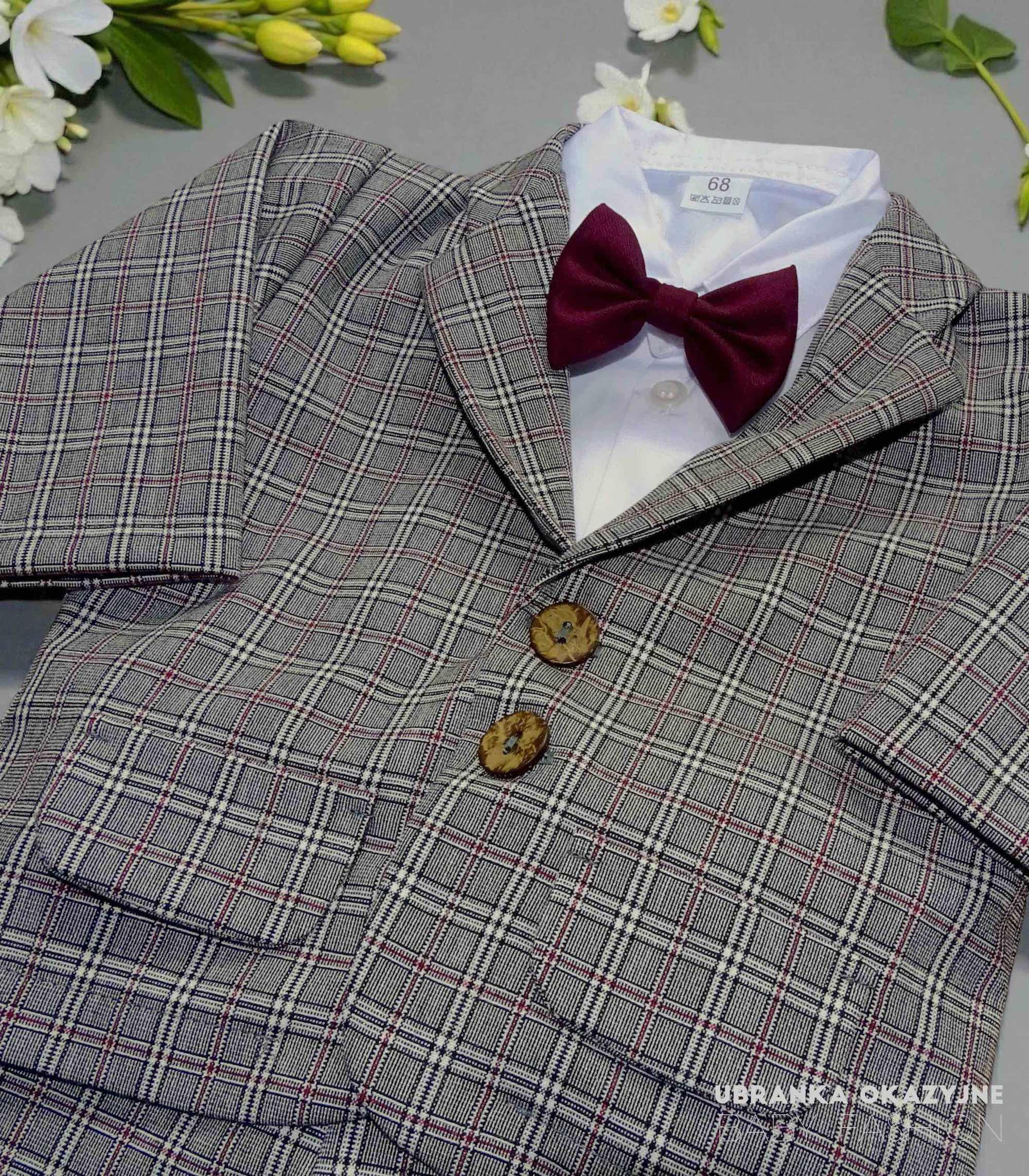 Garniturek do chrztu dla dziecka, skomponowany z ciemno-szarej marynarki i spodni w kratę. Klasyczne białe koszulo-body oraz elegancka bordowa mucha dodają mu subtelności. Ten polski produkt nie tylko emanuje stylem, ale także zapewnia wyjątkowy komfort, umożliwiając maluchowi swobodę w ważnym wydarzeniu. Zapewnij swojemu dziecku niepowtarzalny outfit w który łączy elegancję z wygodą.