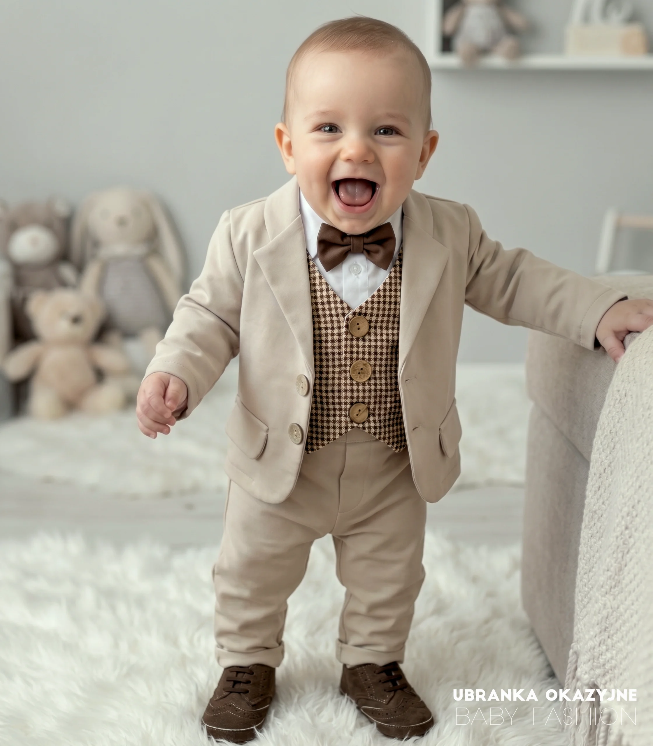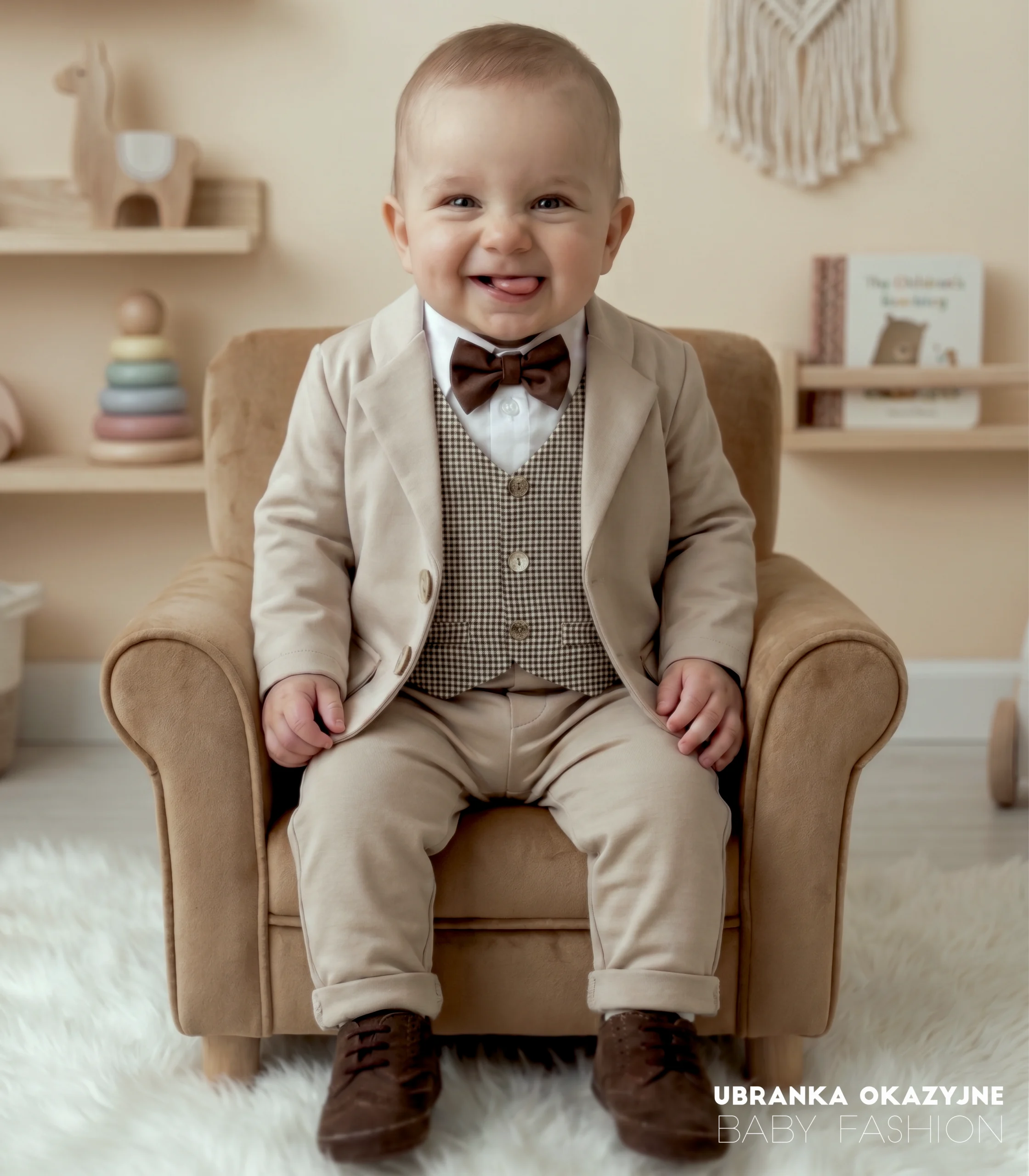 Nasz wyjątkowy beżowy garniturek stanowi idealny strój na uroczyste okazje, takie jak chrzest. Zestaw ten składa się z beżowej marynarki ozdobionej drewnianymi guziczkami, elastycznych beżowych spodni, kamizelki w brązową pepitkę oraz białego koszulo-body z bawełnianymi majteczkami zapewniającymi wyjątkowy komfort dla delikatnej skóry maluszka. Dodatkowym elementem, który nadaje zestawowi elegancji, jest czekoladowa muszka. Dostępny w rozmiarach (62, 68, 74, 80, 86), nasze garnitury posiadają dużą polską rozmiarówkę, gwarantując idealne dopasowanie dla każdego maluszka. Wybierz nasz garniturek, aby stworzyć niezapomniany i stylowy wygląd dla Twojego maleństwa.