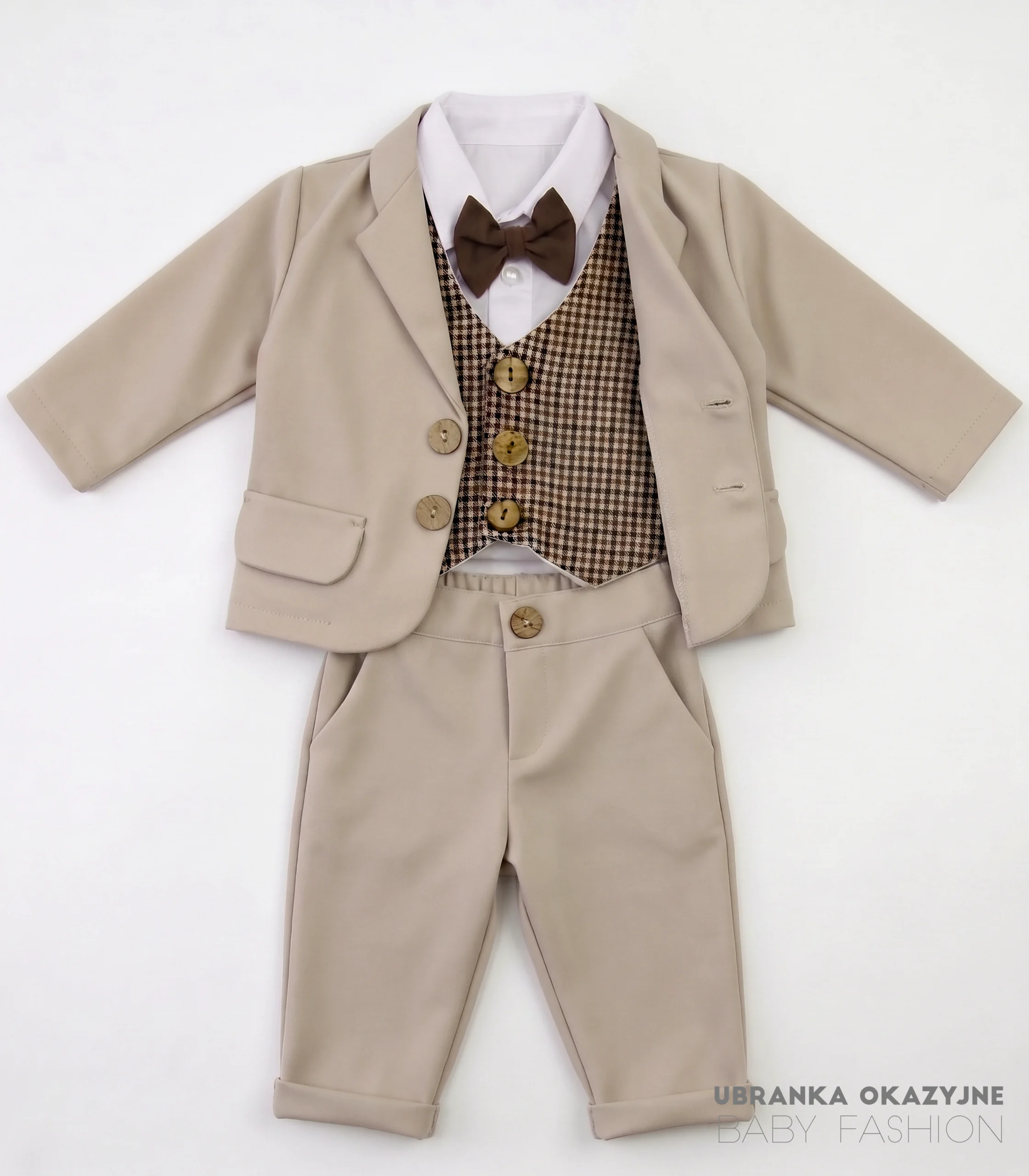 Elegancki Beżowy Garniturek do Chrztu dla Niemowlaka