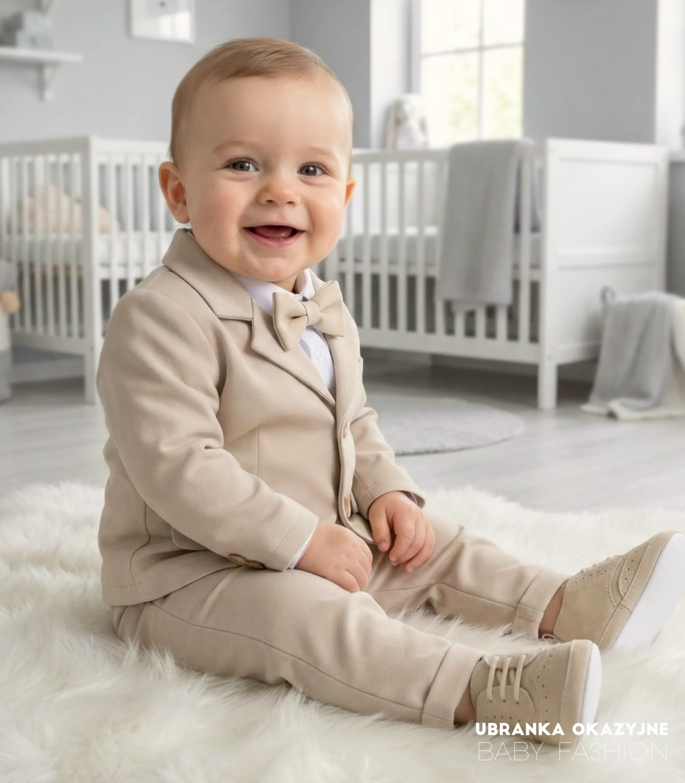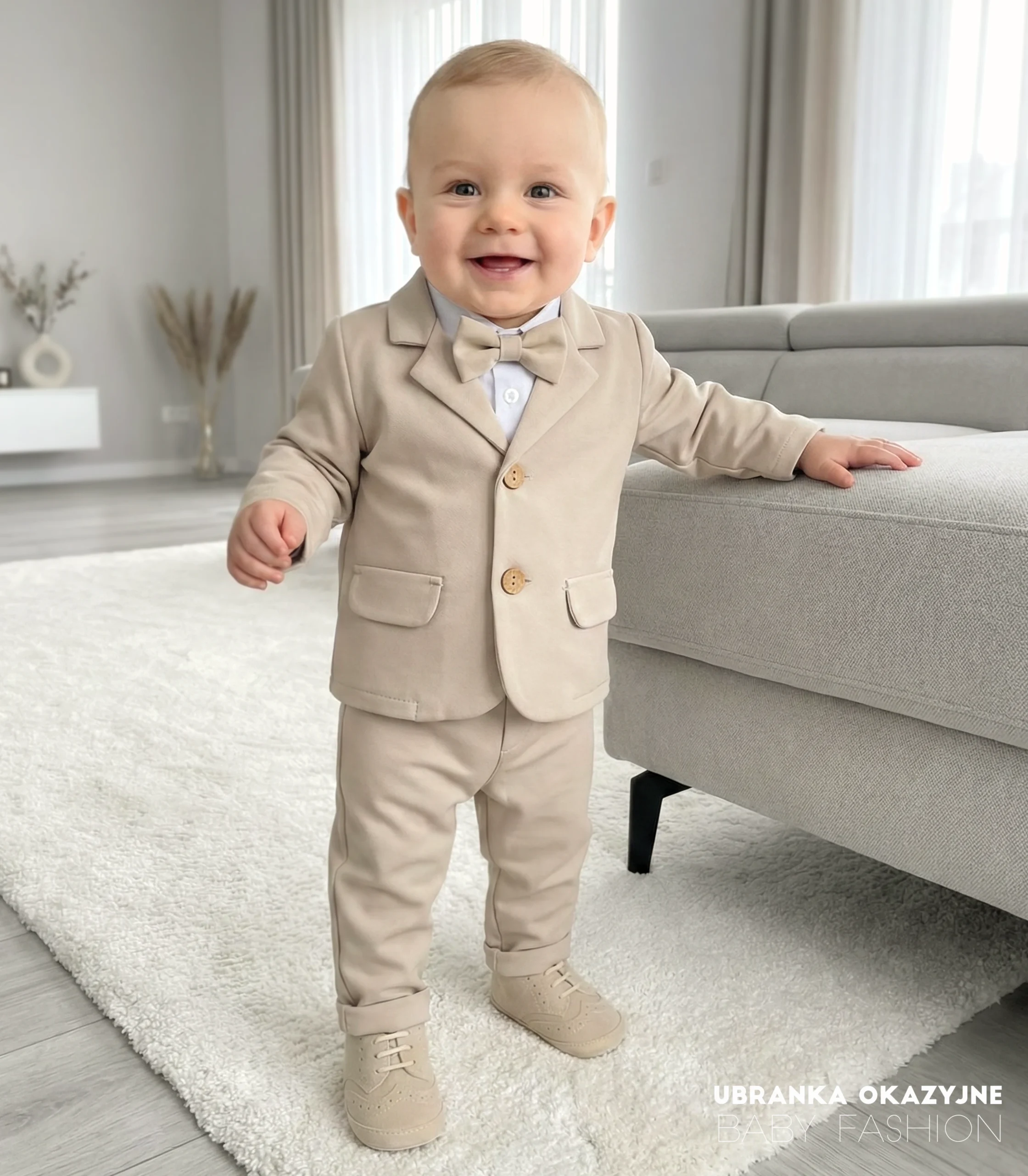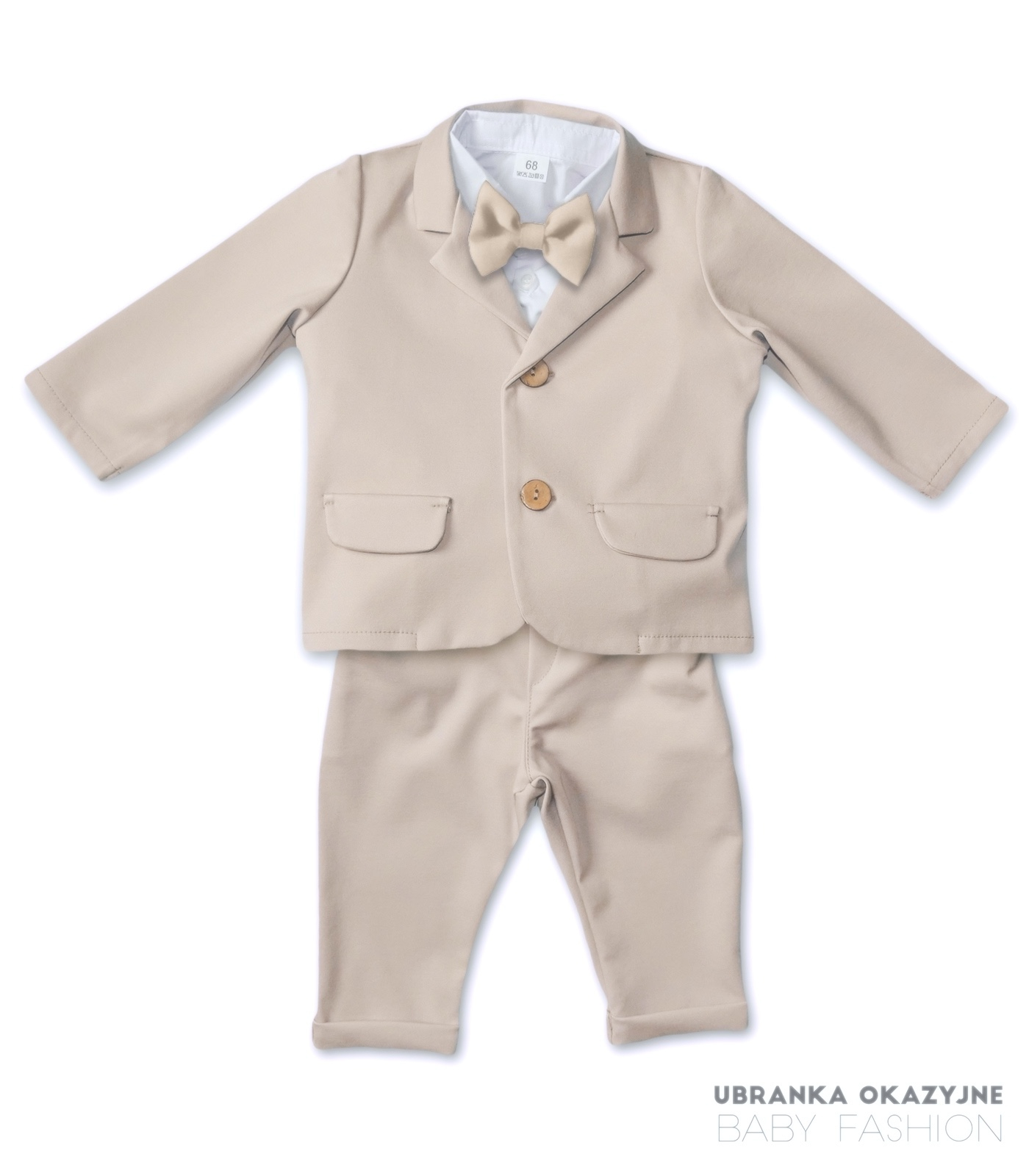 Odkryj nasz elegancki beżowy garniturek, idealny na uroczystość chrztu dla niemowlaka. Ten kompletny zestaw składa się z marynarki, spodni, białego koszulo-body oraz muszki. Dostępne w rozmiarach: 62, 68, 74, 80, 86. Uczyń ten wyjątkowy dzień jeszcze bardziej niezapomnianym z naszym eleganckim garniturkiem. Dostępny już teraz!