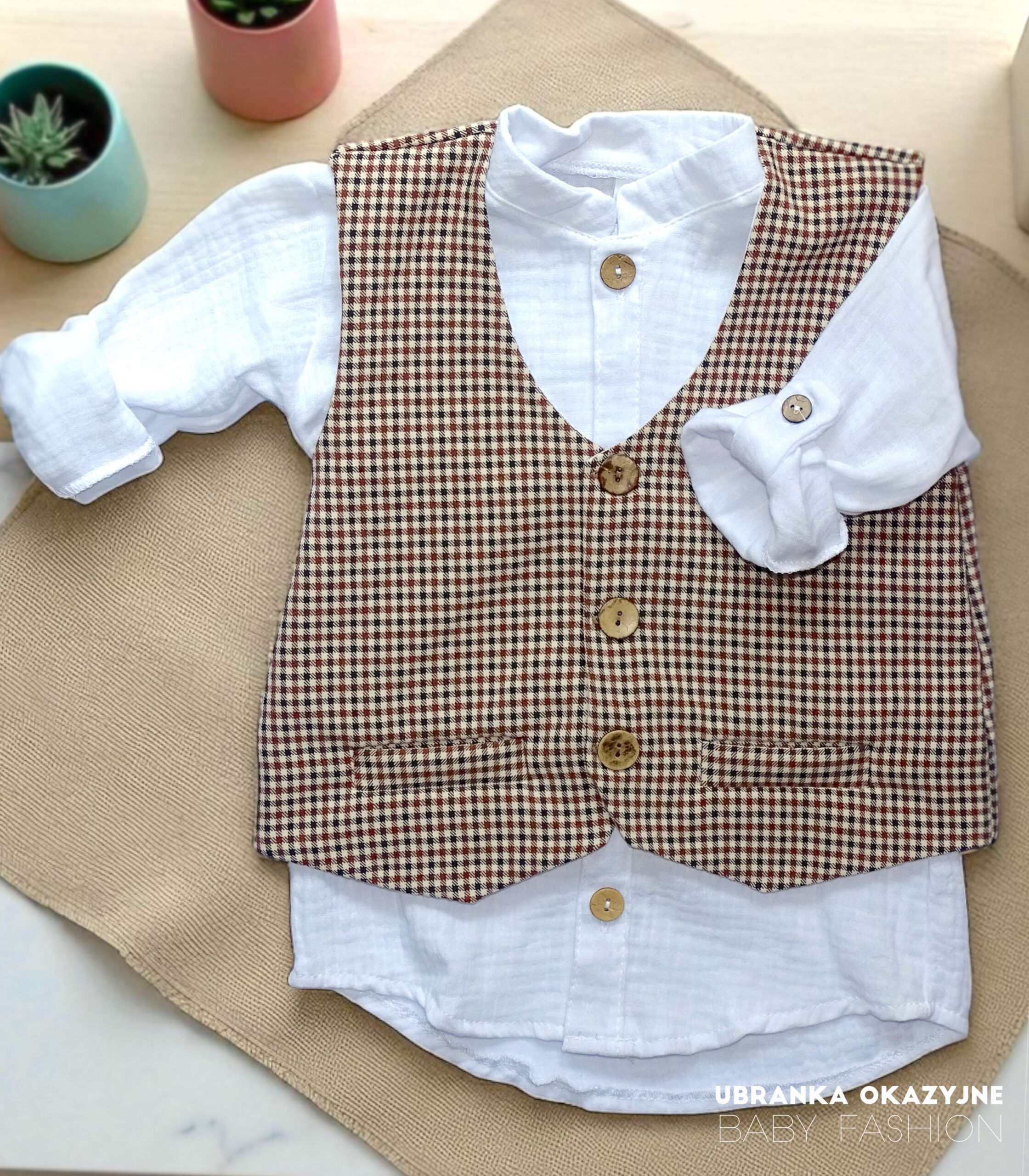 Stylowa kamizelka dla chłopca w brązową pepitkę – elegancki wybór na wyjątkowe okazje. Zapinana na drewniane guziczki, wykonana z dbałością o detale przez polskiego producenta. Idealnie sprawdzi się na wesela, święta i inne uroczystości. Dostępna w rozmiarach od 92 do 134.