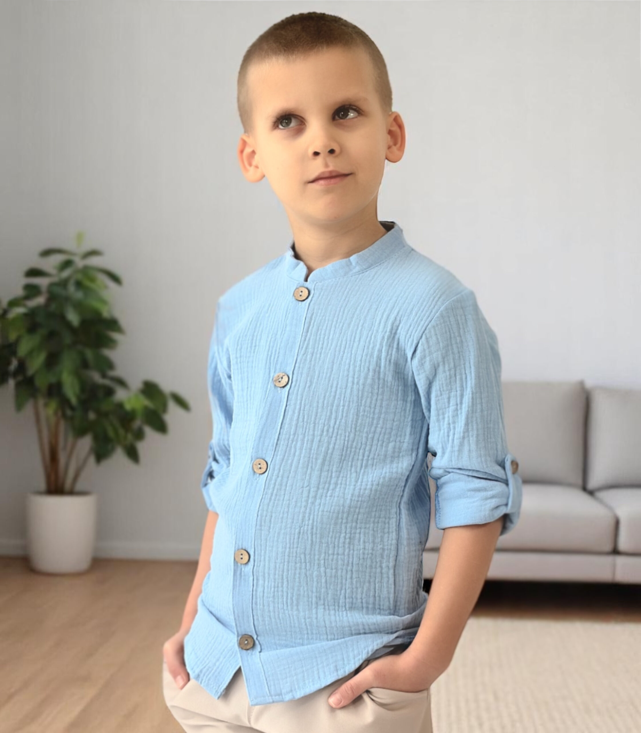 Odkryj wyjątkową elegancję w naszej błękitnej koszuli na stójce z muślinu, stworzonej dla chłopców. Muślinowa koszula z długim rękawem z możliwością wywinięcia, zapinana na drewniane guziczki, ta koszula dodaje wyrafinowanego charakteru każdej stylizacji. Wykonana z delikatnego muślinu, zapewnia nie tylko styl, ale także komfort noszenia przez cały dzień. Sprawdź naszą kolekcję już dziś i podkreśl wyjątkowy styl swojego chłopca!