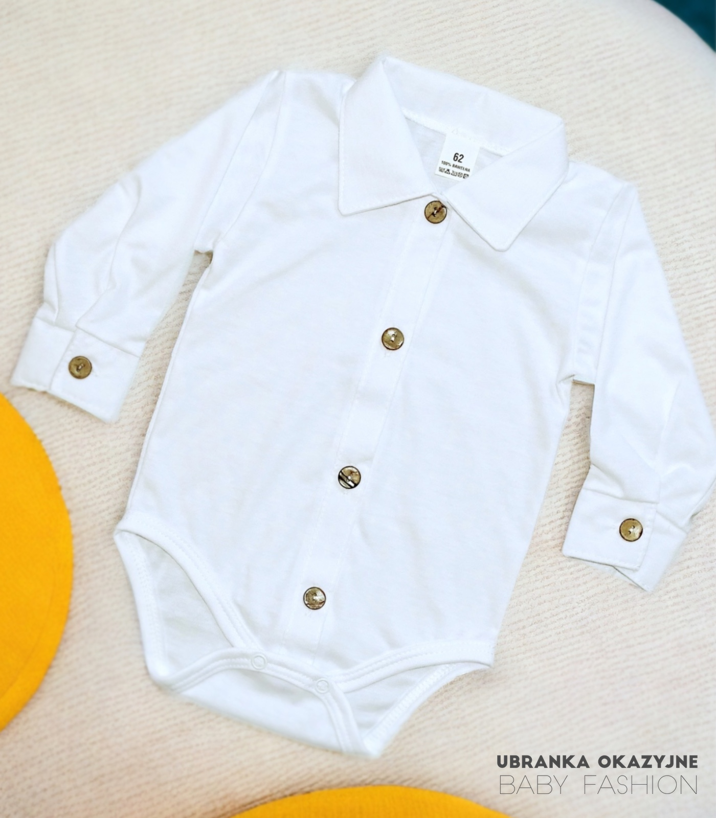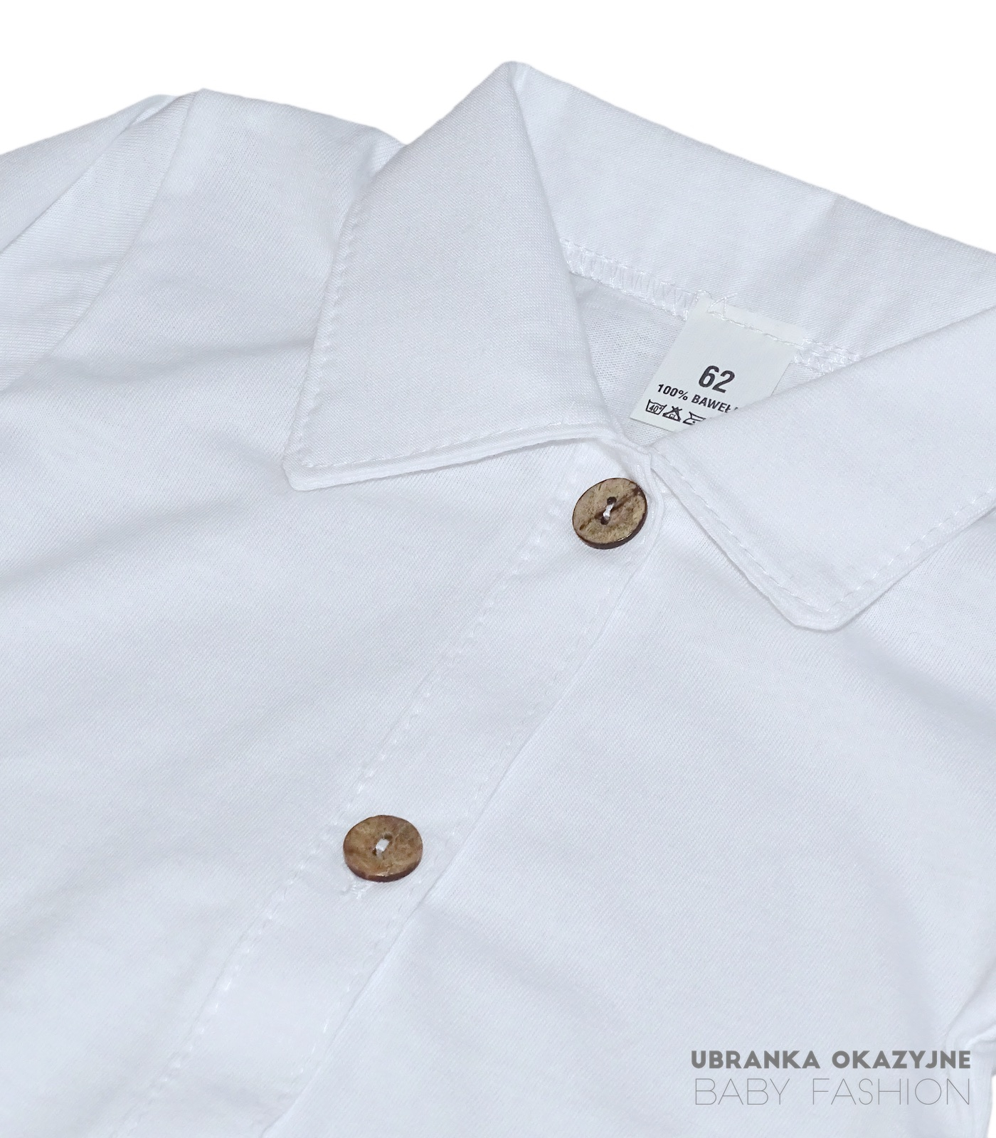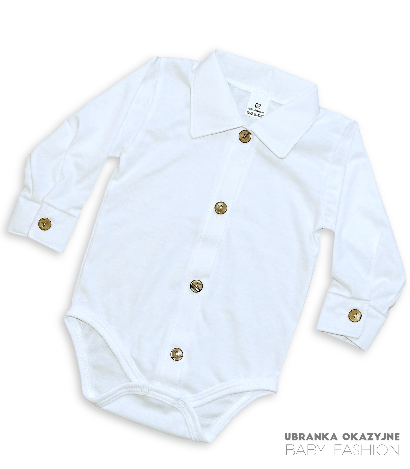 Odkryj nasze białe bawełniane koszulo-body z długim rękawem, zapinane na drewniane guziczki. To doskonały wybór dla Twojego maluszka – nie tylko zapewni mu wygodę, ale także dodaje elegancji dzięki subtelnie wykonanym detalom. Sprawdź naszą ofertę już teraz!