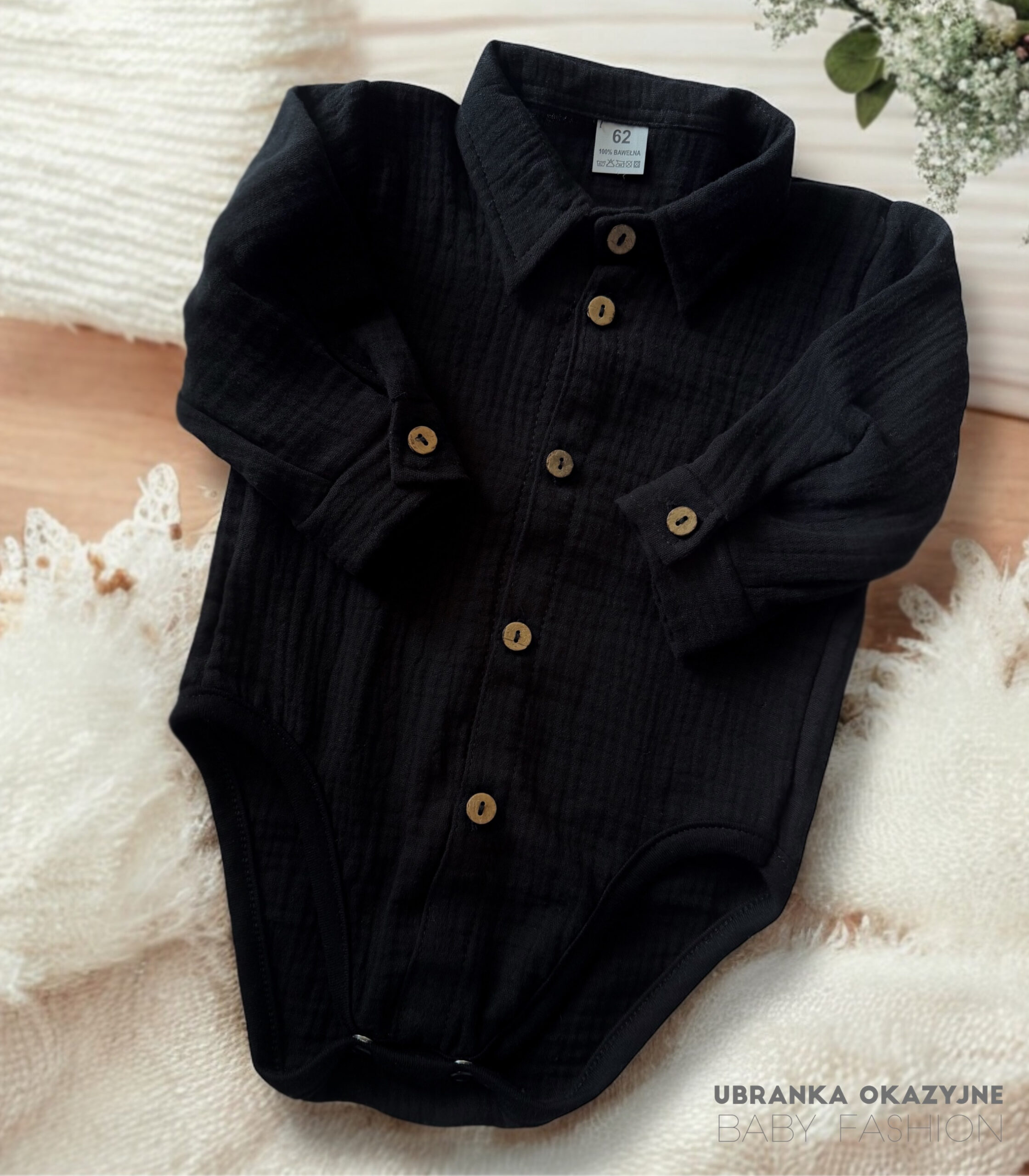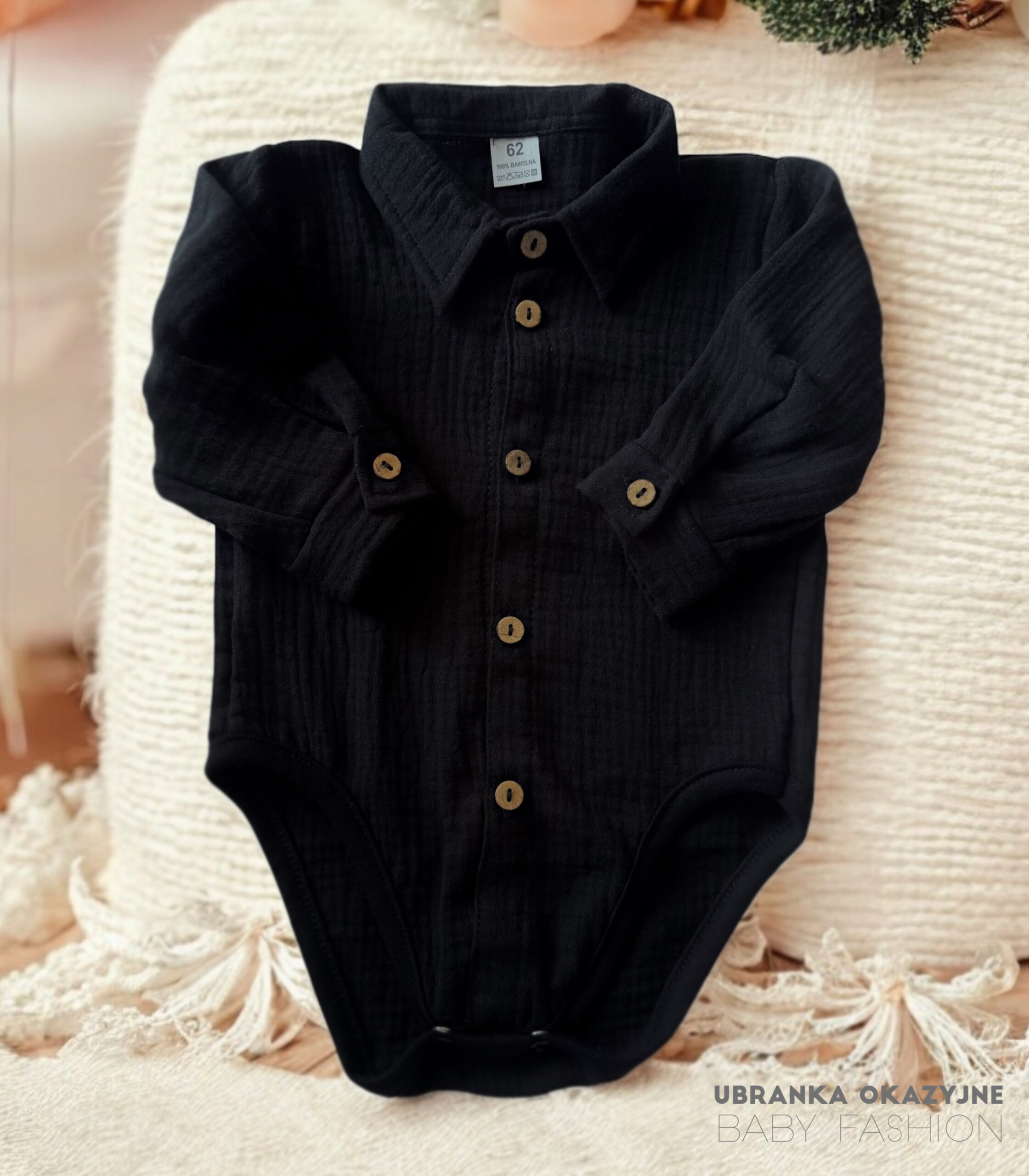 Oto koszulo-body, które łączy w sobie komfort i styl dla najmłodszych. Czarne muślinowe body z długim rękawem to doskonały wybór na każdą okazję. Z eleganckim kołnierzykiem i praktycznymi drewnianymi guziczkami, zapewnia łatwe zakładanie oraz dodaje uroku maluszkowi. Wykonane z delikatnego muślinu, materiał ten gwarantuje przyjemne uczucie na skórze dziecka. Przygotuj się na urok i wygodę w jednym – to koszulo-body, które spełnia oczekiwania zarówno rodziców, jak i maluchów.