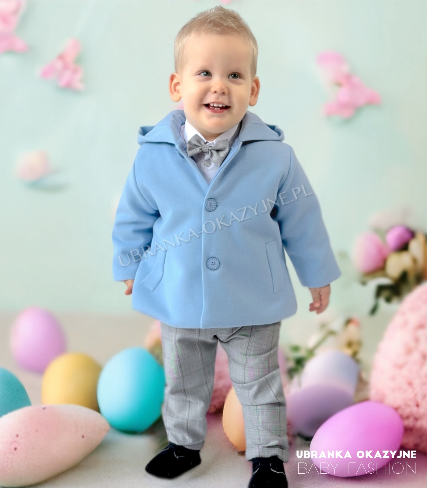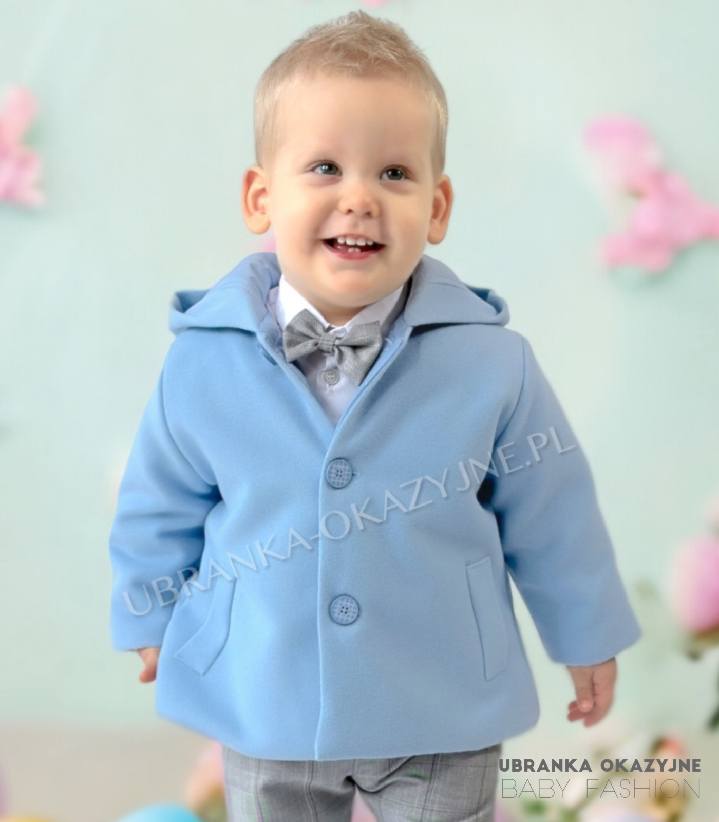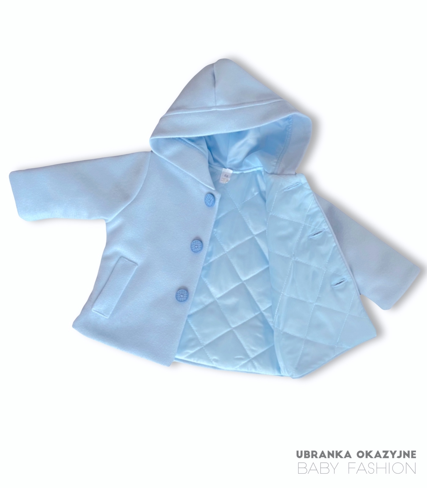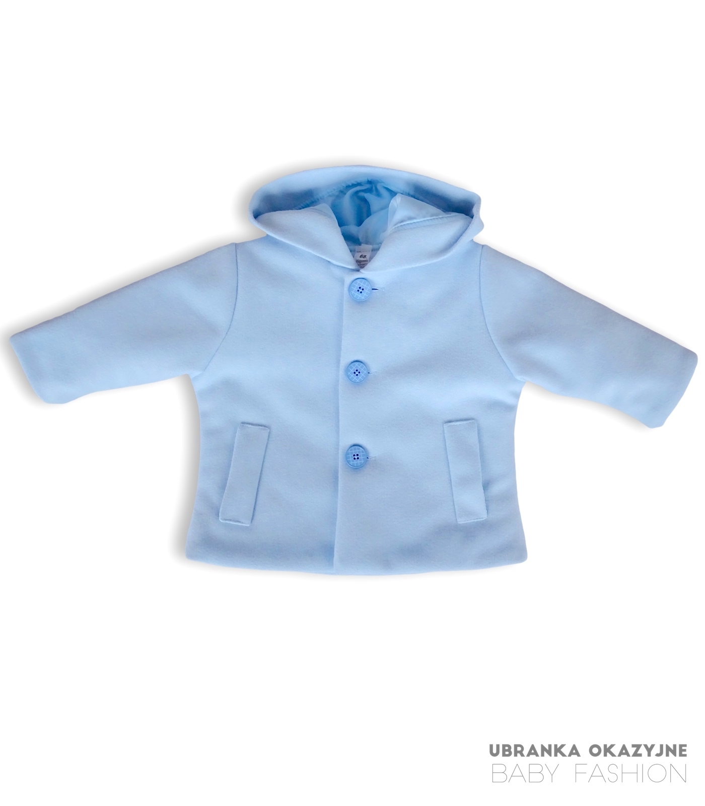 Wyjątkowa błękitna kurtka w formie płaszczyka z kapturem z miękkiego flauszu dla niemowlaka, zapinana na 3 błękitne guziczki. Idealna na ceremonie chrztu oraz inne uroczyste okazje. Dostępne rozmiary: 62, 68, 74, 80, 86. Spraw, by dzień chrztu był jeszcze bardziej wyjątkowy z naszą kolekcją. Stwórz niepowtarzalny look dla Twojego maluszka!