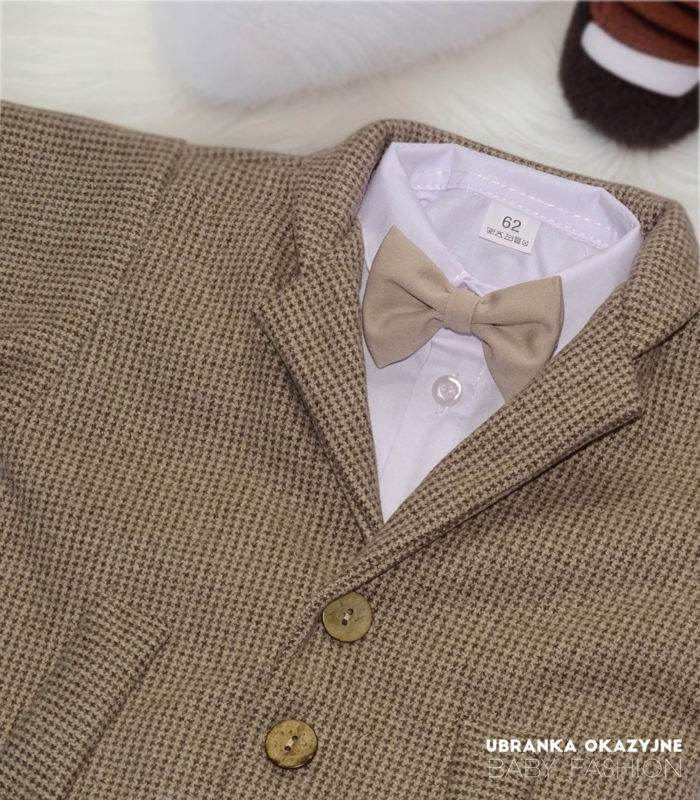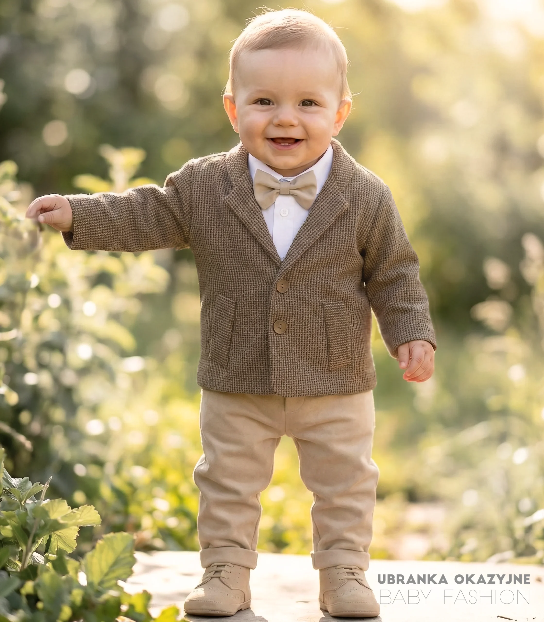 Elegancka kurtka w formie płaszczyka w kolorze brązowej pepitki dla dziecka z miękkiego flauszu z kołnierzykiem, zapinana na drewniane guziczki. Doskonały wybór na uroczyste okazje, w tym ceremonie chrztu. Dostępne rozmiary: 62, 68, 74, 80. Podkreśl piękno i wyjątkowość chwili chrztu z naszą beżową kurtką dla niemowlaka.