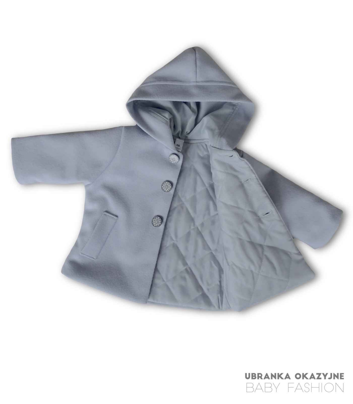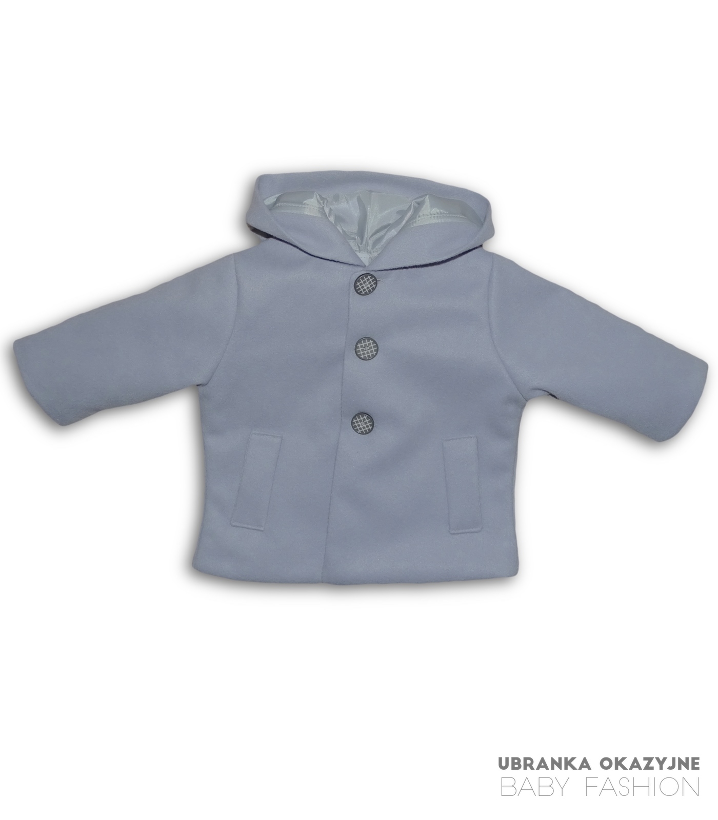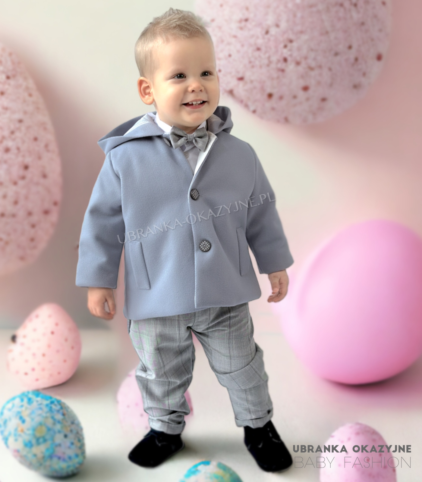 Odkryj naszą elegancką szarą kurtkę do chrztu dla niemowlaka, idealną na wyjątkowe okazje. Wykonana z miękkiego flauszu, zapewnia ciepło i wygodę Twojemu maluchowi. Zapinana na trzy szare guziczki, kurtka w formie płaszczyka z kapturem dodaje uroku i klasy. Dostępne rozmiary: 62, 68, 74, 80, 86. Spraw, by dzień chrztu był jeszcze bardziej wyjątkowy z naszą kolekcją.