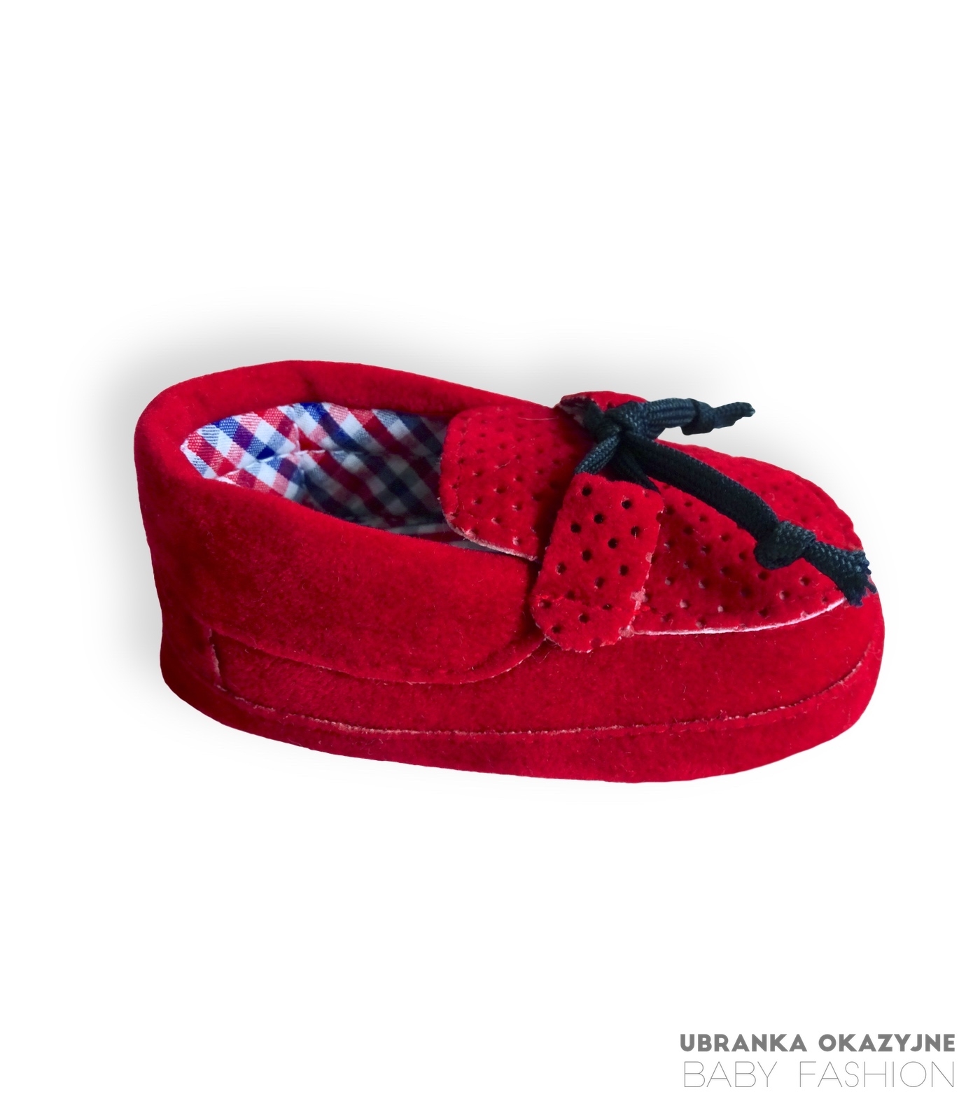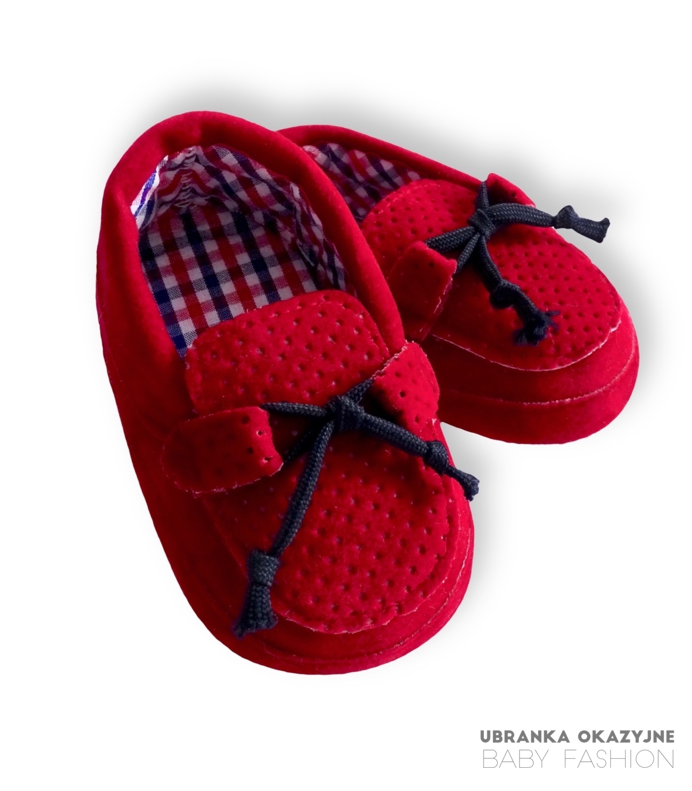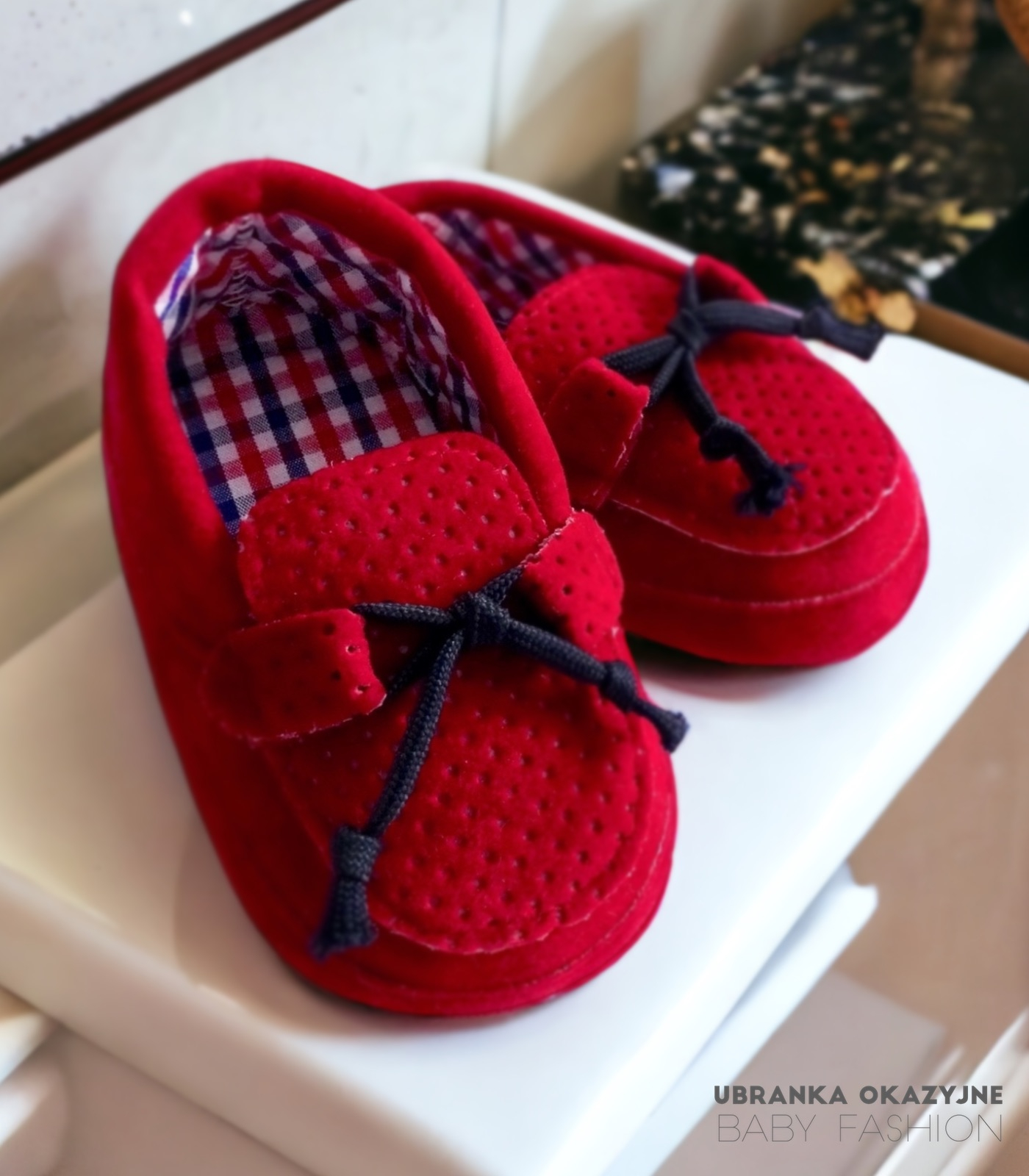 Czerwony kolor i zamszowy materiał mokasynów dodają odrobinę elegancji do każdego stroju. Doskonale komponują się z garniturkiem lub ubrankiem do chrztu, tworząc stylową i uroczą całość.