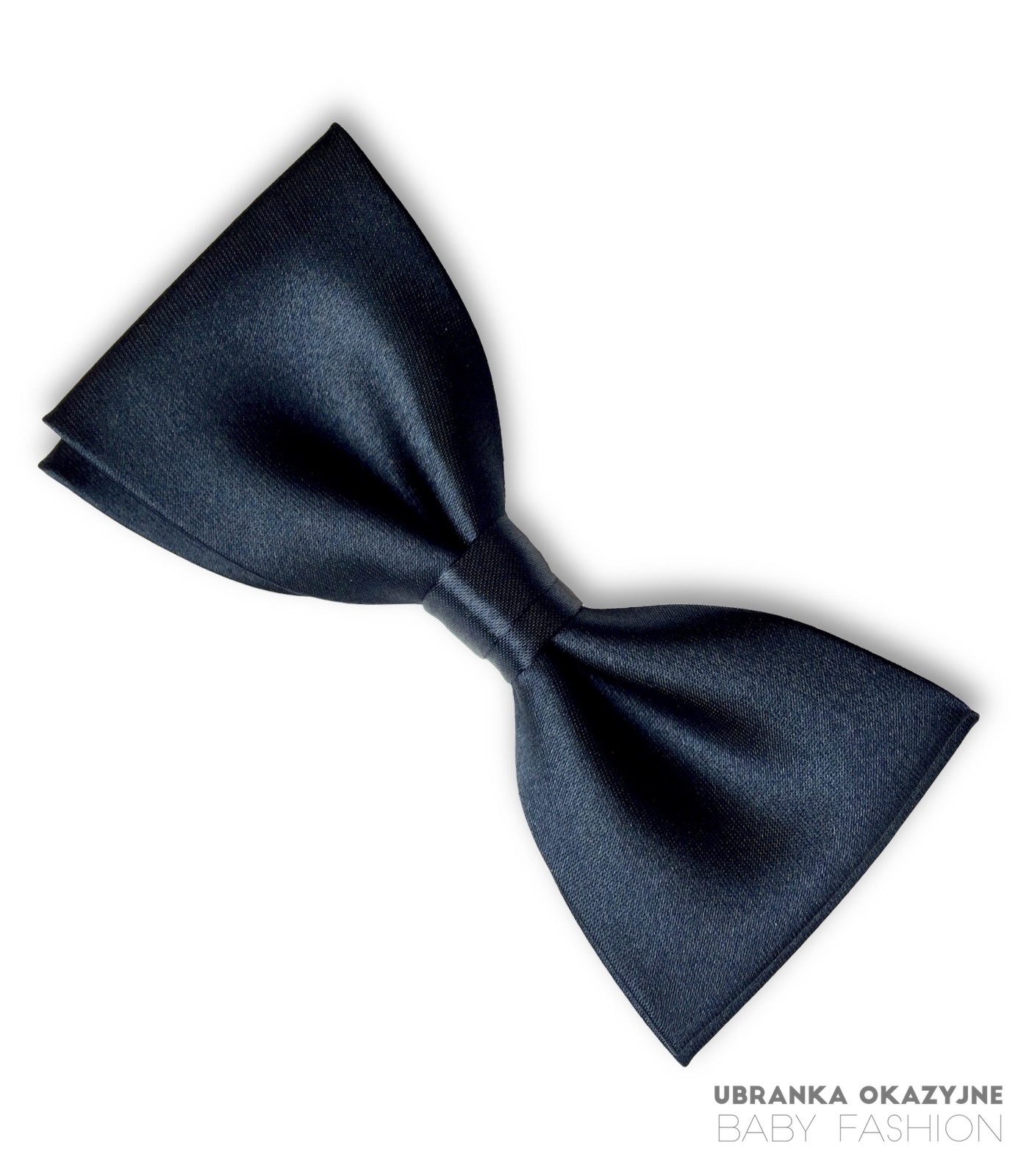 Granatowa satynowa muszka dla dziecka w wieku od 6 lat. Muszka na tasiemce z regulacją. Idealna jako dodatek do eleganckiego ubranka do komunii lub na imprezy okolicznościowe. Mucha o długości 9 cm dla dzieci od 6 lat. Uszyta z dwóch warstw tkaniny w kolorze granatowym. Polski producent.