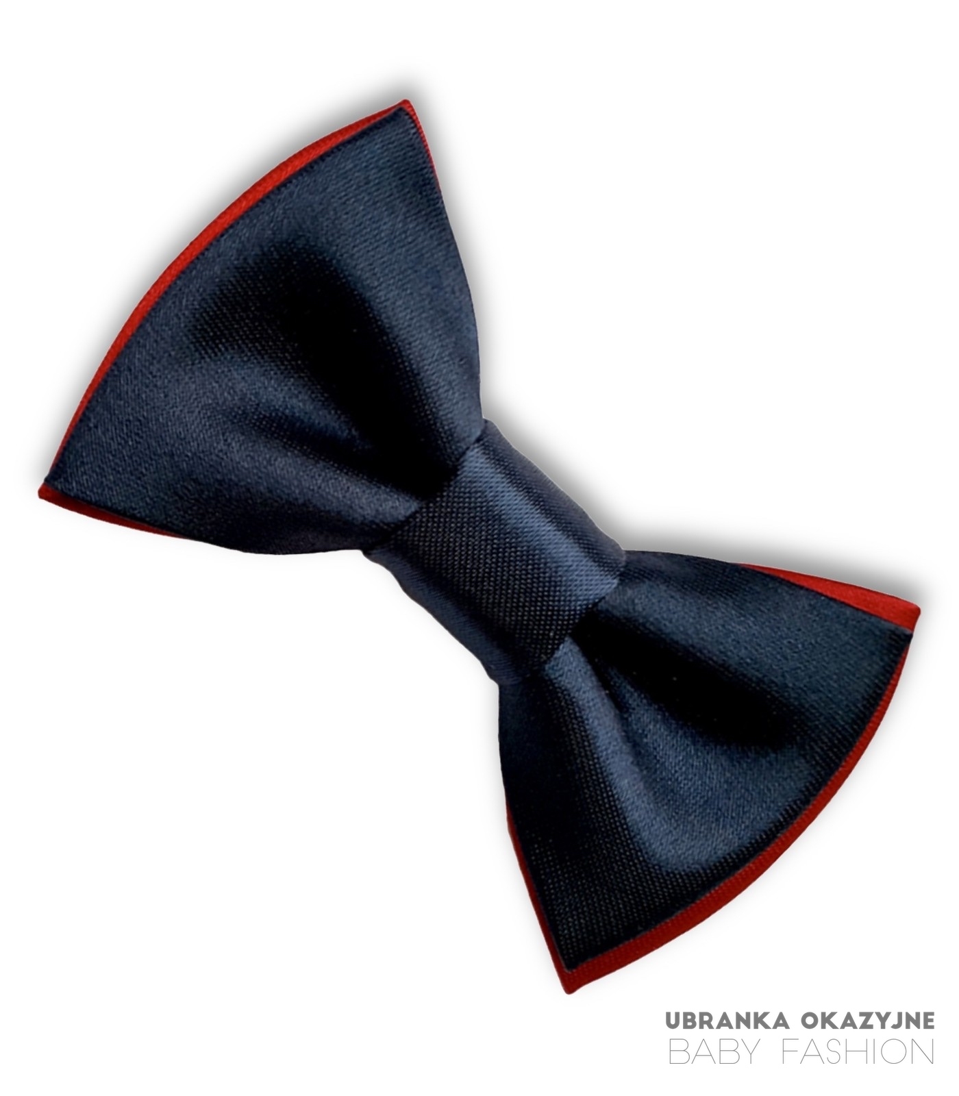 Granatowo-czerwona satynowa muszka dla niemowlaka lub małego dziecka w wieku od 0 do 3 lat. Muszka na tasiemce z regulacją. Idealna jako dodatek do eleganckiego ubranka do chrztu lub na imprezy okolicznościowe. Wyprodukowana przez polskiego producenta.