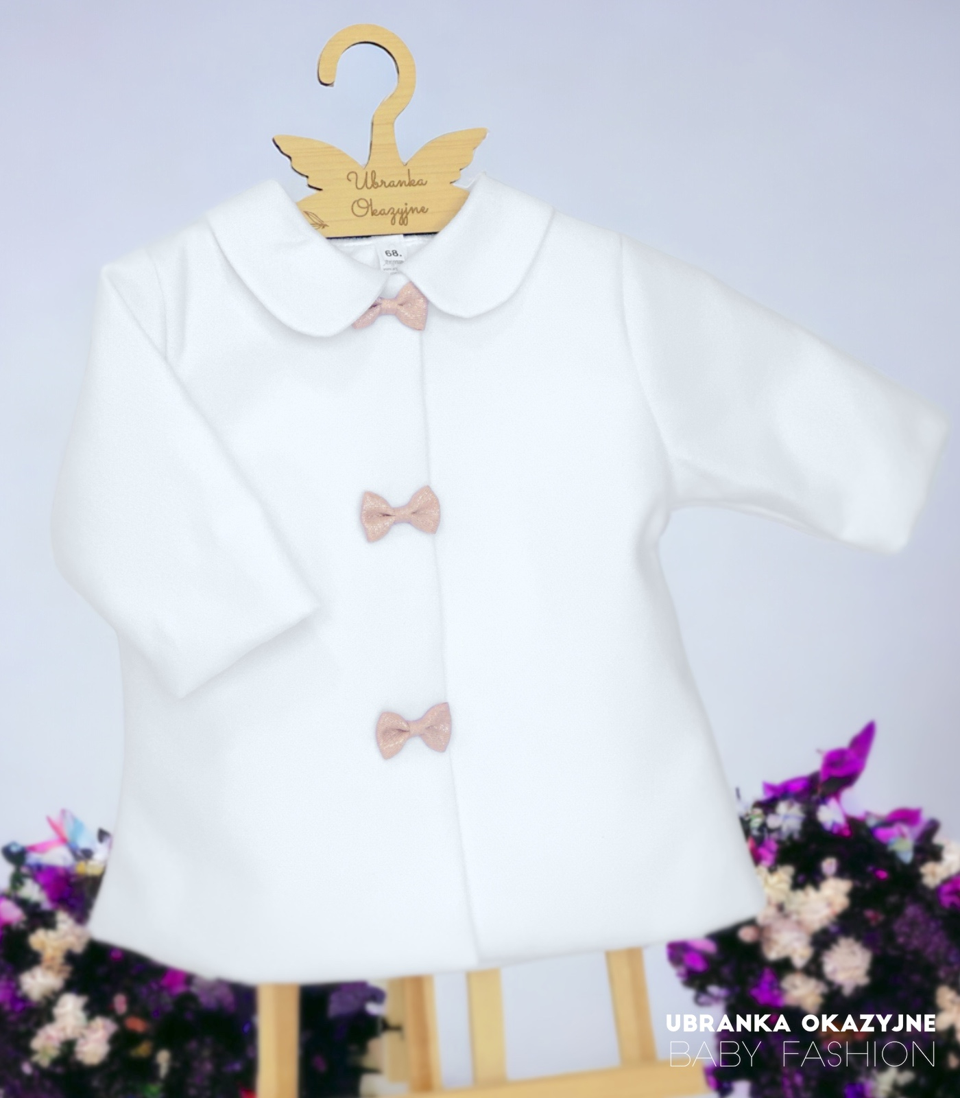 Biały płaszczyk z kołnierzykiem ozdobionym trzema pięknymi różowymi kokardkami. Wykonany z miękkiej bawełny zapewnia nie tylko wyjątkowy styl, ale także komfort dla Twojego malucha. Idealnie dopasowany krój i lekkość materiału sprawiają, że dziecko swobodnie porusza się w nim podczas uroczystości. Nasze płaszczyki są starannie wykonane przez polskiego producenta, gwarantując wysoką jakość i dbałość o każdy detal. Dostępne w szerokiej gamie rozmiarów 62 , 68 , 74 , 80. Dodaj elegancji i uroku do specjalnego dnia Twojego dziecka z tym wyjątkowym płaszczykiem, który stanie się niezapomnianym dodatkiem do jej pierwszej ceremonii chrztu.