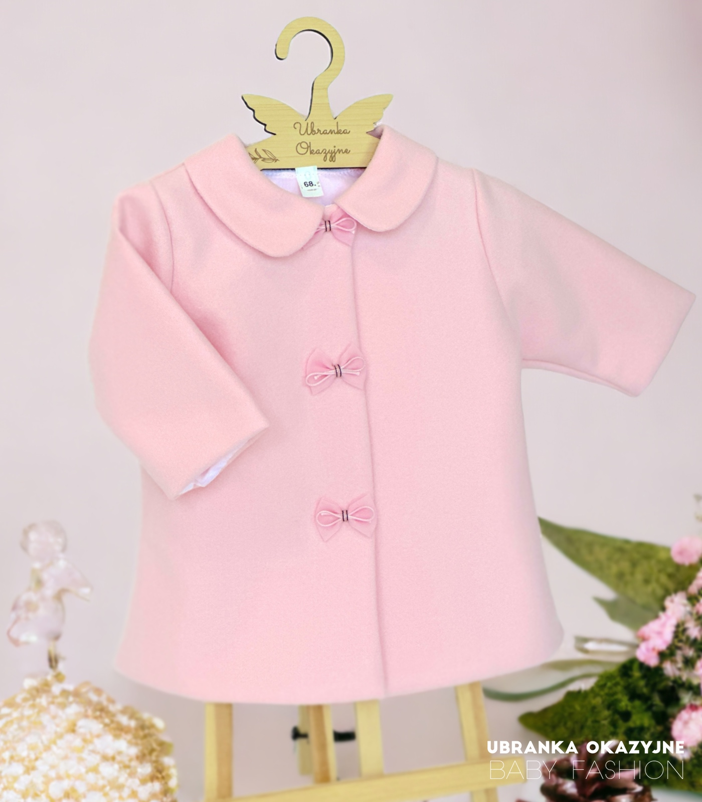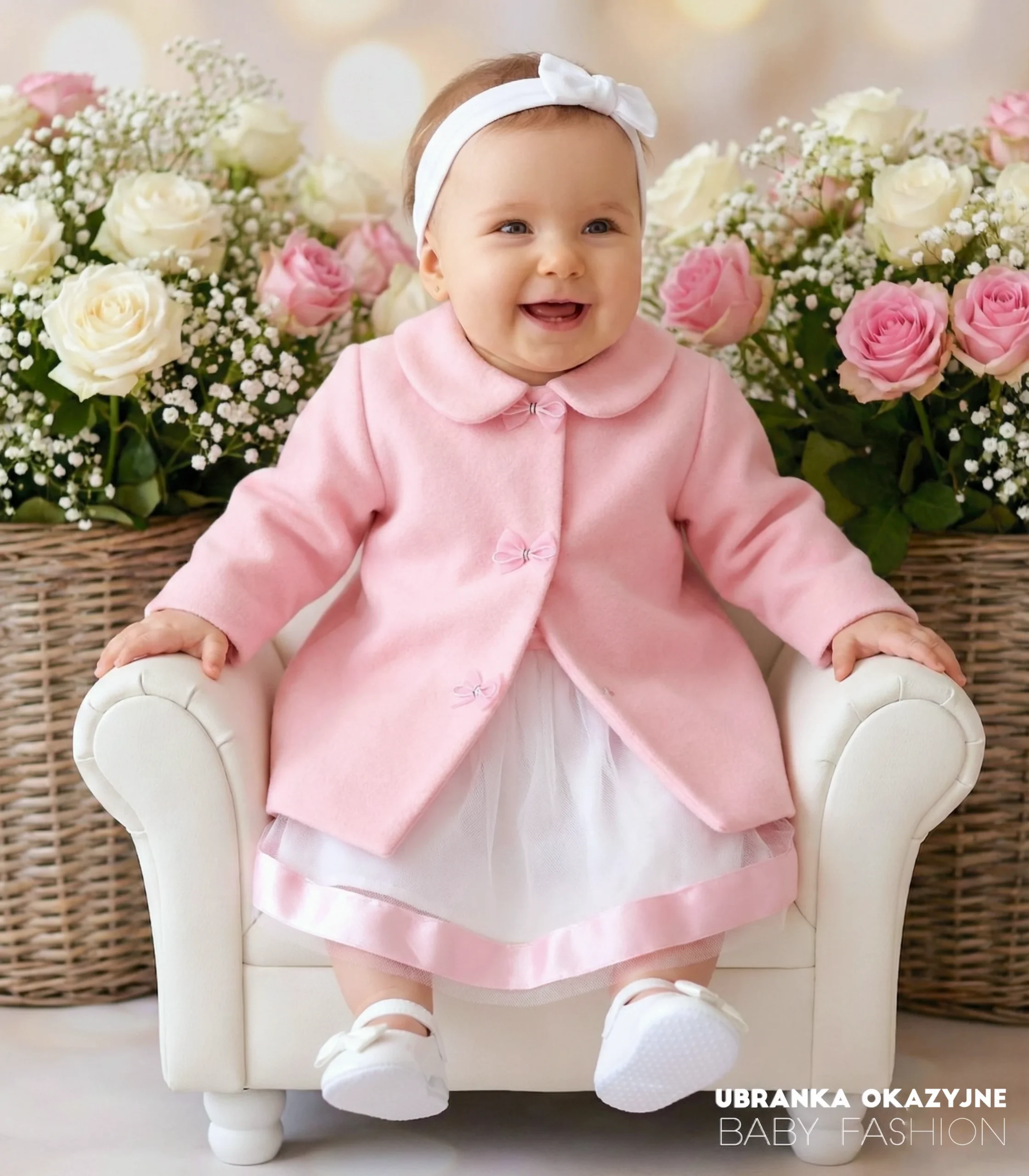 Szukasz idealnego płaszczyka do chrztu dla swojej córeczki? Nasz elegancki różowy płaszczyk z kołnierzykiem to doskonały wybór!