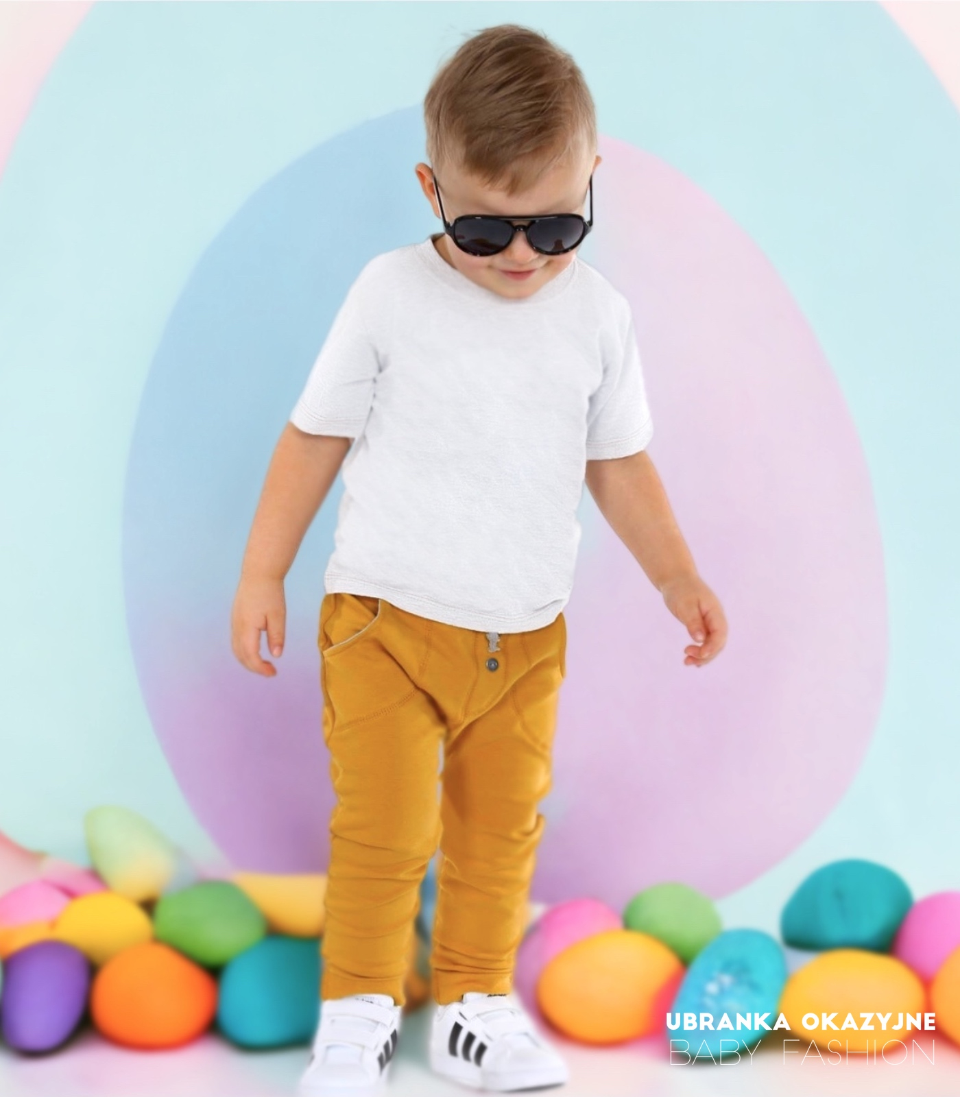 Odkryj nasze musztardowe spodnie dla chłopca z dzianiny – idealne zarówno na imprezy okolicznościowe, jak i na co dzień. Dostępne w rozmiarach 92, 98, 104, te spodnie typu buggy zapewniają wygodę i styl Twojemu maluchowi. Posiadają gumkę w pasie, szary ozdobny sznureczek oraz dwa metalowe guziczki, dodając elegancji i uroku. Wykonane z wysokiej jakości bawełny, zapewniającej komfort noszenia. Spraw, by Twoje dziecko czuło się wyjątkowo i wyglądało modnie – wybierz nasze musztardowe spodnie już dziś!