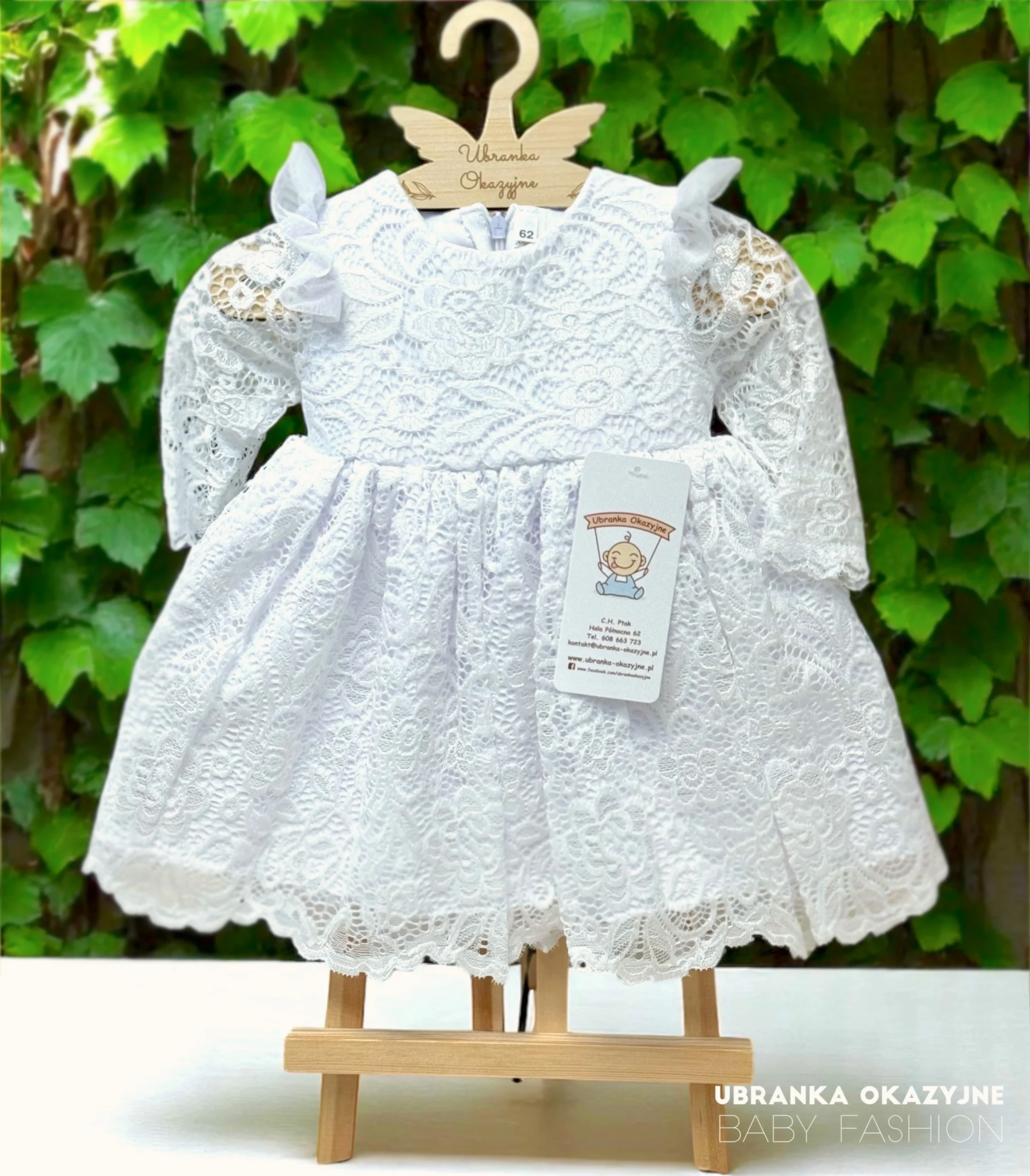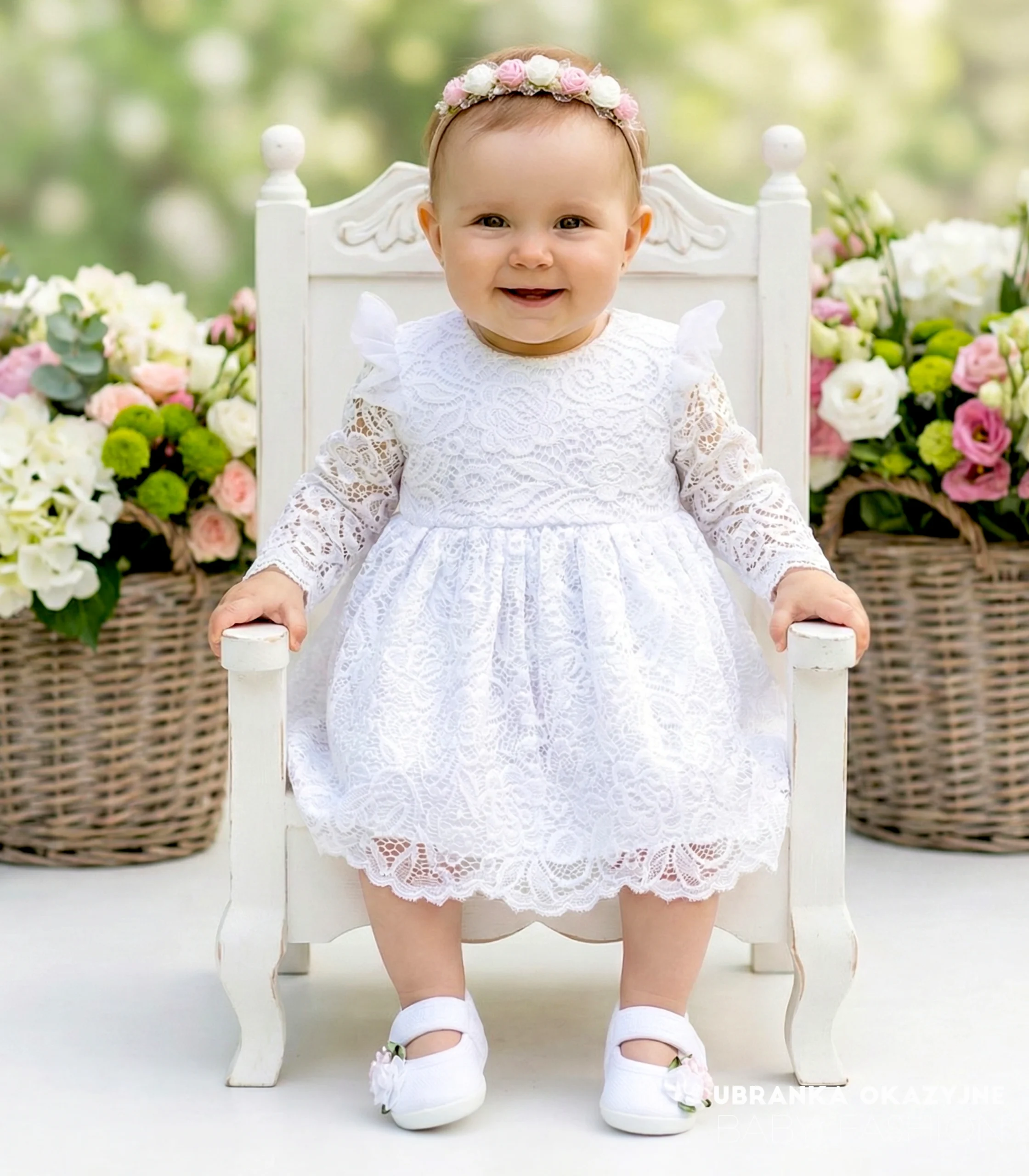 Stylowa i ponadczasowa koronkowa sukienka do chrztu dla dziewczynki w eleganckim kolorze białym. Wykonana z wysokiej jakości, miękkiej koronki. Długie rękawy i tiulowe patki na ramionach nadają sukience subtelnego uroku, a lekko rozkloszowany krój zapewnia swobodę ruchów. Sukienka sprawdzi się doskonale na chrzest, jak również inne uroczystości rodzinne, święta czy wyjątkowe sesje zdjęciowe.