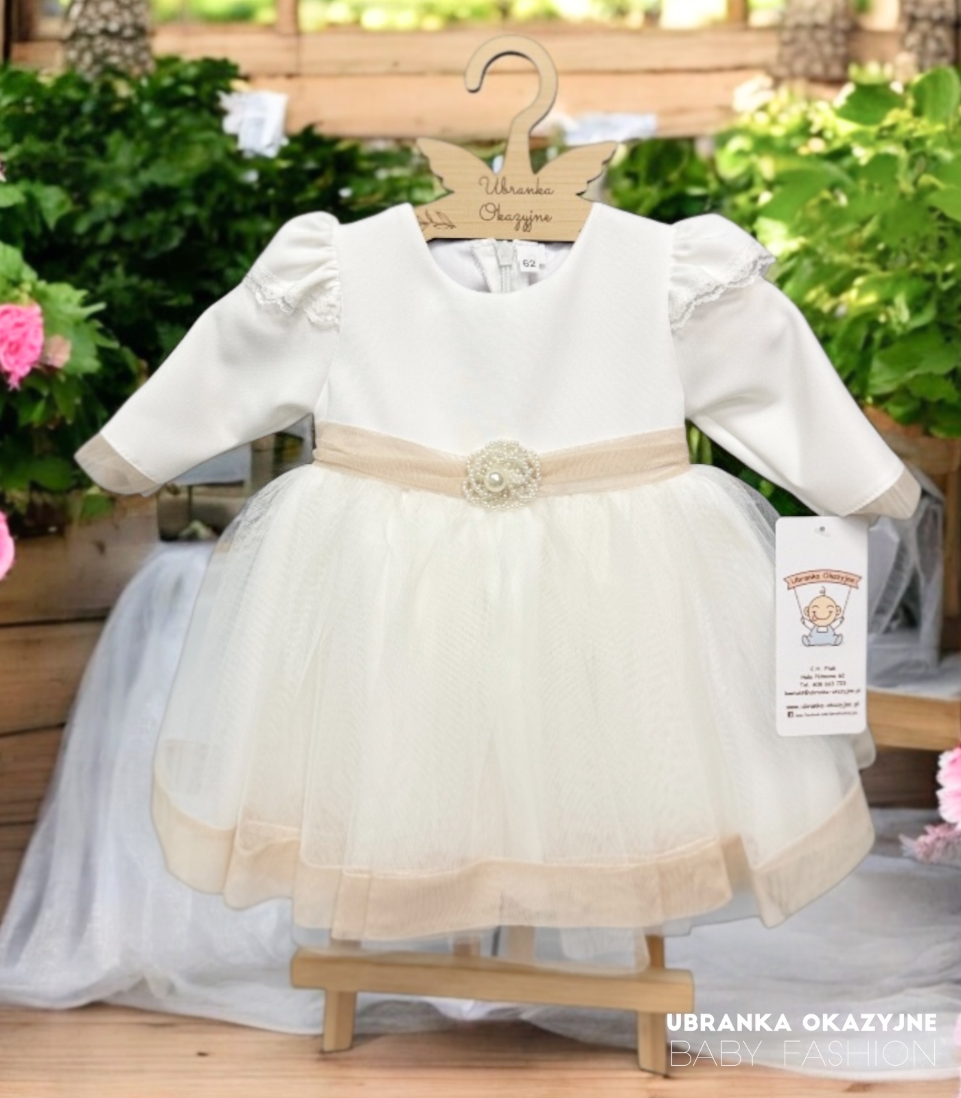 Ta przepiękna sukienka do chrztu w kolorze ecru sprawi, że Twoja mała księżniczka będzie wyglądać jak aniołek. Wykonana z delikatnego i zwiewnego tiulu, zapewni jej komfort i wygodę podczas tego ważnego dnia.