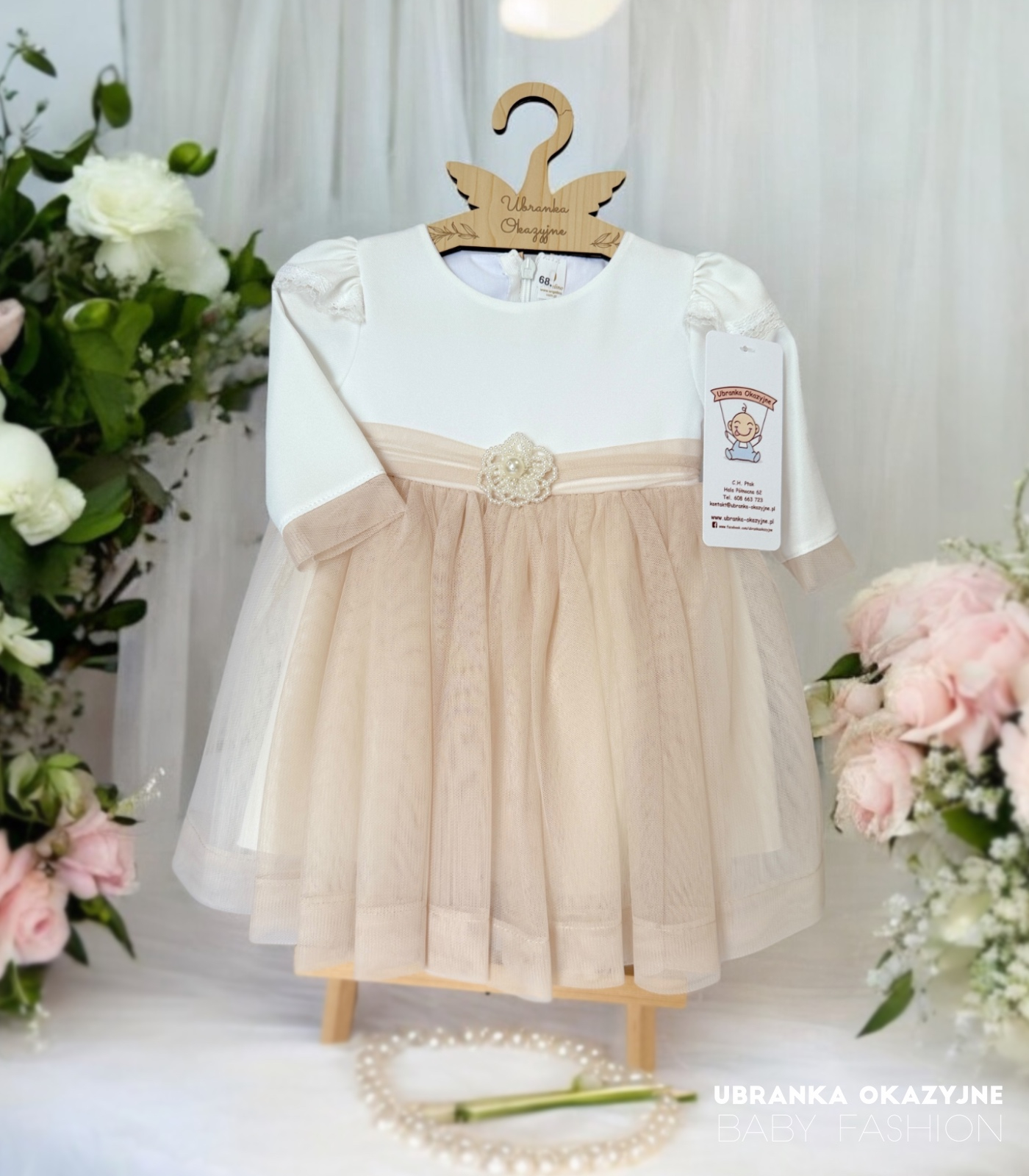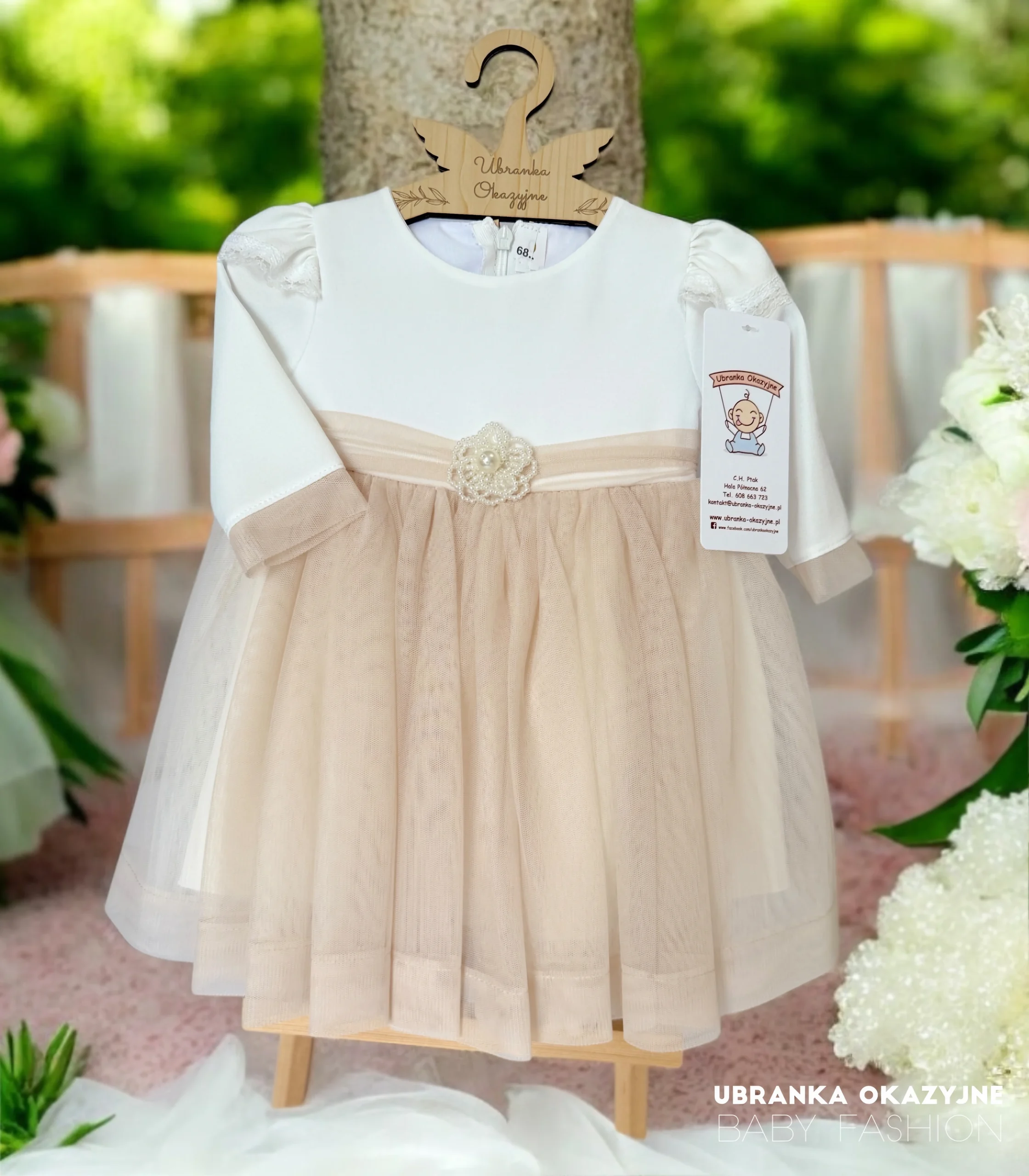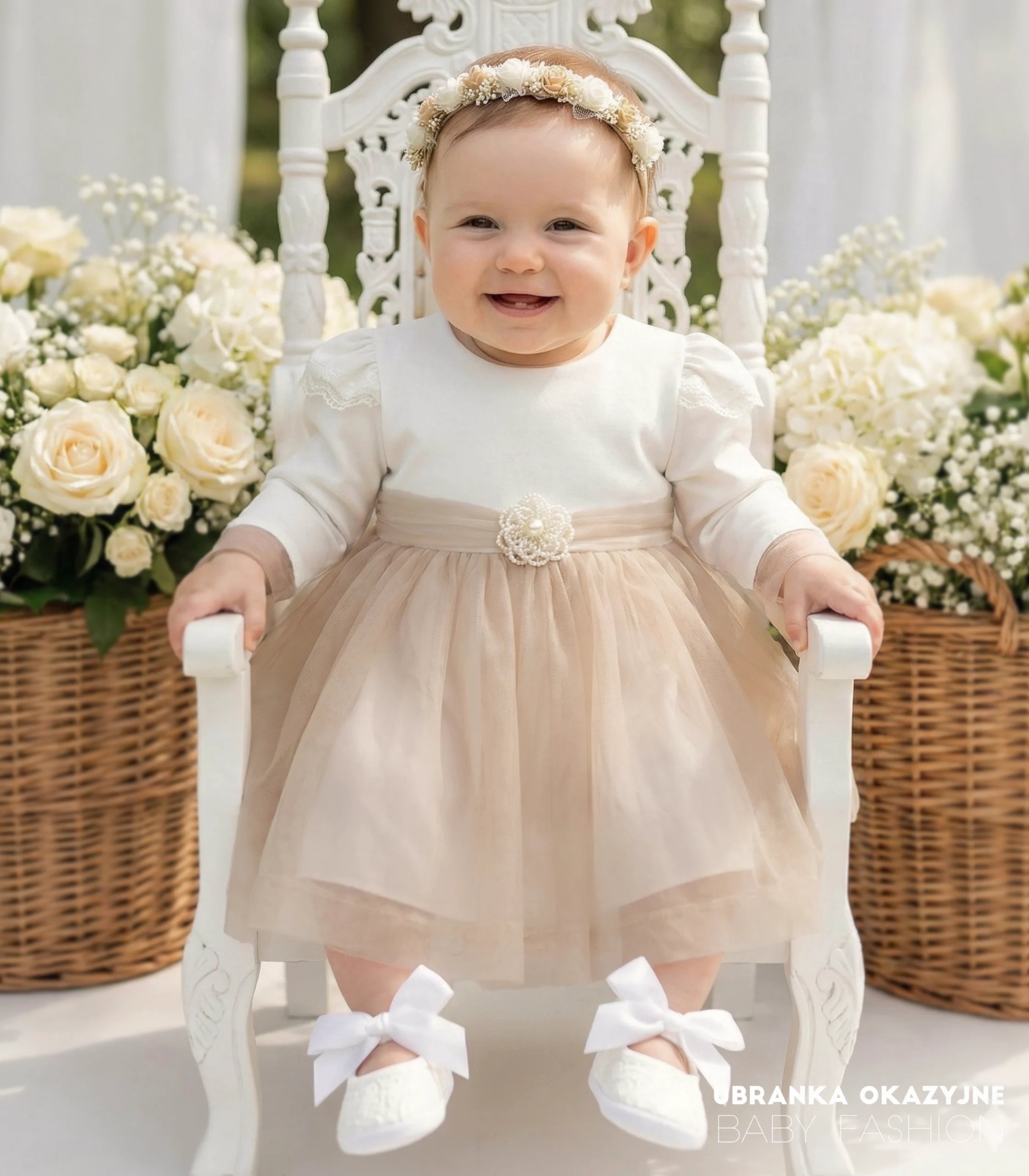 Wyjątkowa sukienka do chrztu w kolorze ecru-beżowym, która zachwyca delikatnością i elegancją. Długi rękaw zapewnia ciepło i komfort, co sprawia, że jest idealnym wyborem na specjalne okazje, takie jak chrzest. Górna część sukienki została uszyta z gładkiej i miękkiej tkaniny w kolorze ecru, co dodaje jej subtelnego uroku. Dolna część, wykonana z beżowego tiulu, zapewnia lekkość oraz swobodę ruchów, a w pasie zdobi ją perłowy kwiatuszek. Sukienka dostępna jest w rozmiarach 62, 68 , 74 i 80, co pozwala na doskonałe dopasowanie dla każdej małej księżniczki. Produkt pochodzi od renomowanego polskiego producenta, co gwarantuje wysoką jakość i dbałość o detale. Uczyń ten wyjątkowy dzień jeszcze piękniejszym dzięki naszej unikalnej sukience do chrztu.