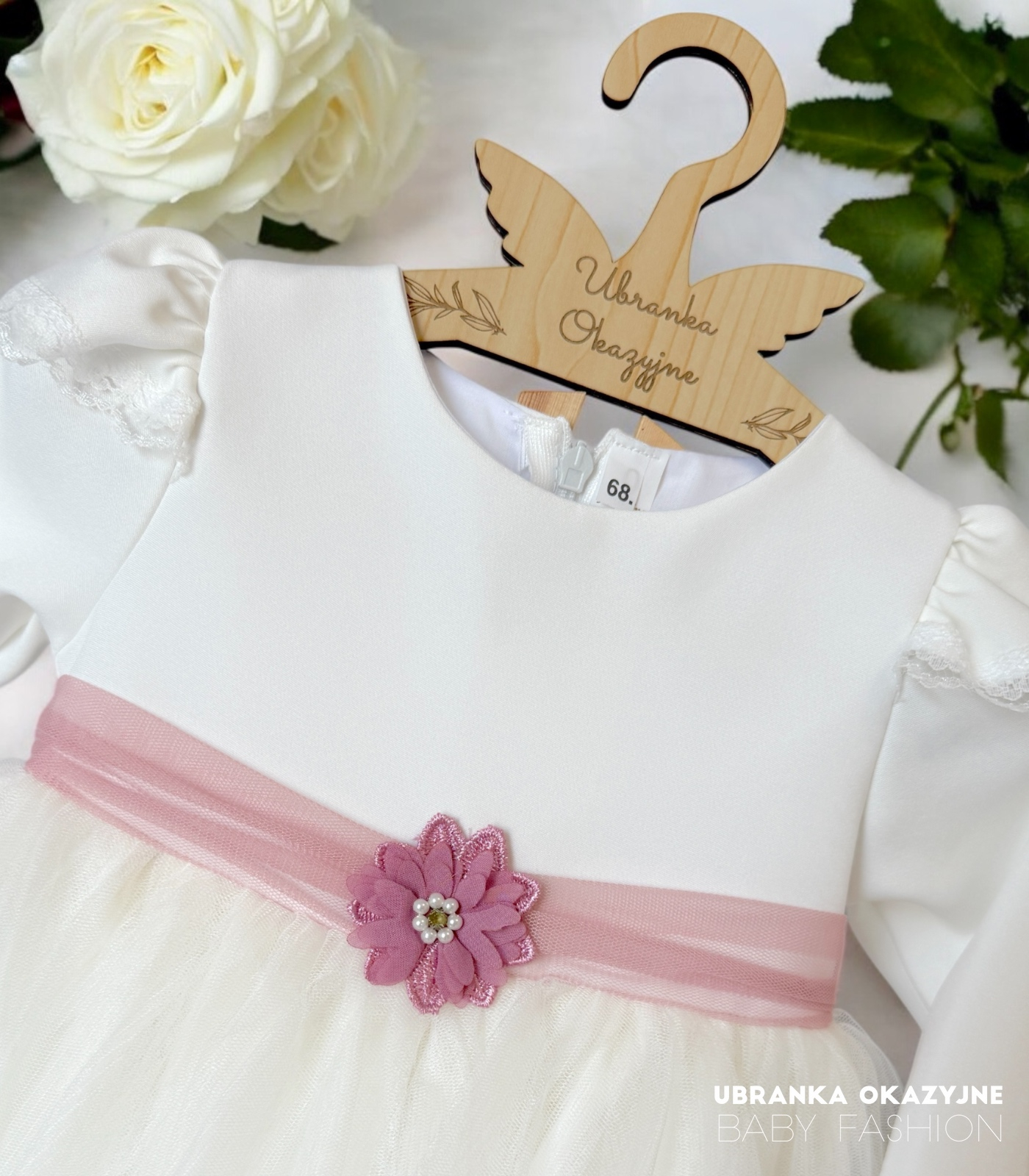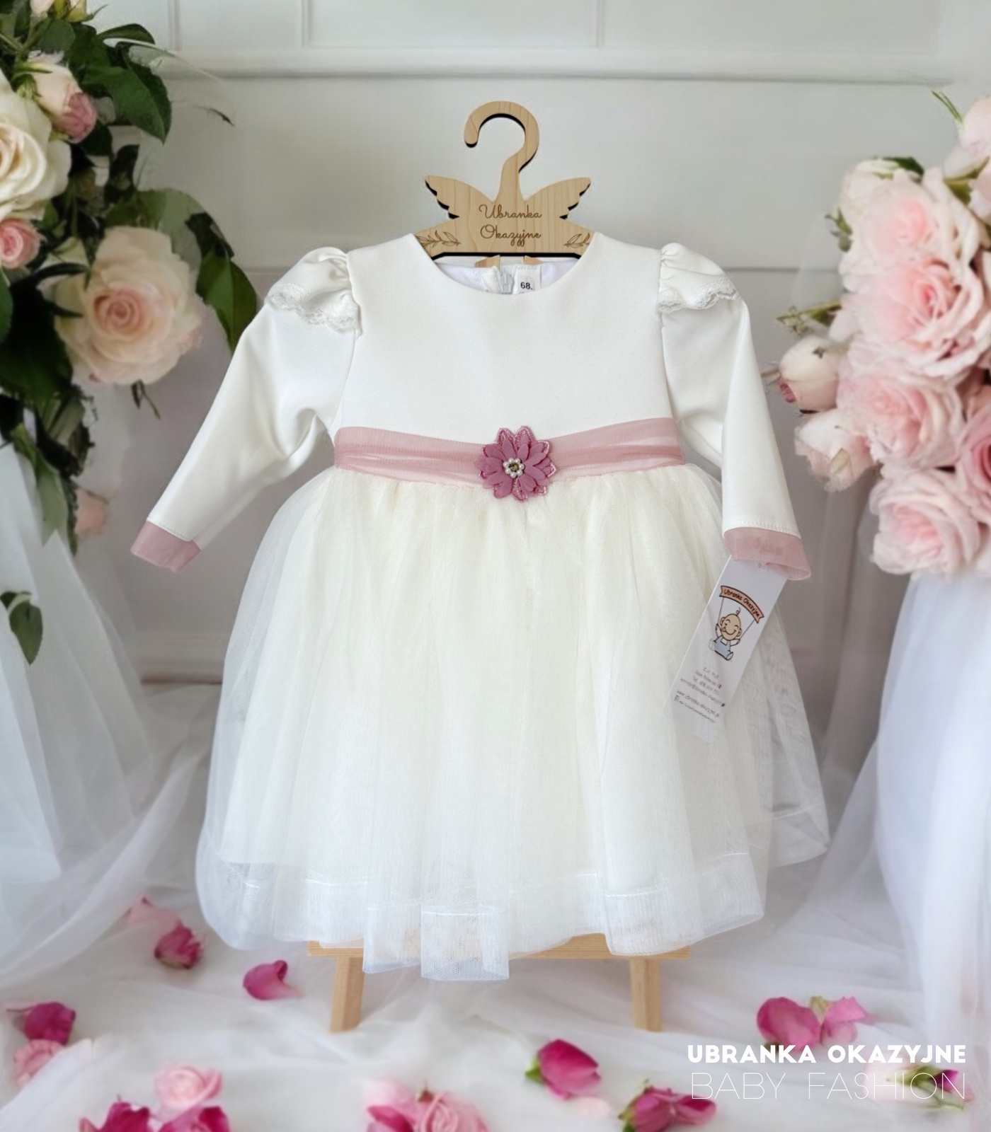 Wyjątkowa sukienka na chrzest to połączenie elegancji i delikatności. Ta niezwykła sukienka w kolorze ecru to idealny wybór na chrzest dla Twojej małej księżniczki. Delikatność i elegancja to jej główne cechy, które podkreślają wyjątkowość tego dnia. Długi rękaw zapewnia ciepło i wygodę, a gładka i miękka tkanina górnej części nadaje sukience subtelnego uroku. Dolna część sukienki wykonana z miękkiego tiulu gwarantuje lekkość i swobodę ruchów. Ozdobny pasek z kwiatkiem w kolorze fioletowym dodaje uroku i podkreśla talię. Sukienka dostępna jest w rozmiarach 62, 68 , 74 i 80, co pozwala na idealne dopasowanie dla każdej małej księżniczki. Produkt pochodzi od renomowanego polskiego producenta, co gwarantuje wysoką jakość i dbałość o detale. Uczyń ten wyjątkowy dzień jeszcze piękniejszym dzięki naszej niepowtarzalnej sukience na chrzest!