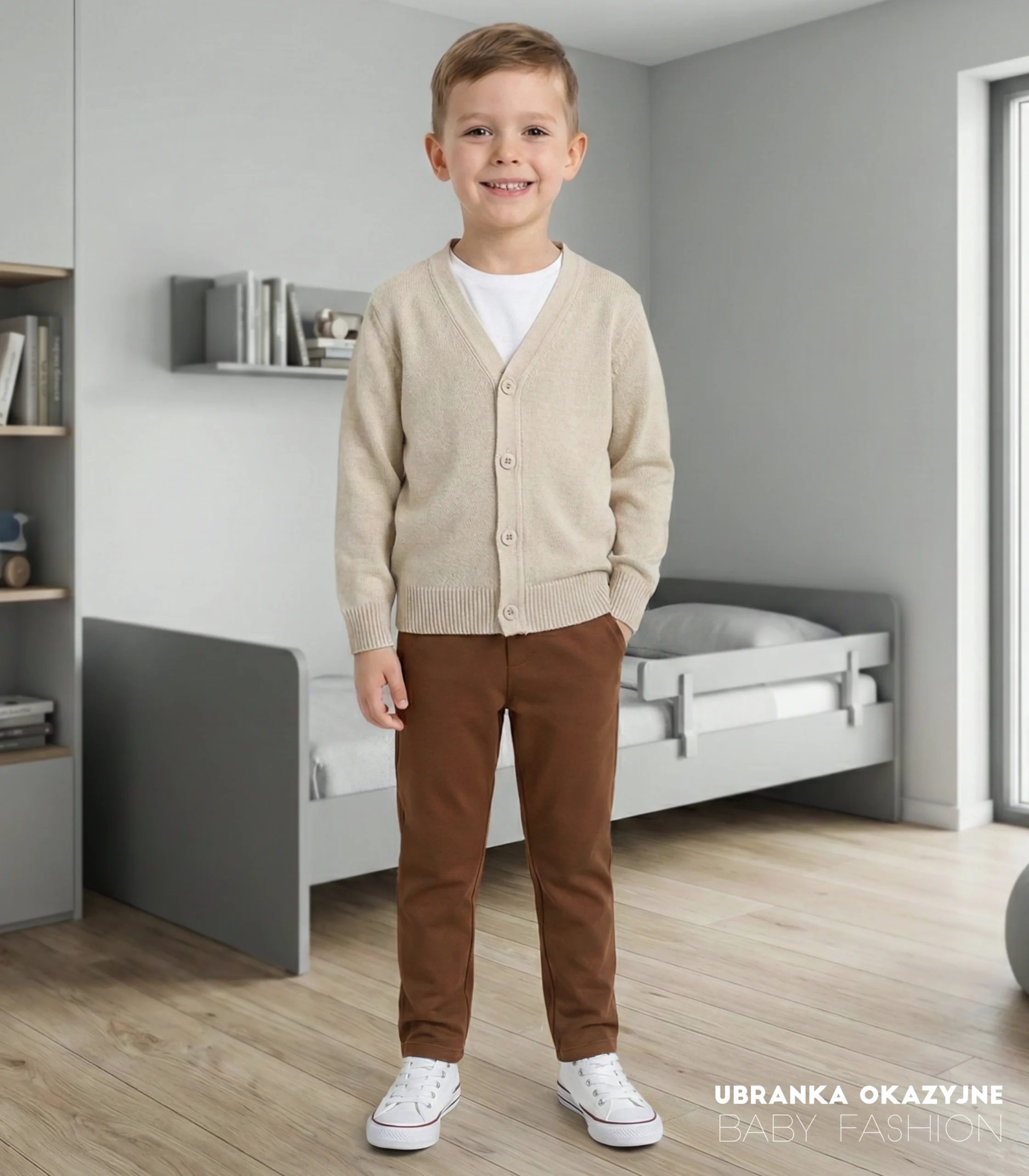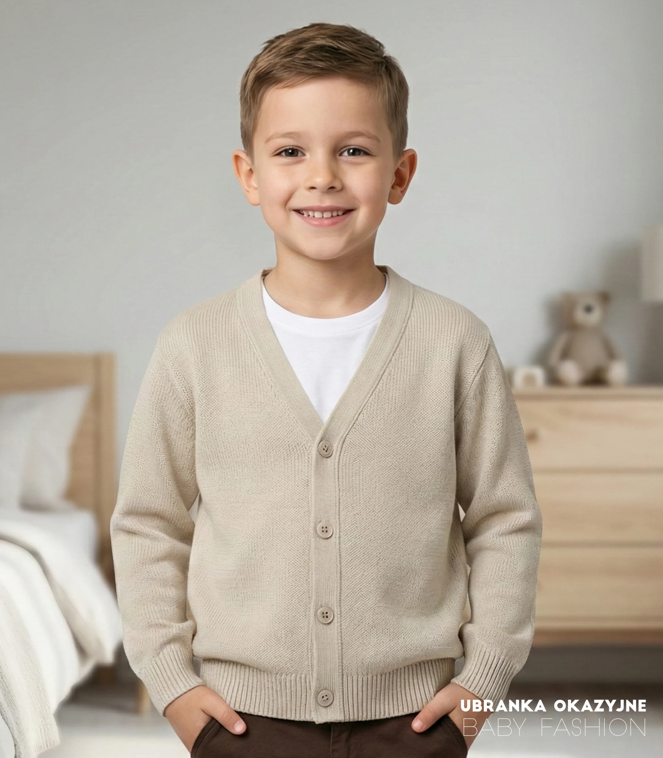 Przytulny i miękki sweterek dla chłopca. Podaruj swojemu chłopcu styl i komfort z naszym uroczym sweterkiem w kolorze beżowym. Wykonany z najwyższej jakości dzianiny, ten sweterek jest niezwykle miękki i delikatny. Sweterek jest dostępny w szerokiej gamie rozmiarów: 92, 98, 104, 110, 116, 122 dzięki czemu bez problemu znajdziesz idealny rozmiar dla swojego dziecka. Nasz sweterek został wyprodukowany w Polsce z dbałością o każdy szczegół. Dzięki temu masz pewność, że otrzymujesz produkt najwyższej jakości, który posłuży Twojemu dziecku przez długi czas.