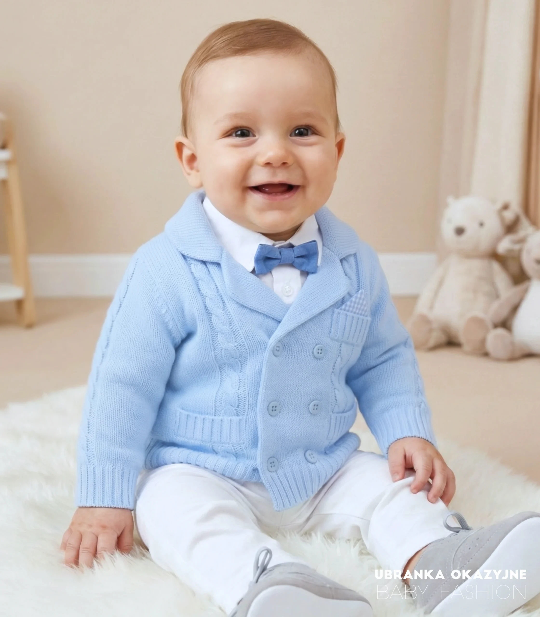 Sweterek akrylowy dla małego dziecka w kolorze błękitnym zapinany na błękitne guziczki. Doskonały wybór na wyjątkowe okazje taki jak np. dodatek do ubranka do chrztu. Wyprodukowany w Polsce z najwyższej jakości akrylu, gwarantuje komfort i trwałość. Spraw, aby Twój maluch błyszczał na imprezach okolicznościowych w tym stylowym sweterku. Dostępny w rozmiarach 62 , 68 , 74 , 80 , 86.