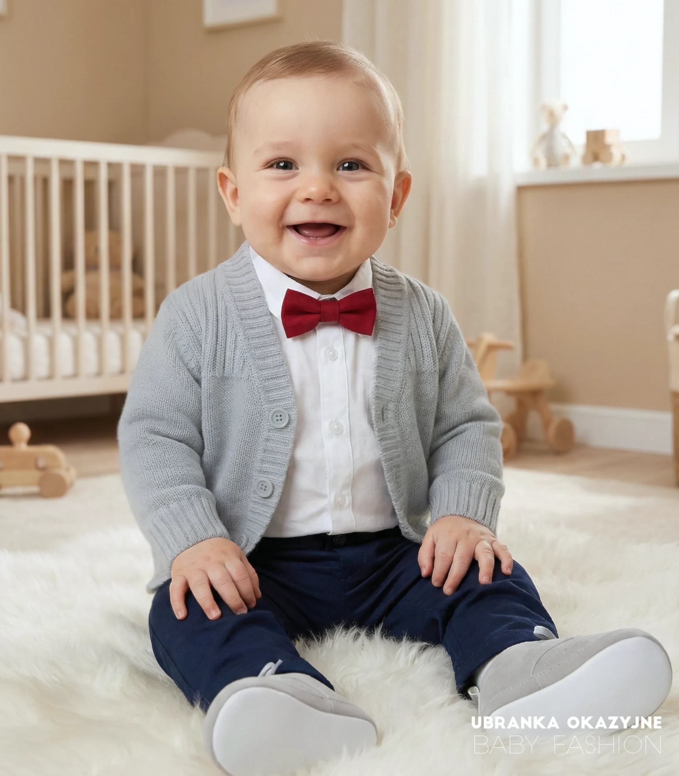Szary kolor i estetyczne guziczki dodają sweterkowi elegancji. Sprawdzi się on idealnie na uroczyste okazje, takie jak Chrzest czy pierwsze urodziny.