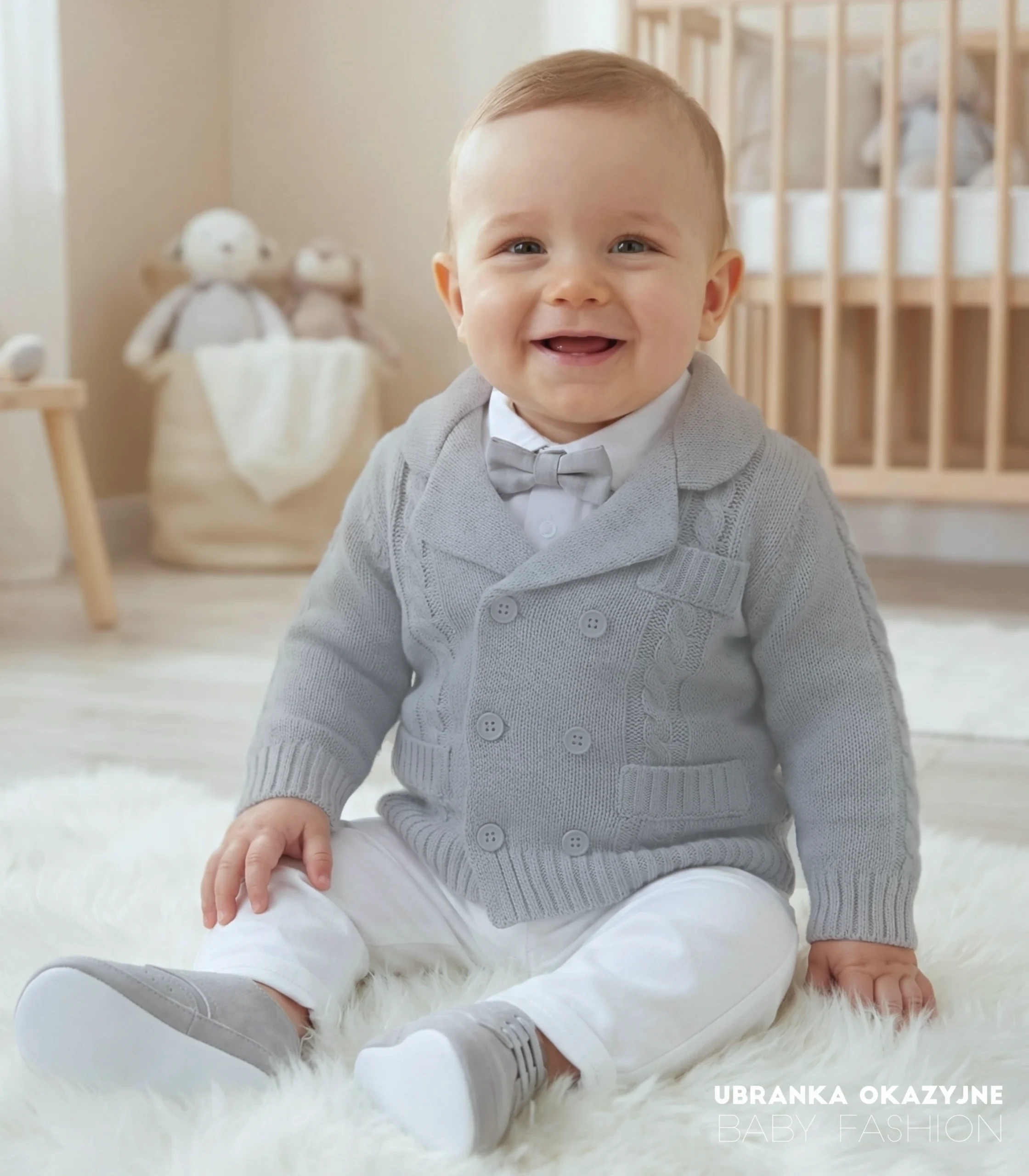 Sweterek akrylowy dla małego dziecka w kolorze szarym zapinany na szare guziczki. Doskonały wybór na wyjątkowe okazje taki jak np. dodatek do ubranka do chrztu. Wyprodukowany w Polsce z najwyższej jakości akrylu, gwarantuje komfort i trwałość. Spraw, aby Twój maluch błyszczał na imprezach okolicznościowych w tym stylowym sweterku. Dostępny w rozmiarach 62 , 68 , 74 , 80 , 86.