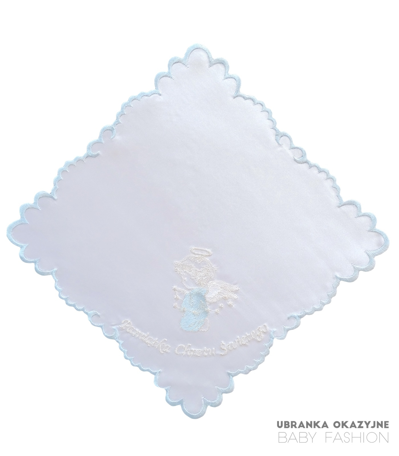 Zdobienia: Haftowany aniołek (niebiesko-srebrny), napis okolicznościowy.