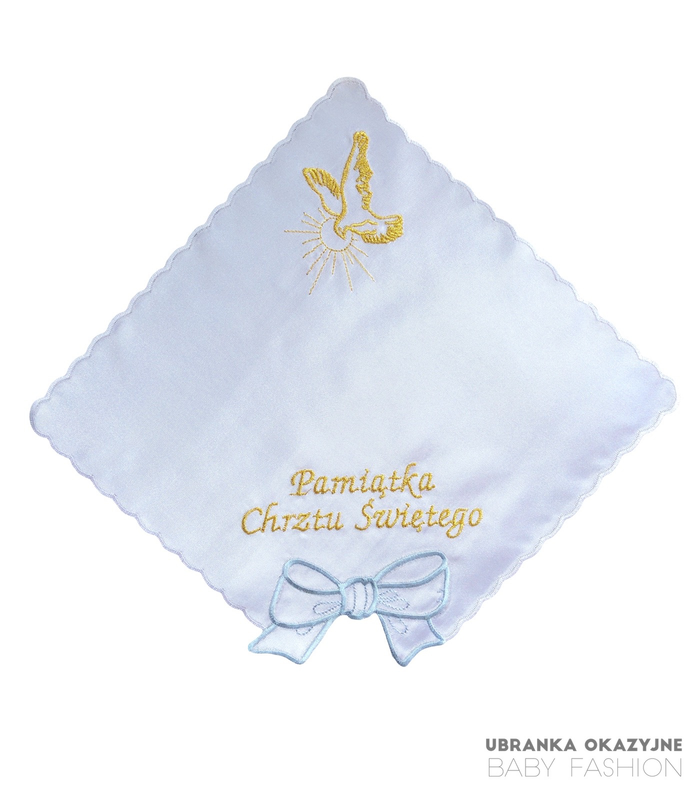 Elegancka, atłasowa szatka do chrztu, będąca nieodzownym elementem ceremonii i piękną pamiątką na całe życie. Wyróżnia się starannym wykonaniem: ozdobiona jest haftem złotego gołąbka symbolizującego Ducha Świętego oraz uroczą, błękitną kokardką, idealną dla chłopca. Brzegi materiału wykończono dekoracyjnym obszyciem białą nicią.