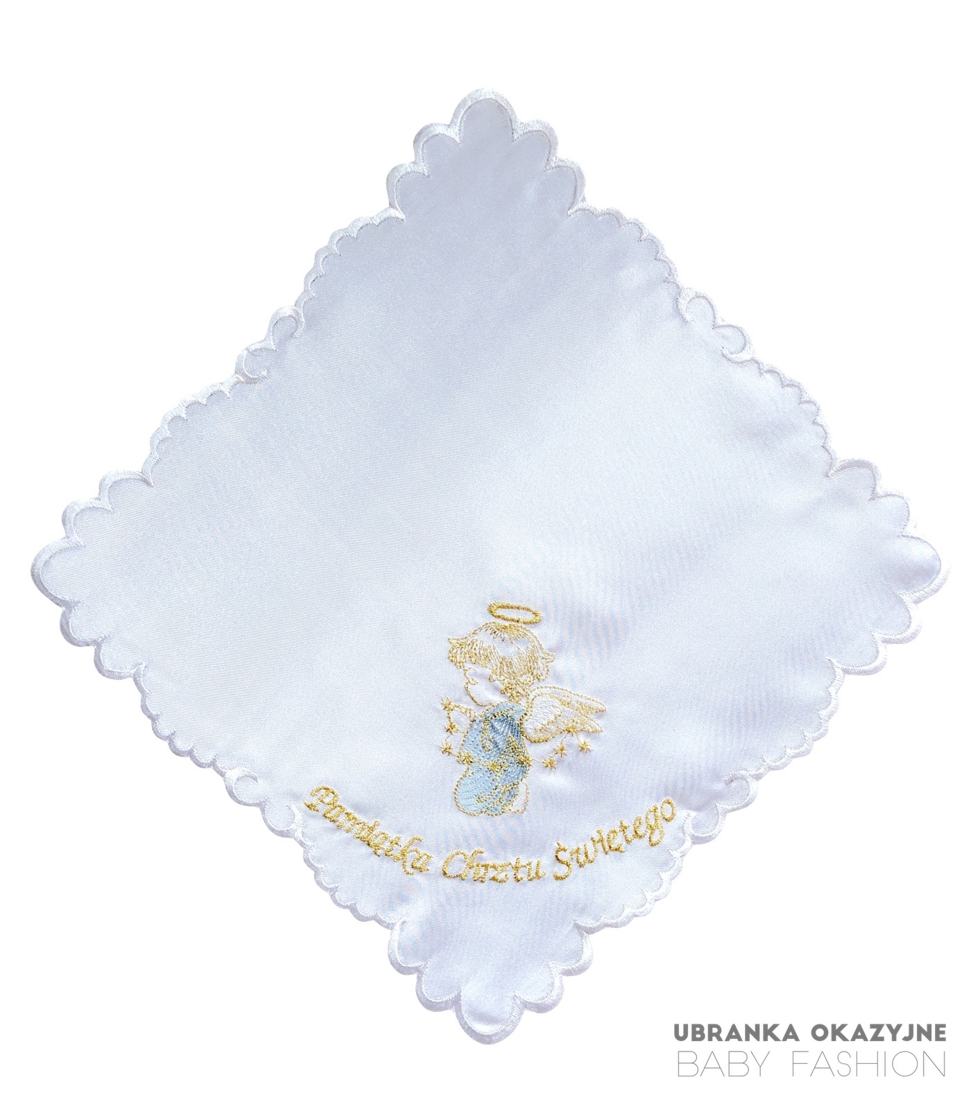 Uczcij moment Chrztu Świętego wyjątkową pamiątką. Ta elegancka szatka została uszyta z wysokiej jakości atłasu i starannie wykończona ozdobnym obszyciem białą nicią. Jej centralnym punktem jest piękny, haftowany aniołek w kolorze niebiesko-złotym oraz napis „Pamiątka Chrztu Świętego”.