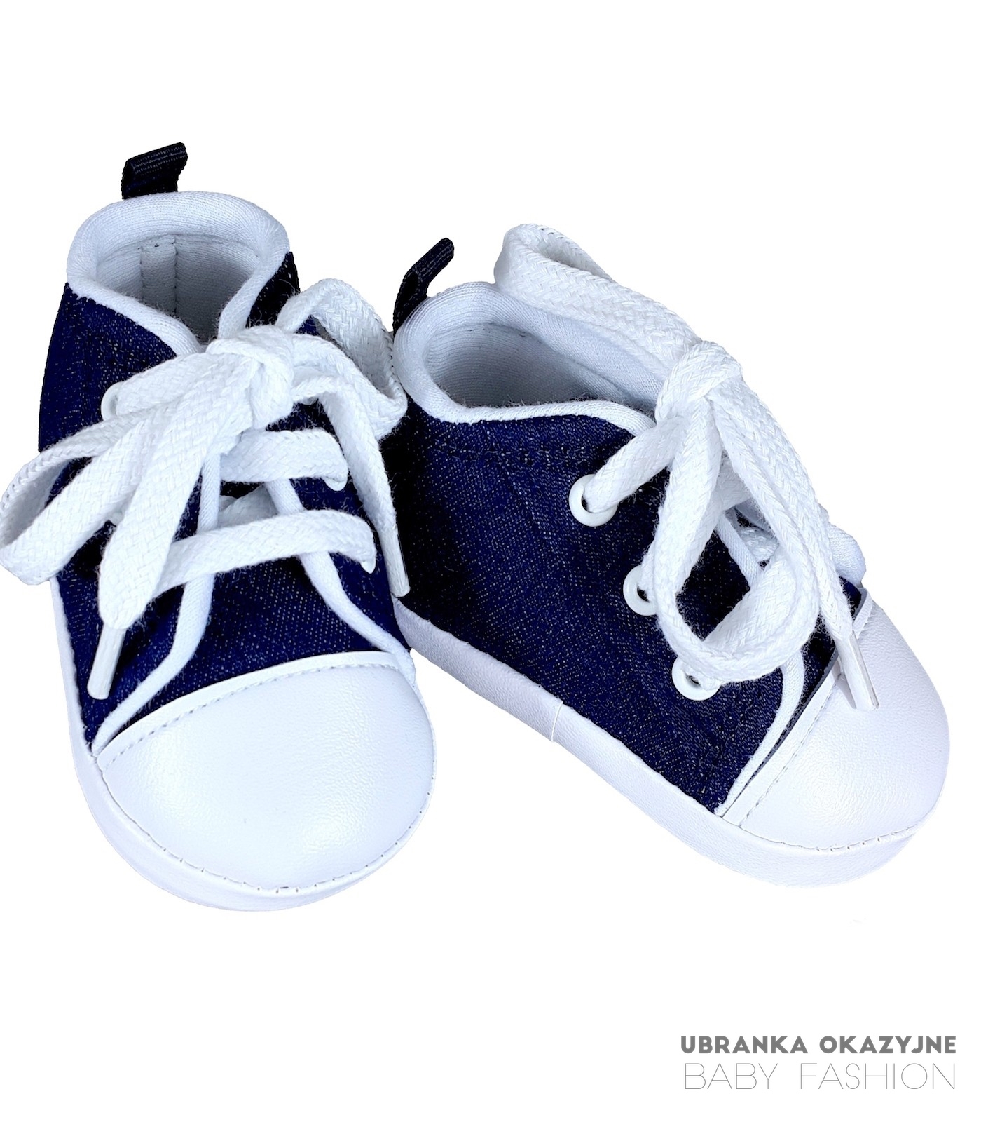 Czadowe trampki niechodki dla niemowlaków w kolorze granatowym, wiązane na białe sznurówki. Buciki są bardzo dobrej jakości zostały w Polsce, podeszwa i czubek został obszyty mięciutką , białą eko-skórką. Wnętrze bucika zostało wykonane z mięciutkiej białej bawełny. Trampeczki są miękkie i elastyczne, dobrze leżą na stópce maluszka – a dzięki sznurówkom możemy wyregulować je na stópce, aby były wygodne i nie spadały. Buciki idealnie sprawdzą się jako dodatek do stroju codziennego jak i wizytowego.
